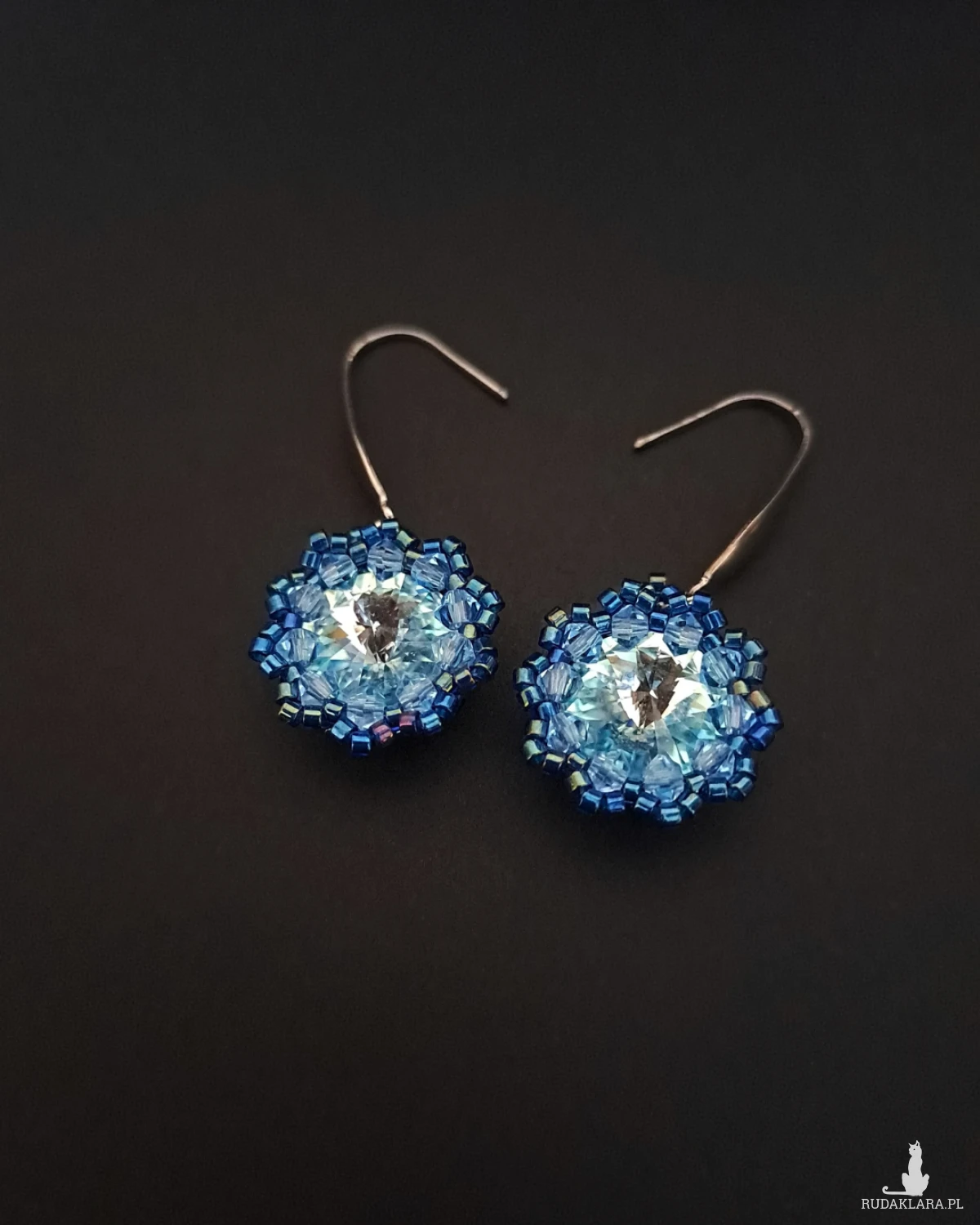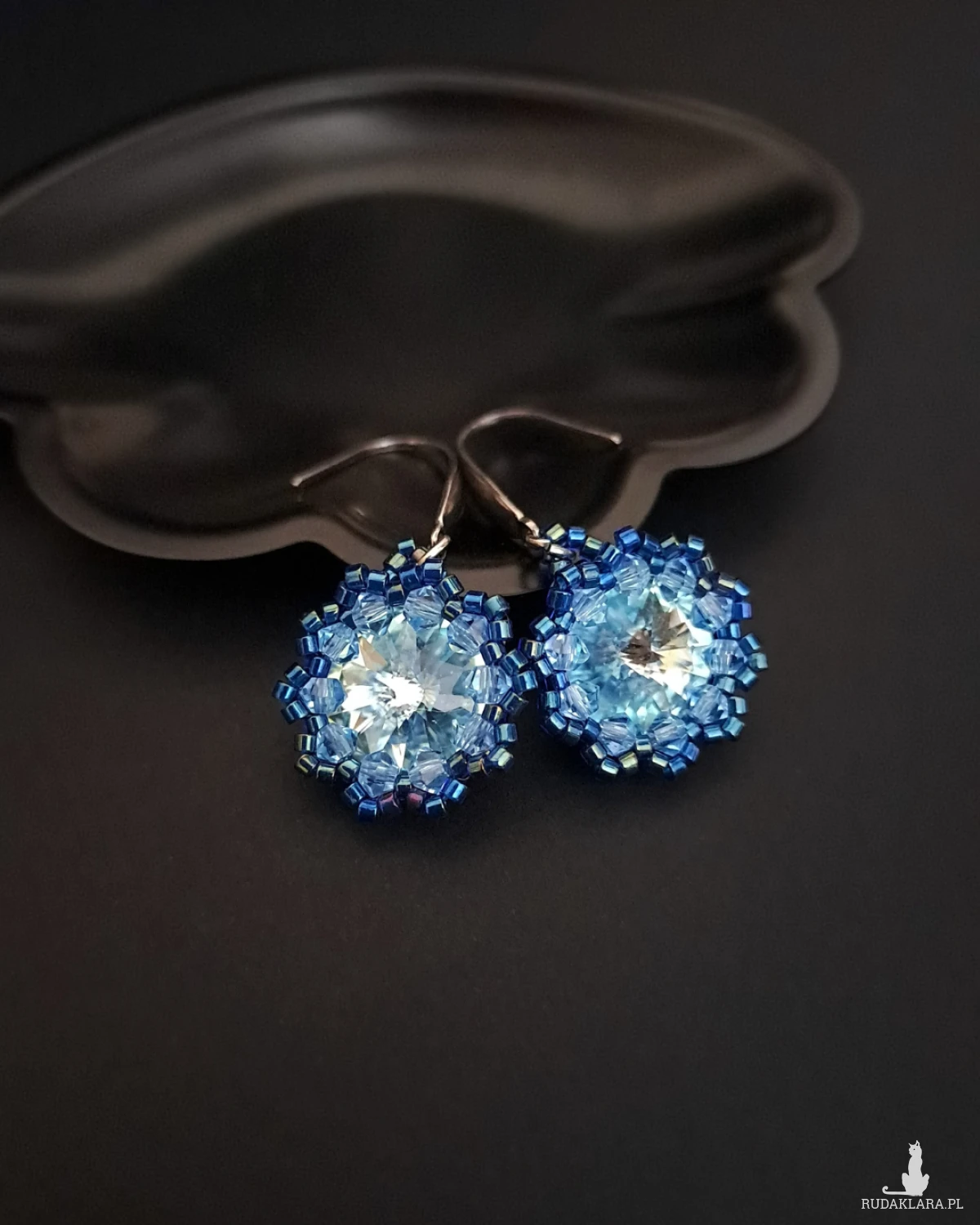 Kolczyki Aqua Bohemica to nie tylko ozdoba – to dzieło stworzone z pasji i cierpliwości. Centralny kamień Preciosa Rivoli Maxima w odcieniu aqua, otulony precyzyjnie dobranymi niebieskimi kryształkami Bicone i koralikami Miyuki, tworzy harmonijną kompozycję błękitu i światła. Całość zwieńczona jest biglami ze stali nierdzewnej, które zapewniają trwałość i komfort. Z długością 4 cm są lekkie, a jednocześnie przyciągające uwagę – nosząc je, czujesz się spokojna, piękna i gotowa na wszystko.