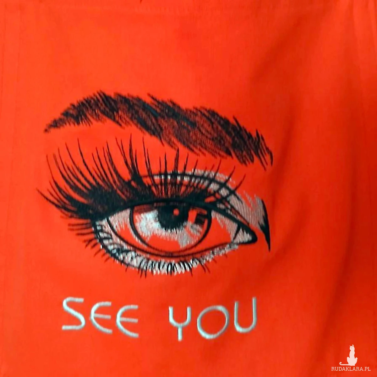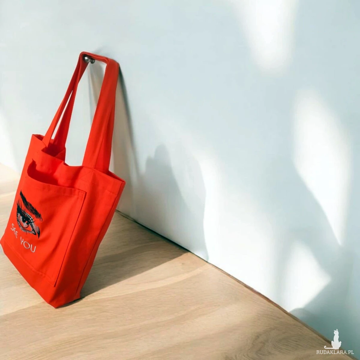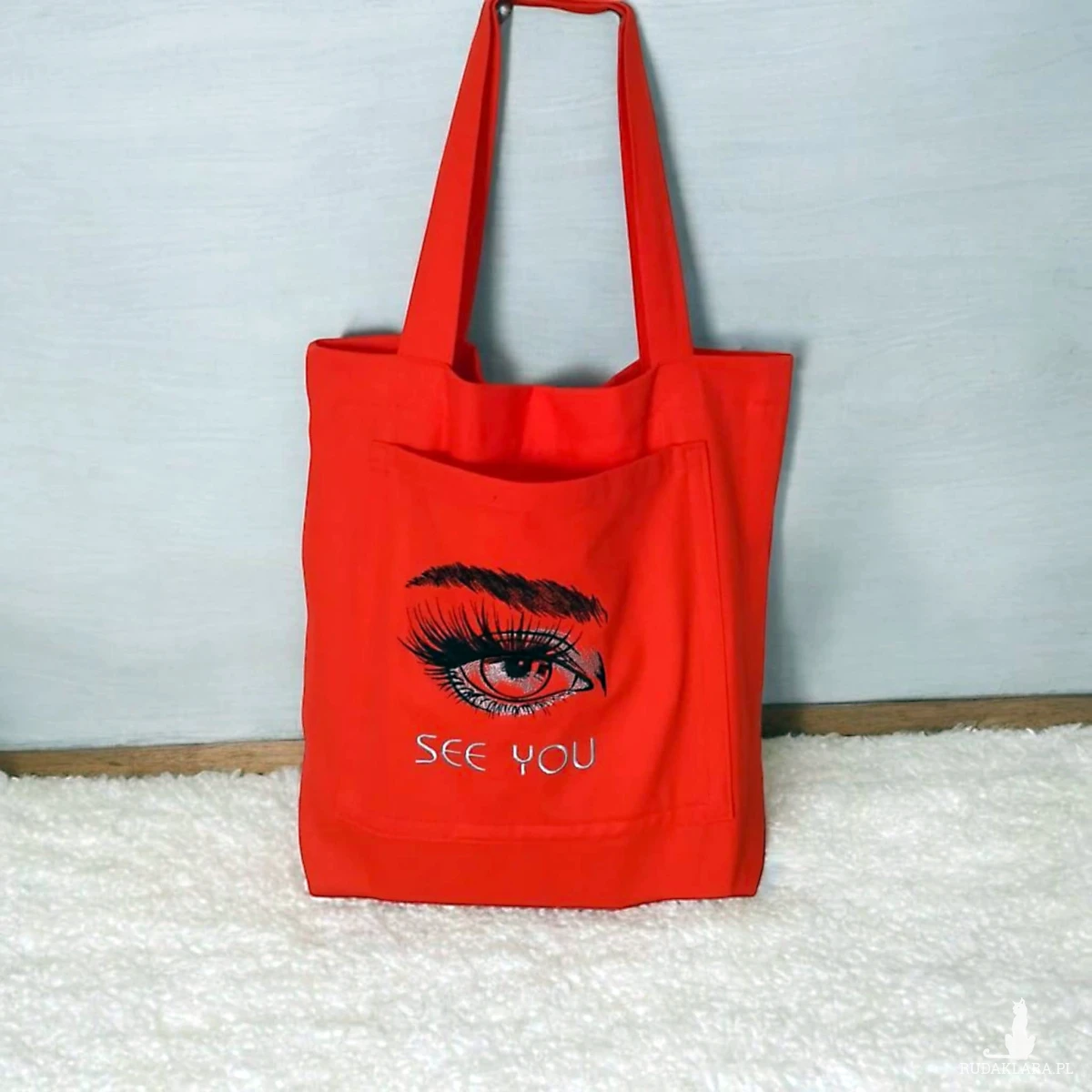 Przód torby z dużą kieszenią ozdobioną haftem. Kolor torby - pomarańczowy. Dno torby poszerzone - tak aby mogła pomieścić wszystkie niezbędne drobiazgi i "przydasie".
