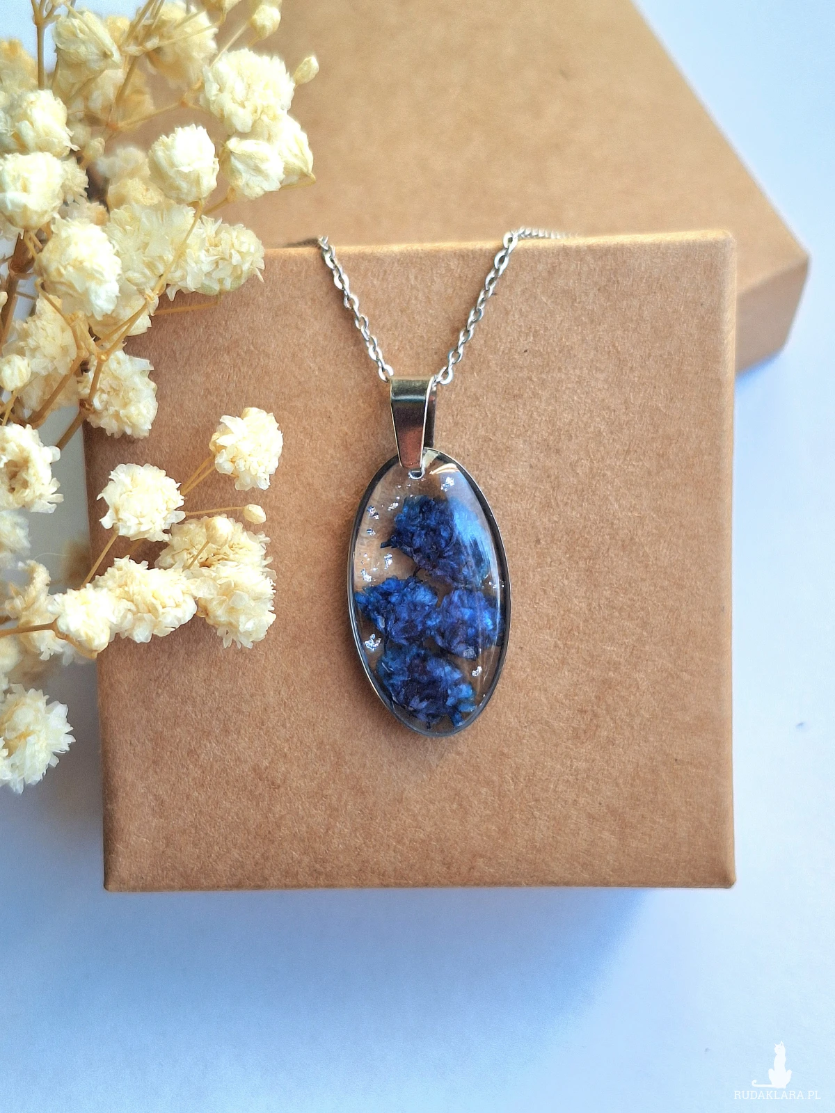 Uroczy wisiorek z zatopionymi kwiatami granatowej gipsówki i płatkami srebra. Wykonana z wysokiej klasy żywicy, która nie zmienia koloru pod wpływem promieniowania uv oraz wysokiej jakości stali chirurgicznej.