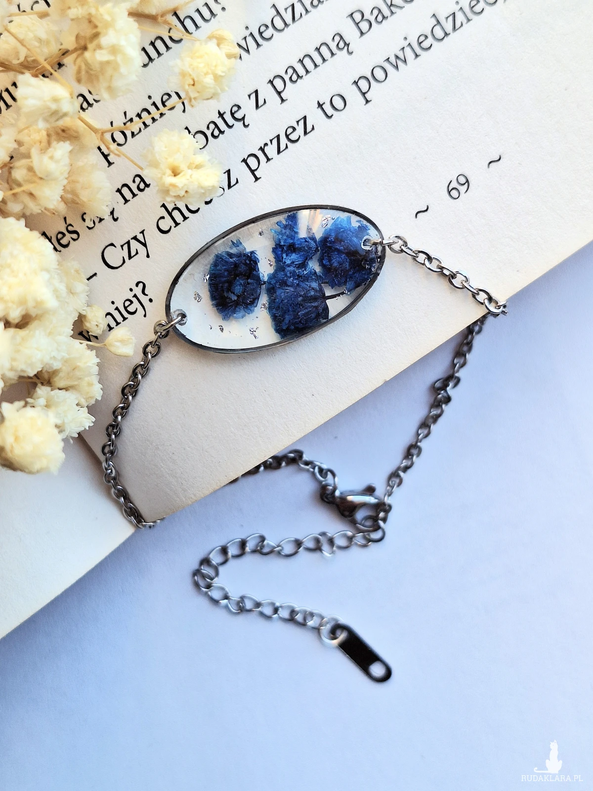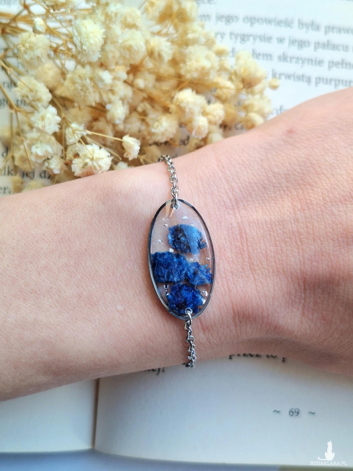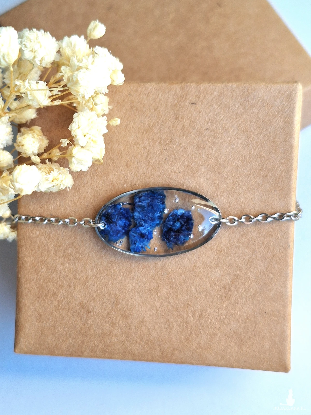 Urocza bransoletka z zatopionymi kwiatami granatowej gipsówki i płatkami srebra. Wykonana z wysokiej klasy żywicy, która nie zmienia koloru pod wpływem promieniowania uv oraz wysokiej jakości stali chirurgicznej.