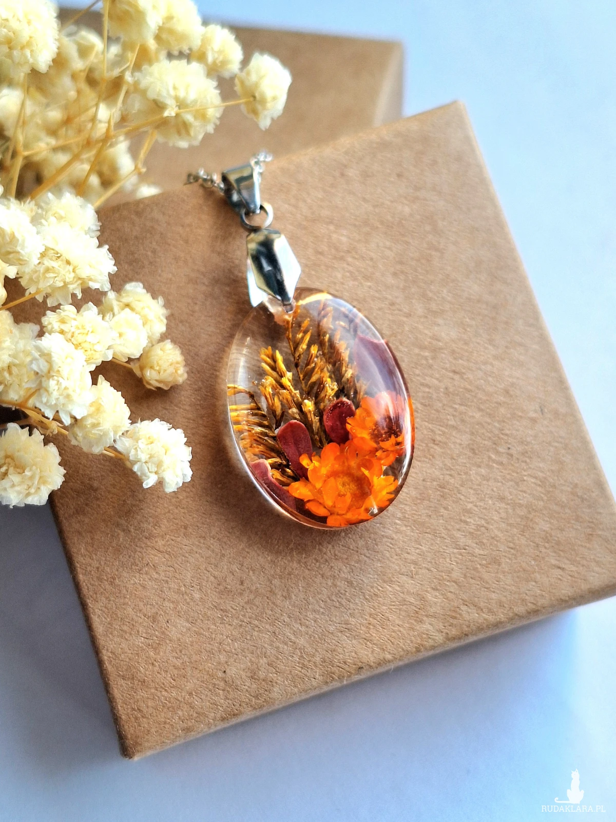 Uroczy wisiorek z zatopionymi kwiatami. Wykonany z wysokiej klasy żywicy, która nie zmienia koloru pod wpływem promieniowania uv oraz wysokiej jakości stali chirurgicznej.