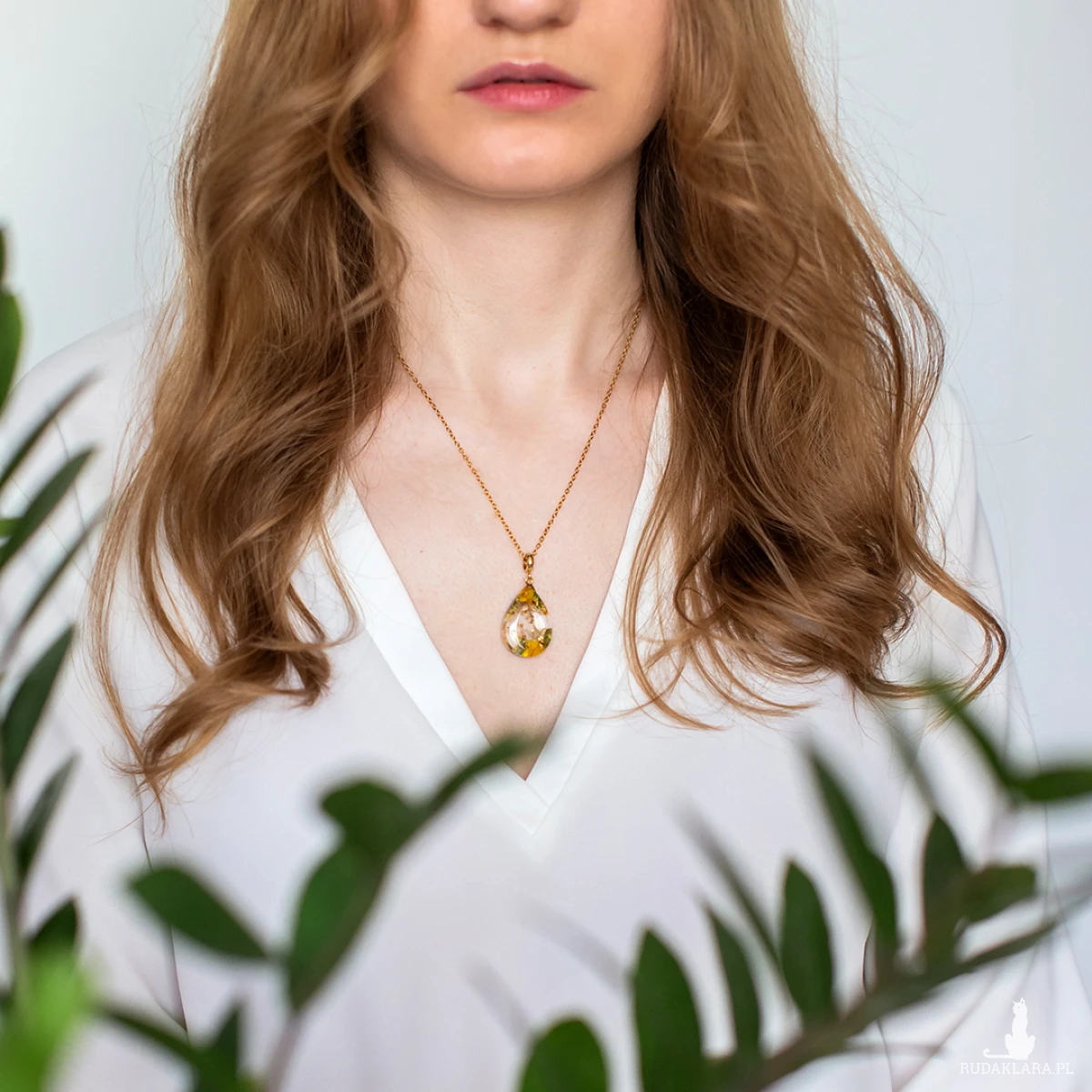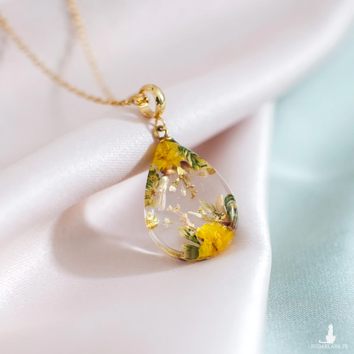 Wisiorek wykonany jest z żywicy epoksydowej z wykorzystaniem suszonych kwiatów. Metalowe elementy to stal nierdzewna szlachetna chirurgiczna.