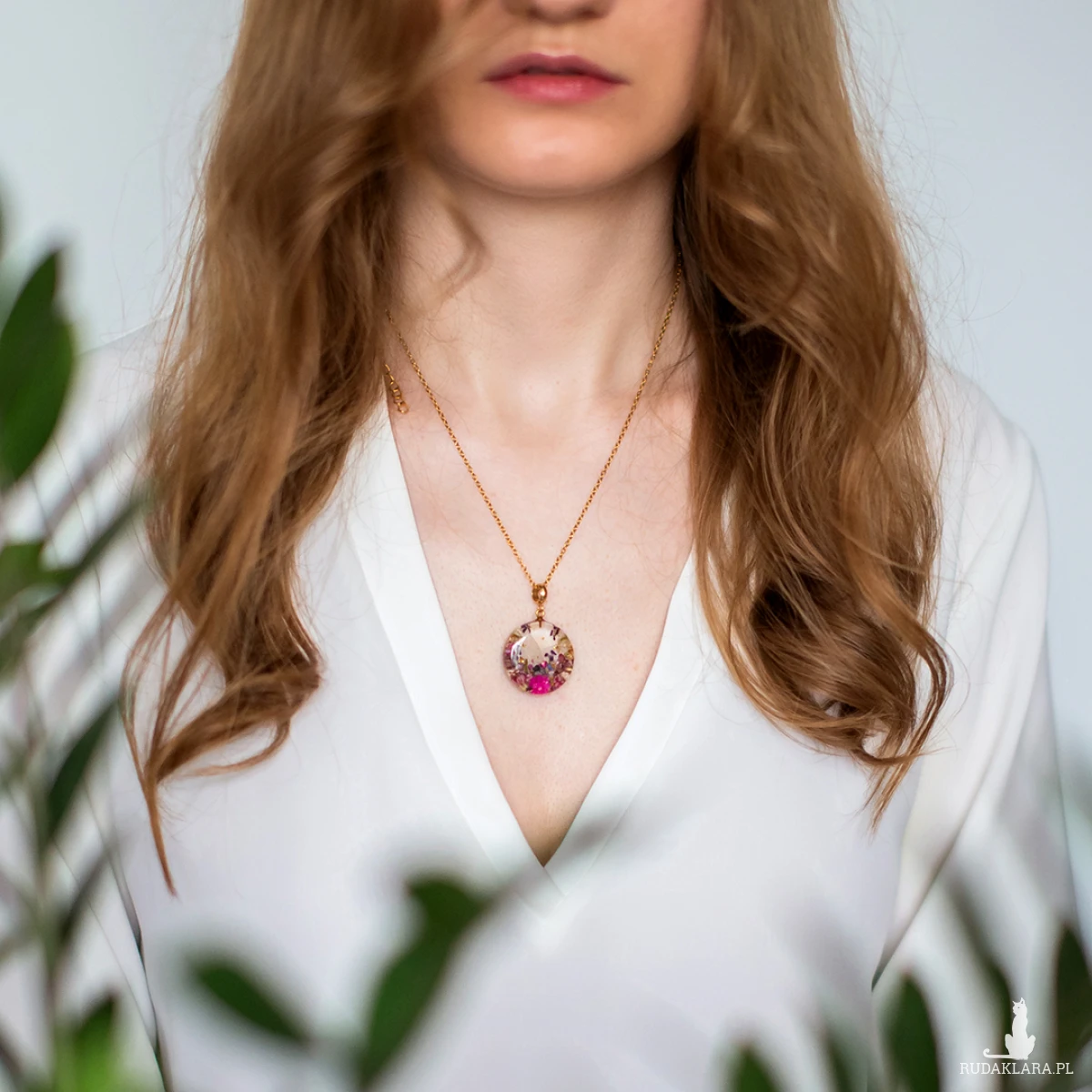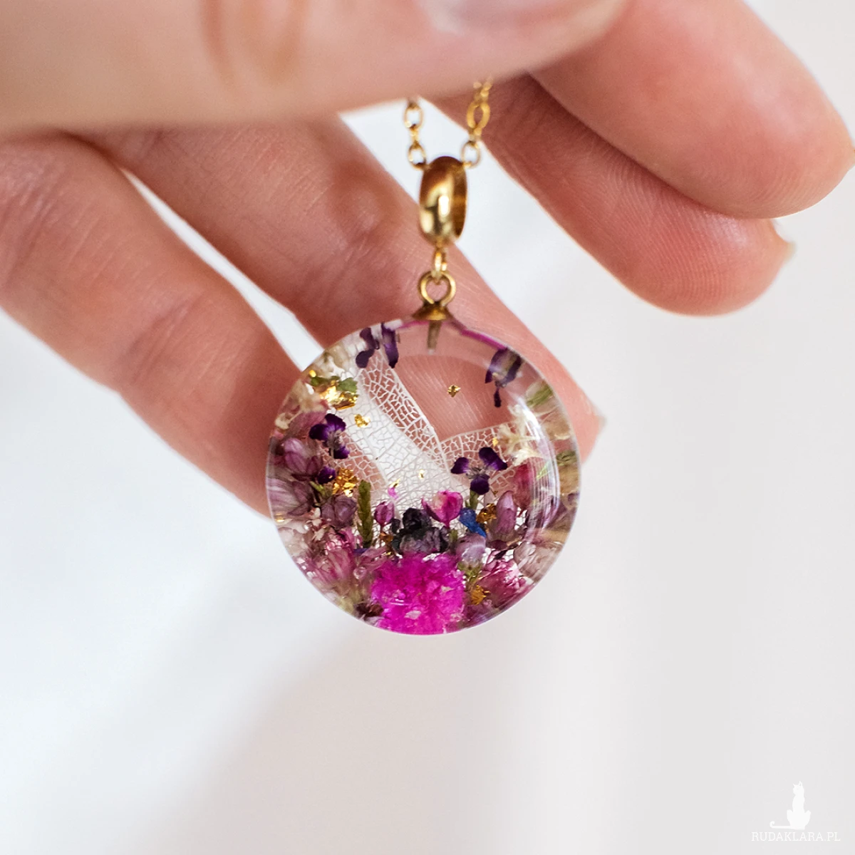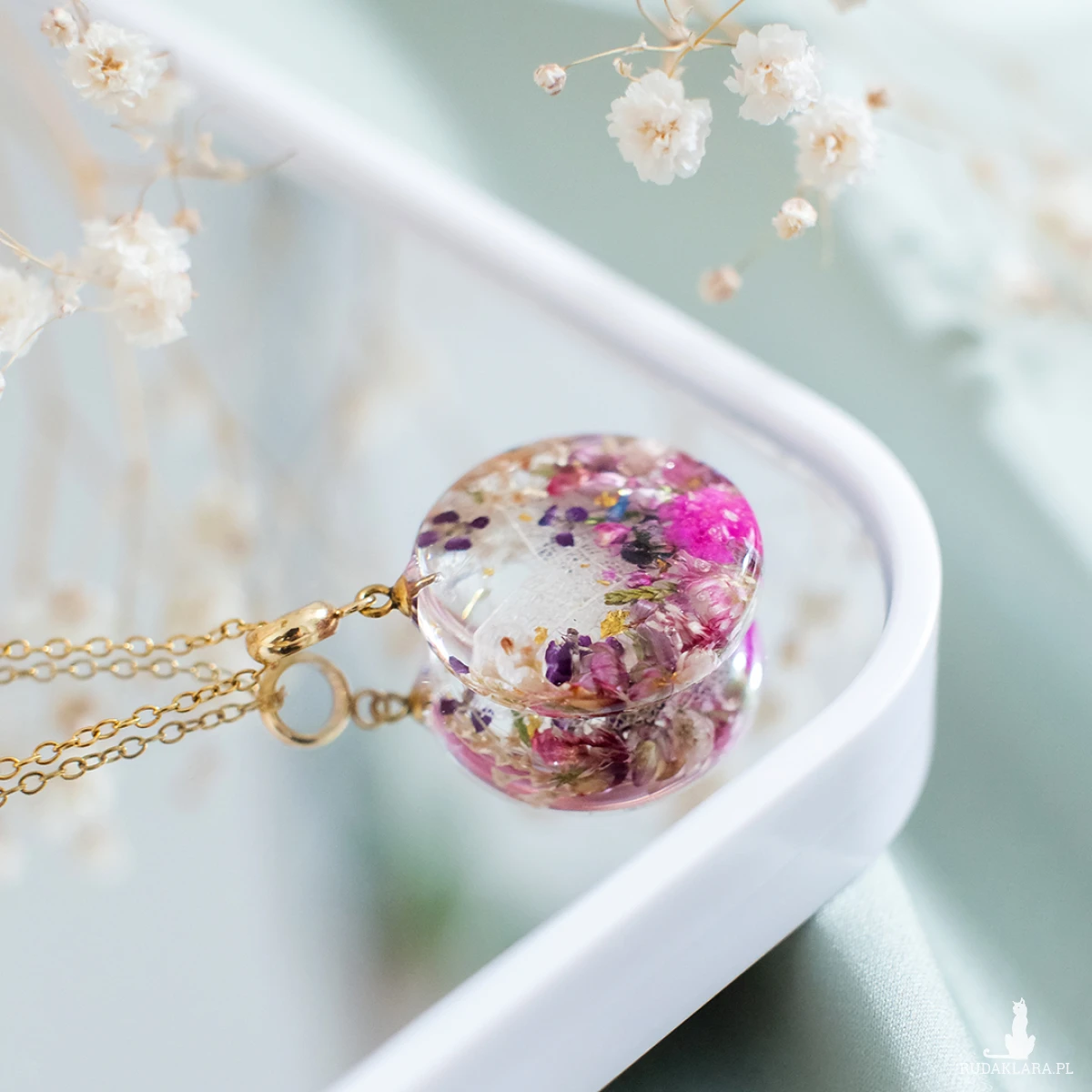 Wisiorek wykonany jest z żywicy epoksydowej z wykorzystaniem suszonych kwiatów. Metalowe elementy to stal nierdzewna szlachetna chirurgiczna.