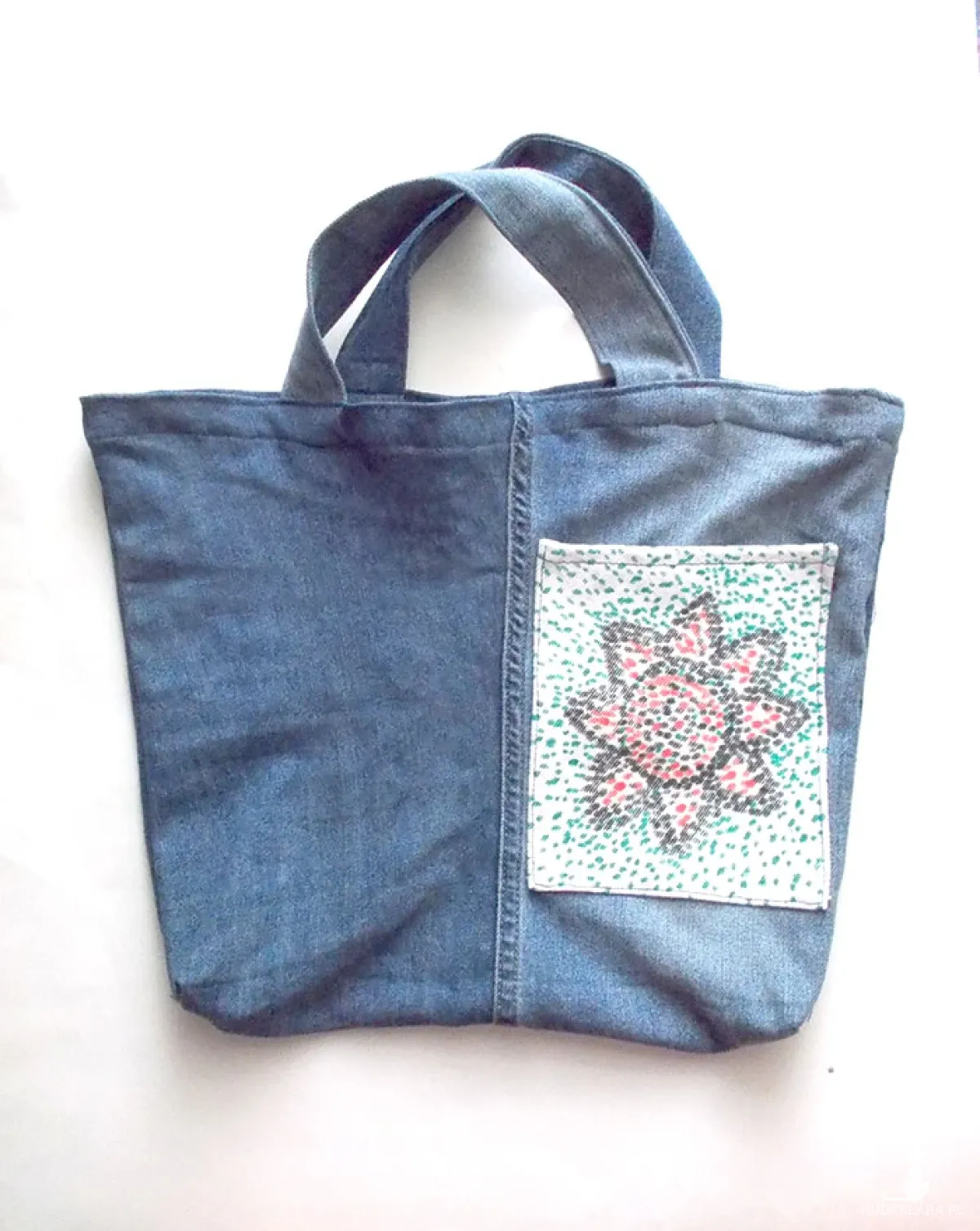 Dżinsowa, eko torba na zakupy, może być także do szkoły na strój do w-fu, na obuwie zmienne itp. Wymiary: wysokość 28,5 cm, szerokość u góry 40 cm u dołu 31 cm, ucho: 15 cm, torba pomieści A4. Z przodu kieszonka, Prać w 30-40 stopniach.