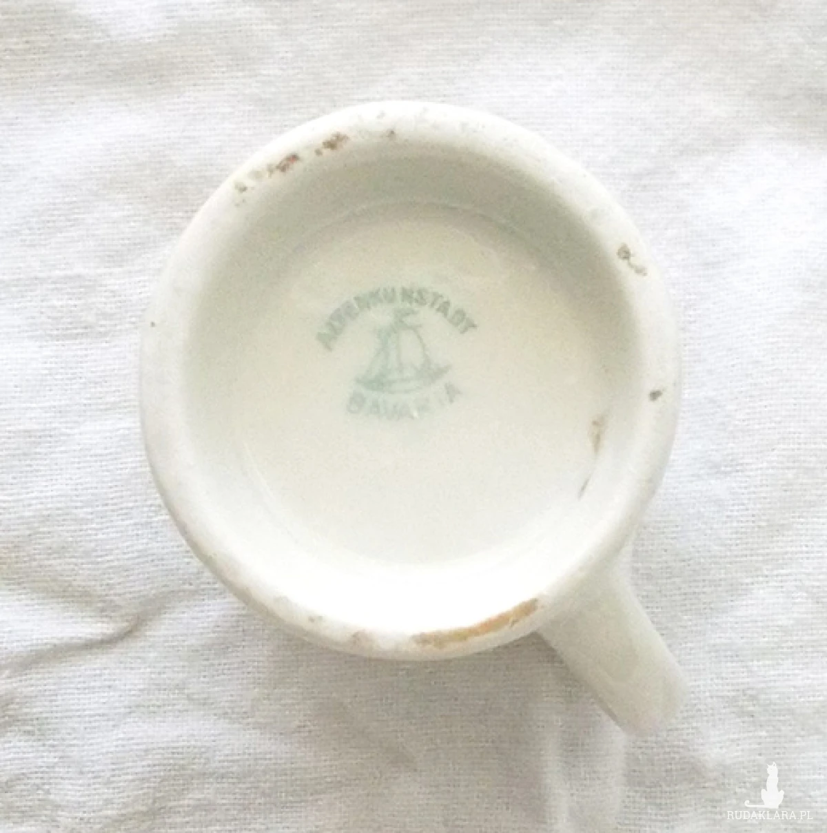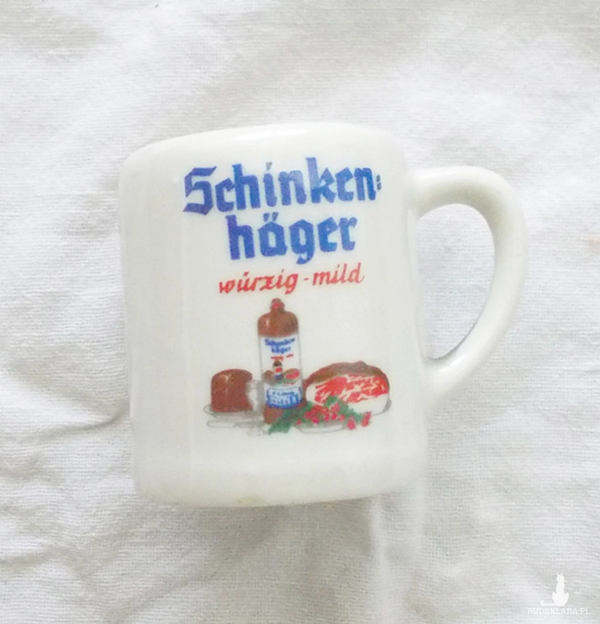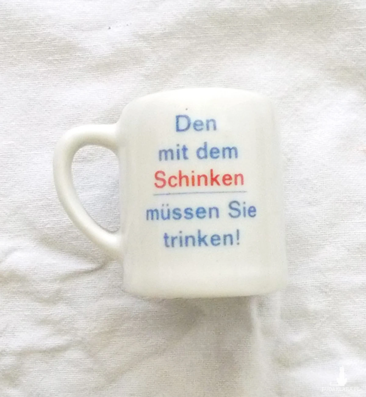 Oryginalny przedmiot vintage, mini kufelek - gadżet z lat 60 XX w. Malutki, niemiecki kufelek Schinken Hager.. Wysokość 4,7 cm, średnica zewn. 4 cm, średnica wewn (otwór) 3 cm. Producent: Altenkunstadt Bavaria.