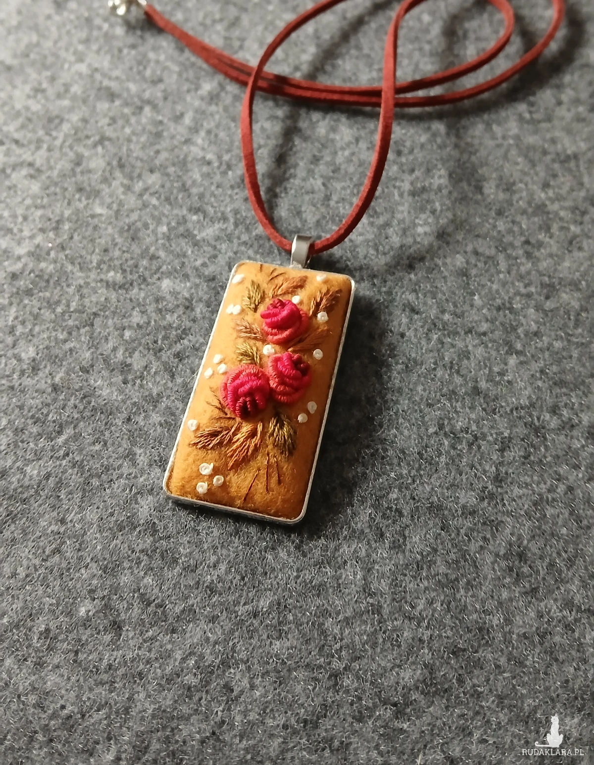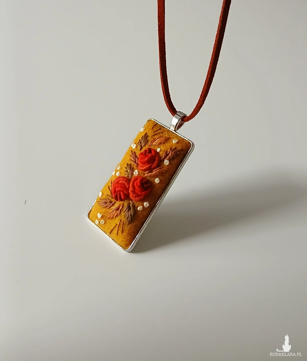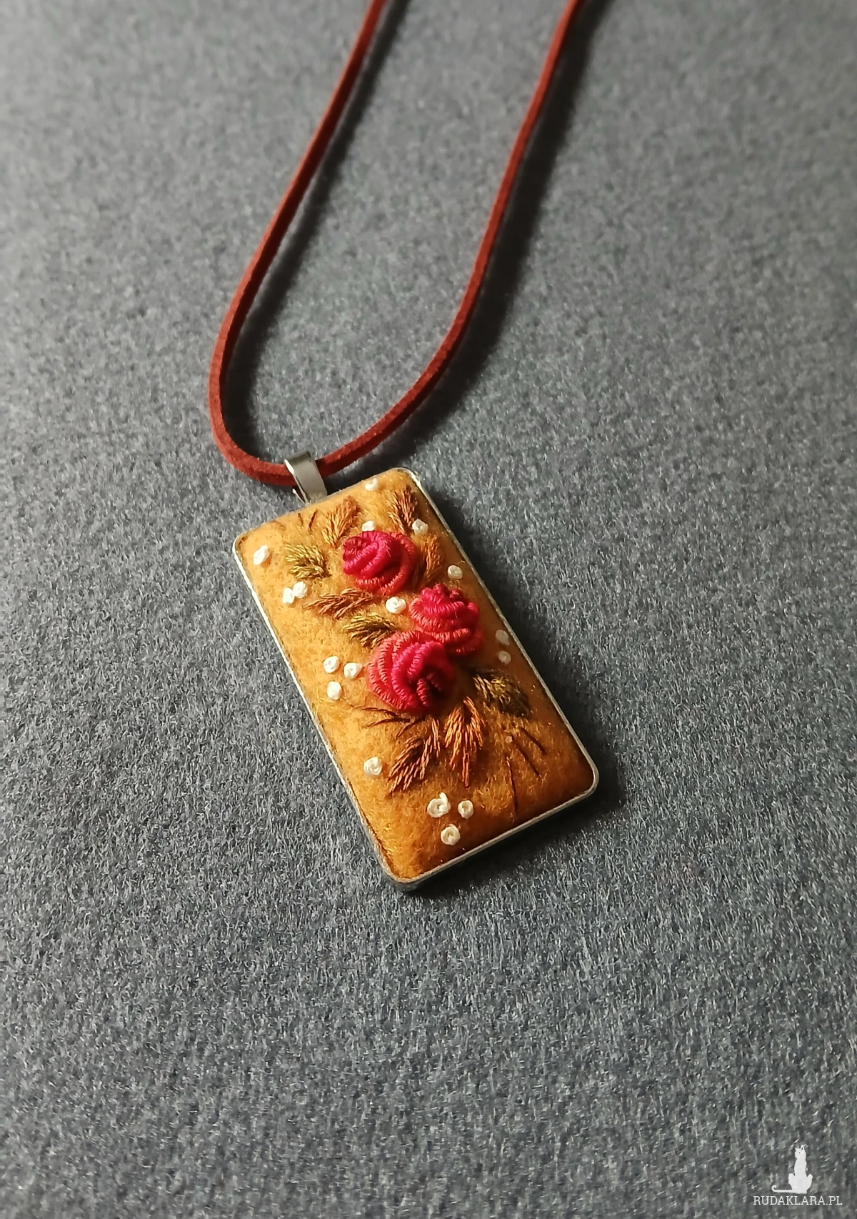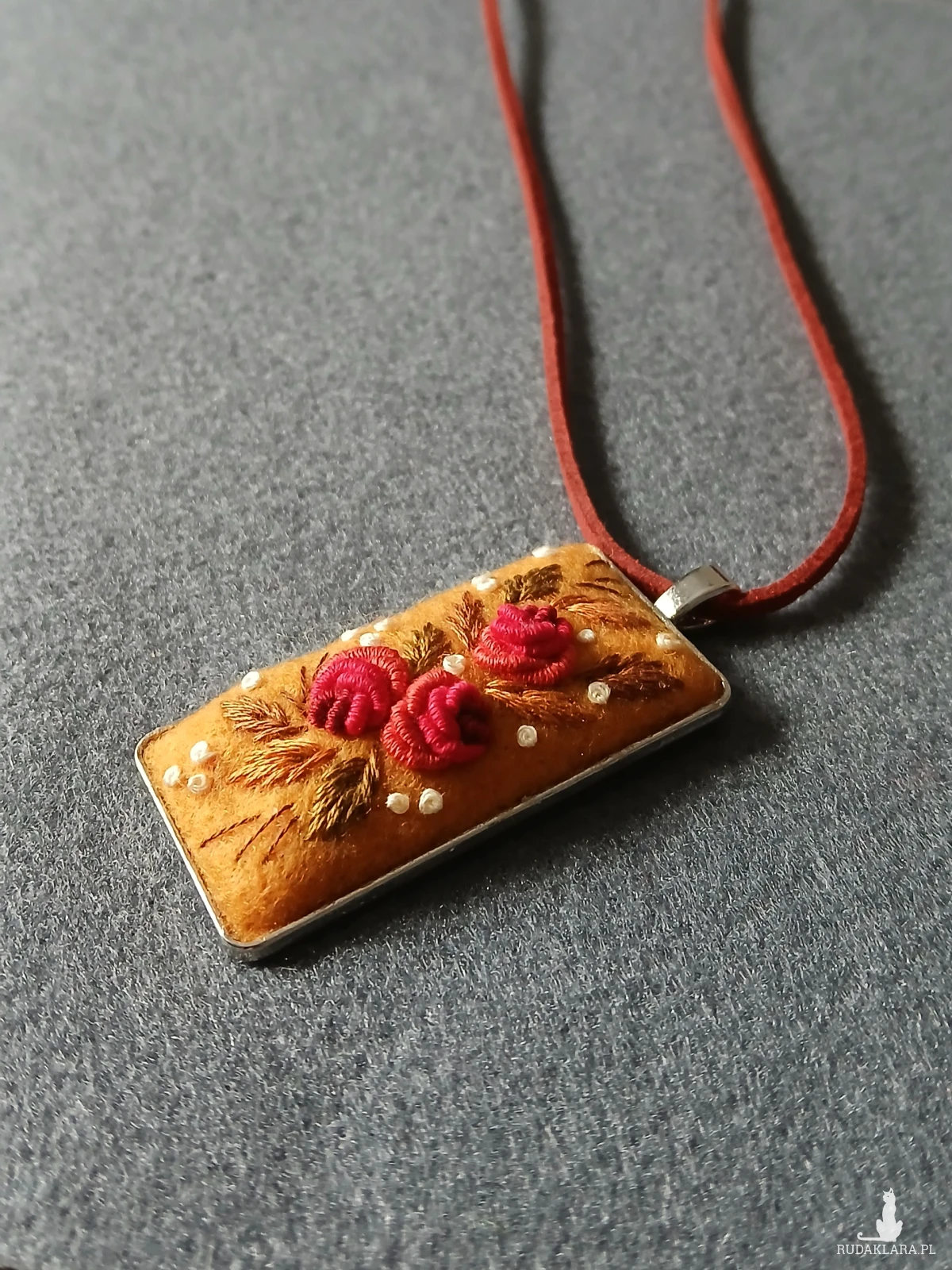 Jesienna ekspresja w stylowym, pełnym gracji bukiecie czerwonych róż na bursztynowym tle. Poczuj magię ręcznie haftowanej biżuterii i pozwól, by stała się dla Ciebie ważna.