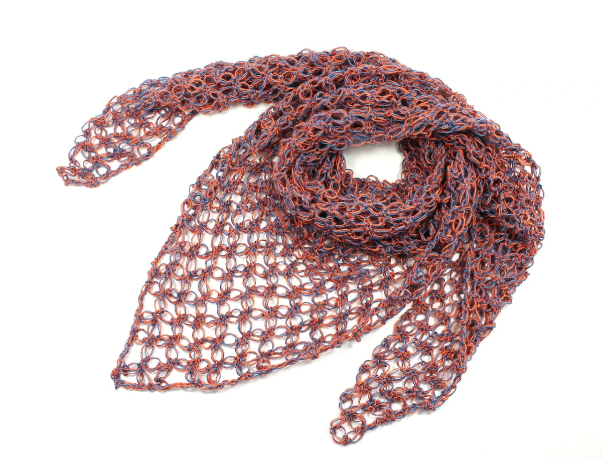 Chusta - apaszka ażurowa zrobiona na szydełku z akrylowej włóczki w kolorach: jeansowy i cegła.