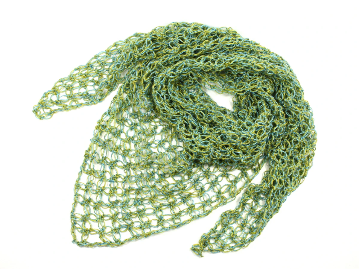 Chusta - apaszka ażurowa zrobiona na szydełku z akrylowej włóczki w kolorach: oliwkowym i turkusowym.
