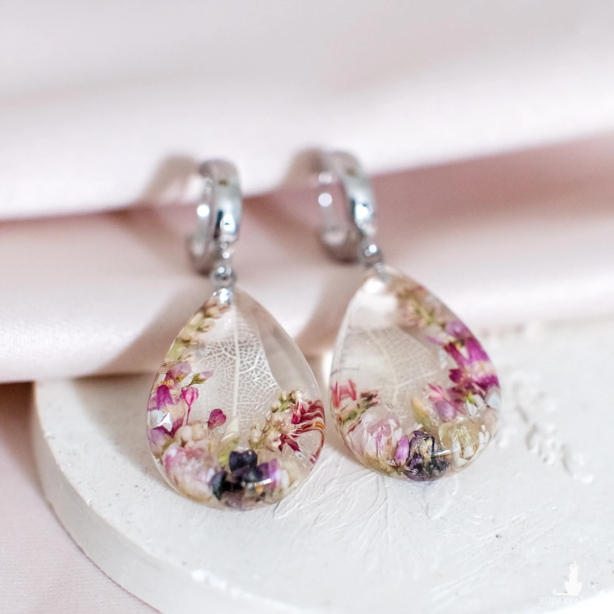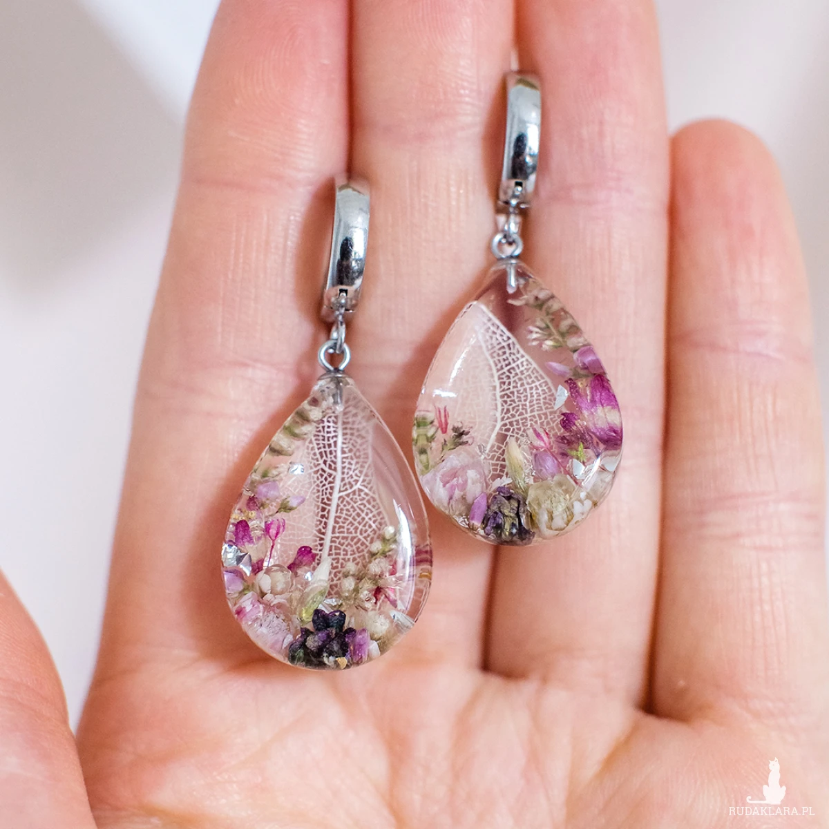Kolczyki wykonany jest z żywicy epoksydowej z wykorzystaniem suszonych kwiatów. Metalowe elementy to stal nierdzewna szlachetna chirurgiczna.