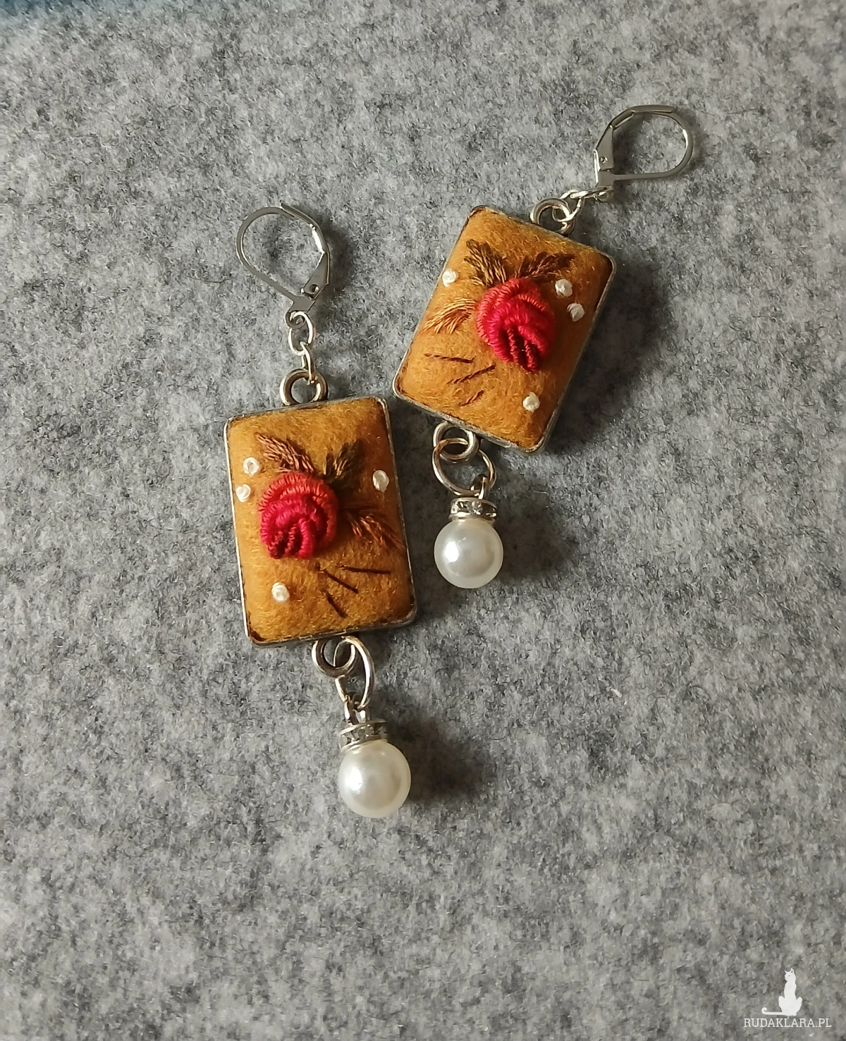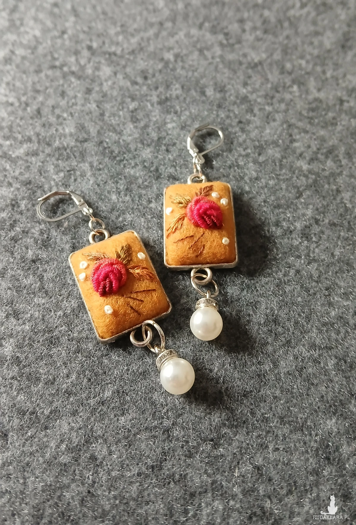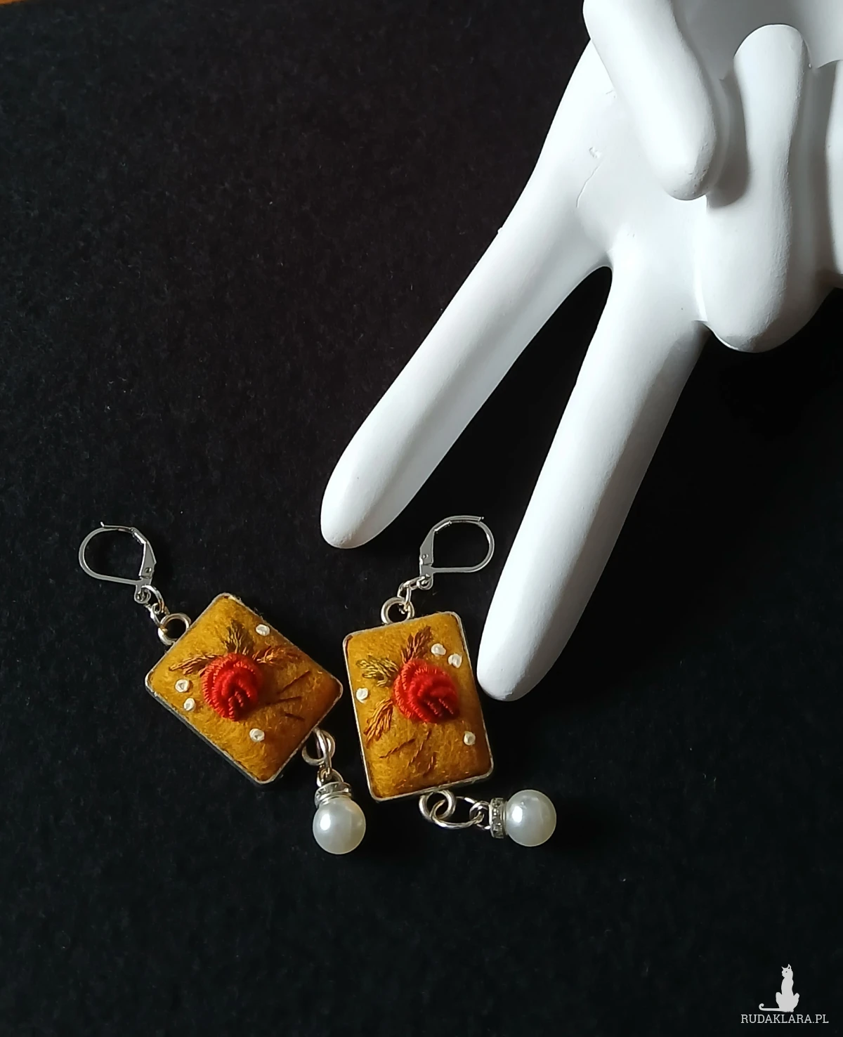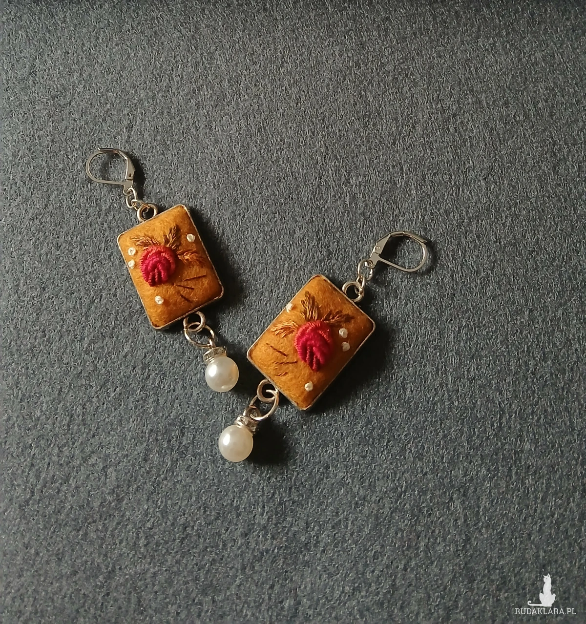 Pełne gracji tajemnicze kolczyki na zamkniętych biglach w bursztynowym kolorze, zwieńczone perłą to nieszablonowa biżuteria i wyjątkowy sposób na wyrażenie siebie.