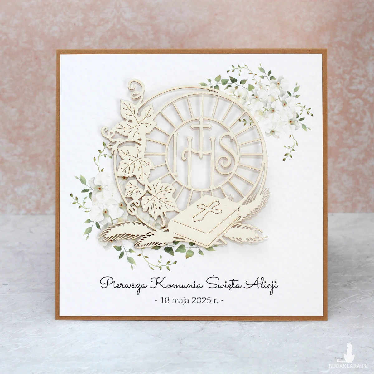 Personalizowana kartka z okazji Pierwszej Komunii Świętej. Wewnątrz wydrukowane życzenia lub biała wyklejka do własnoręcznego wypisania.