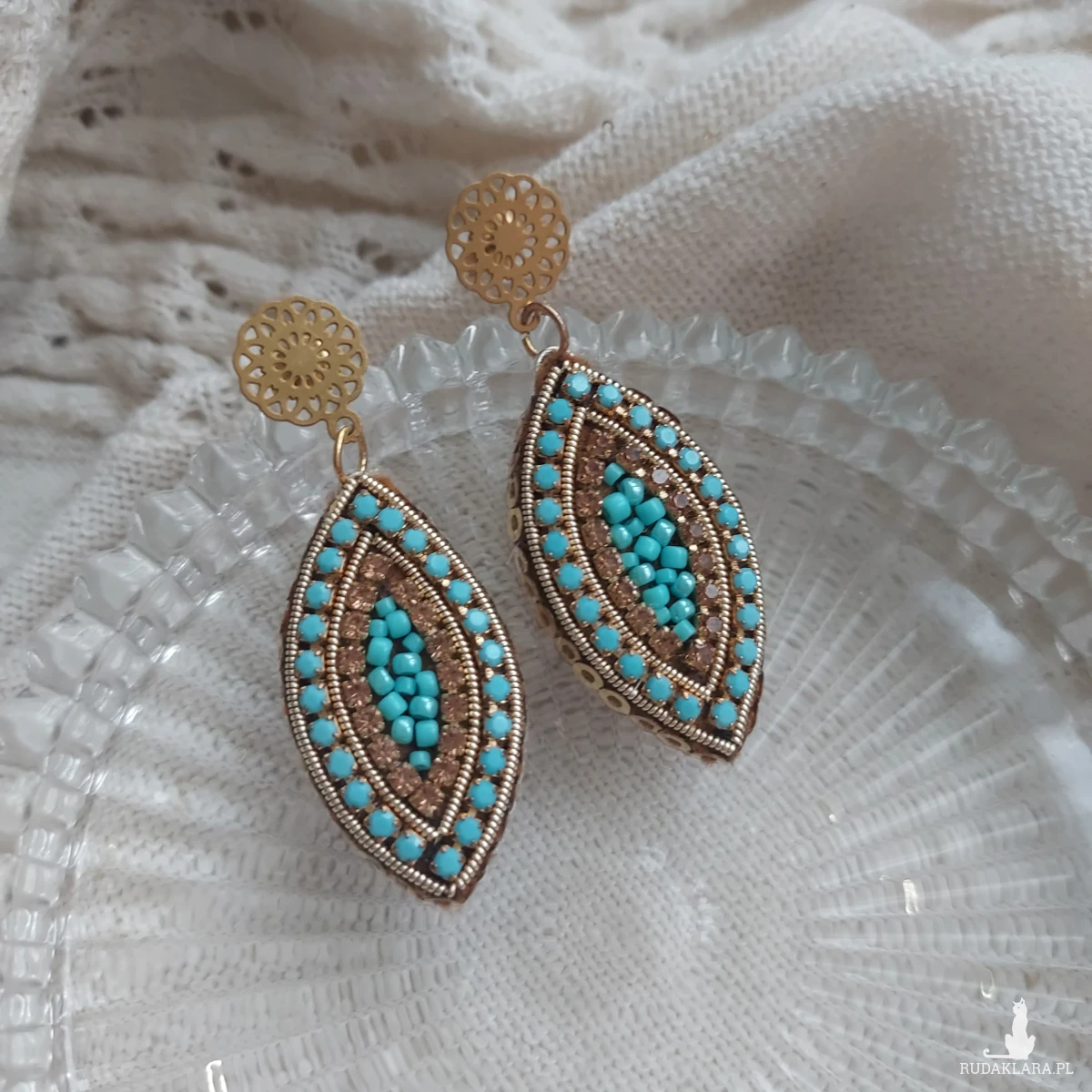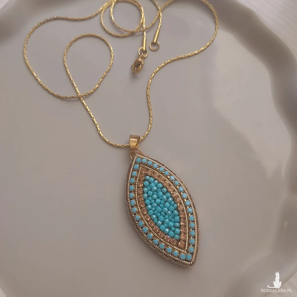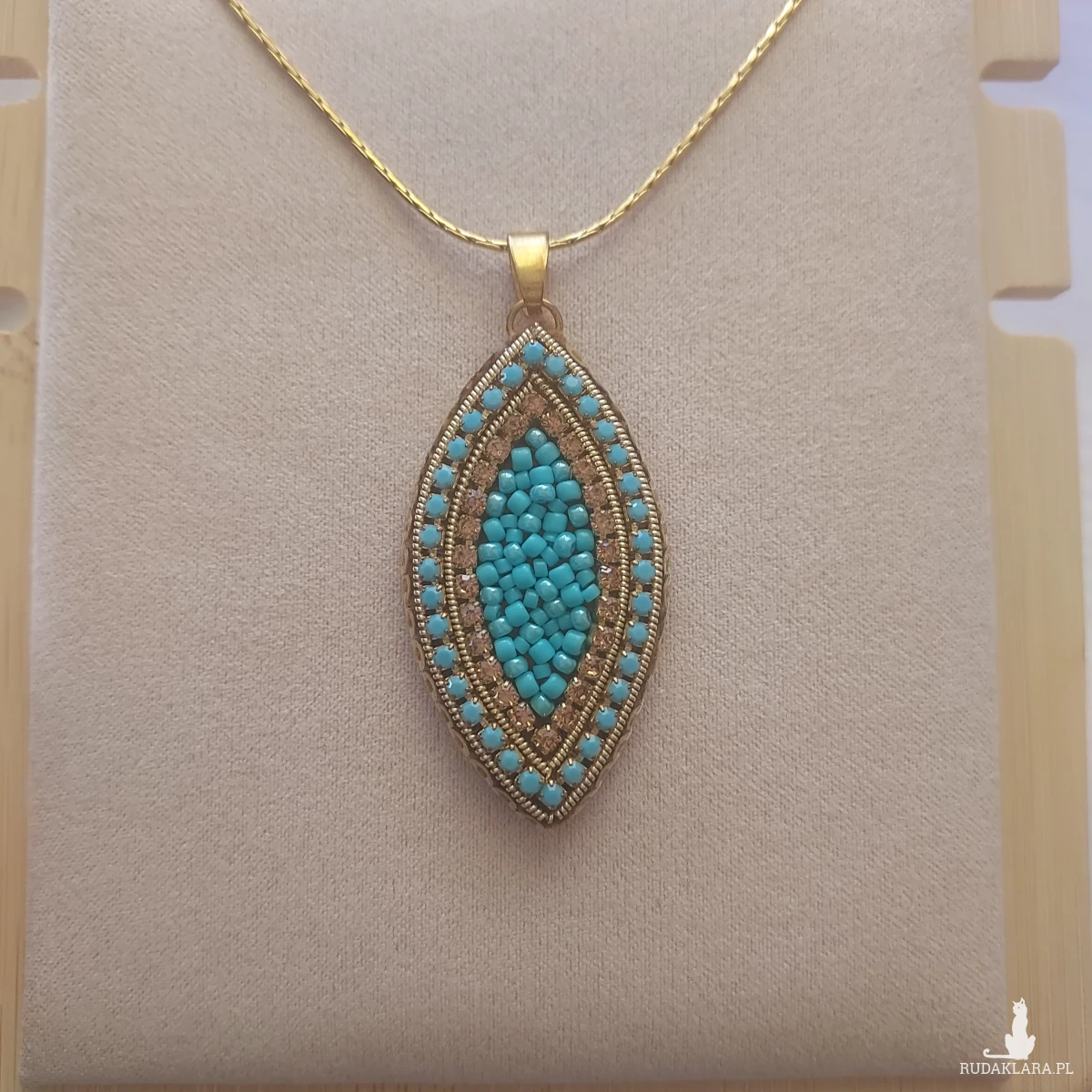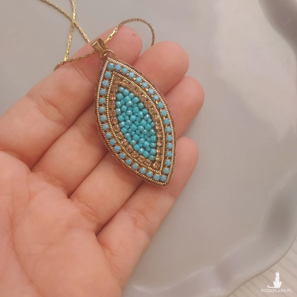 Niezwykle lekki, niepowtarzalny, kobiecy, wisior w kolorze turkusowym w złotym wykończeniu. Powstał techniką haftu koralikowego.
