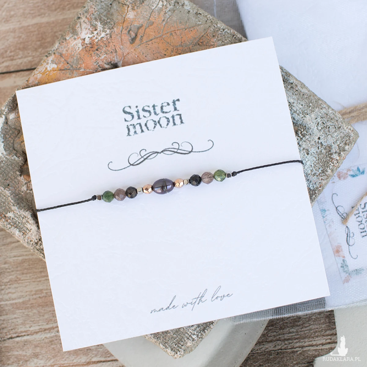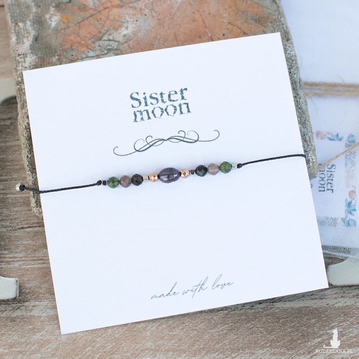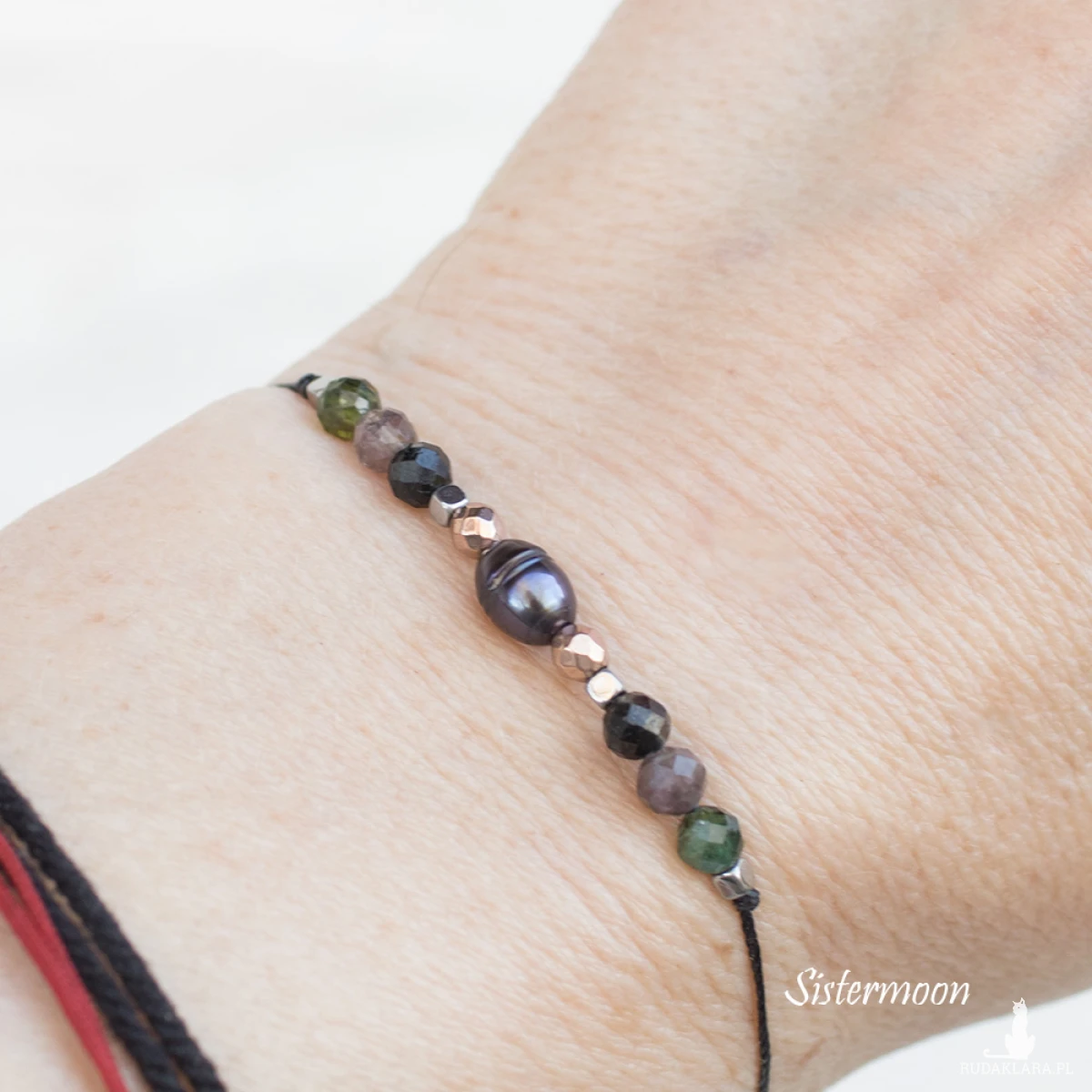 Minimalistyczna Bransoletka Turmaliny i Perła wykonana ręcznie ze starannie wyselekcjonowanych minerałów o średnicy 2, 3 i 4 mm: fasetowane turmaliny i hematyty, perła rzeczna w stalowym kolorze oraz mocny nierozciągliwy i nieblaknący cienki sznureczek z przesuwnym zapięciem makramowym. Pasuje na nadgarstek o obwodzie 16-20 cm. Jeśli potrzebny inny rozmiar, napisz!
