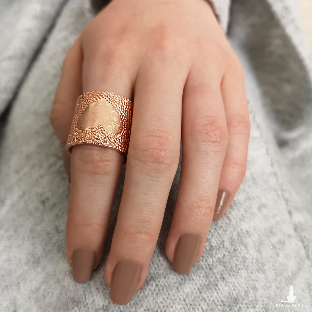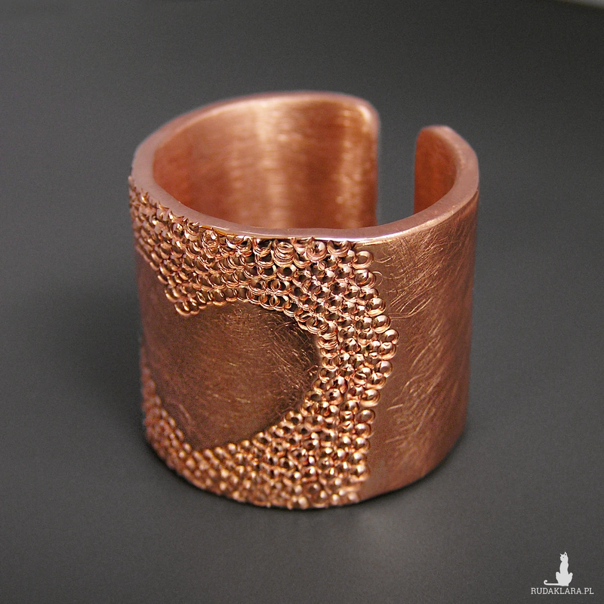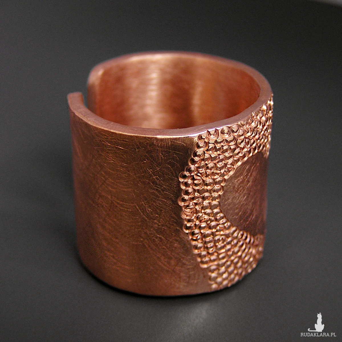 Wielki pierścień wykonany z miedzi, z teksturą, satynowany.