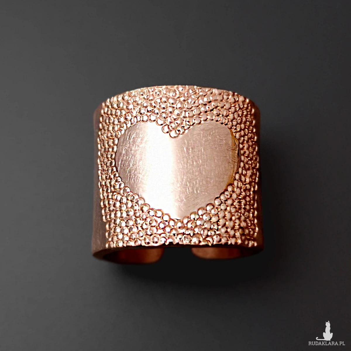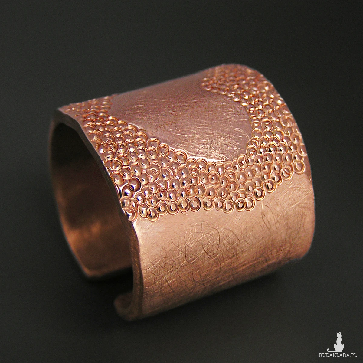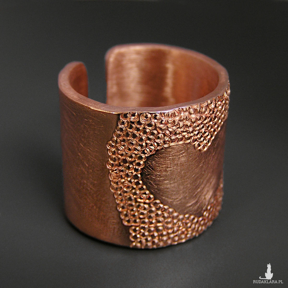 Wielki pierścień wykonany z miedzi, z teksturą, satynowany.