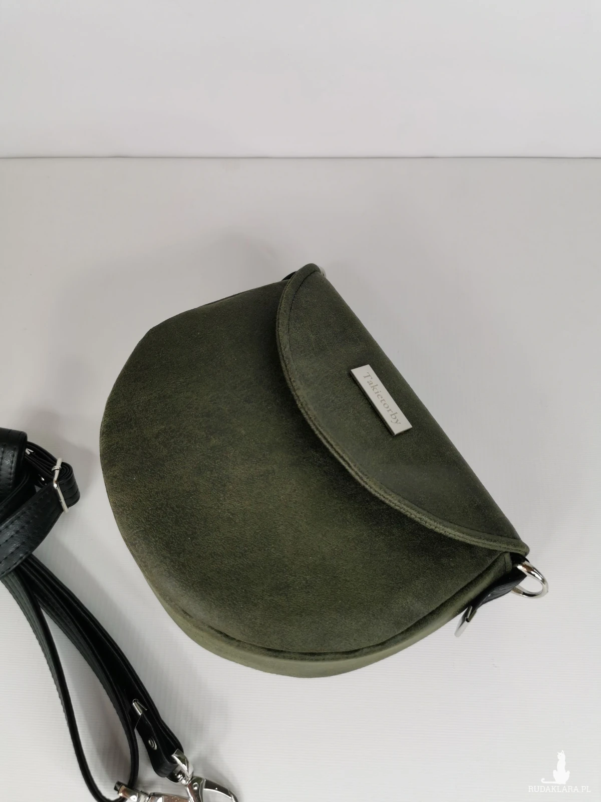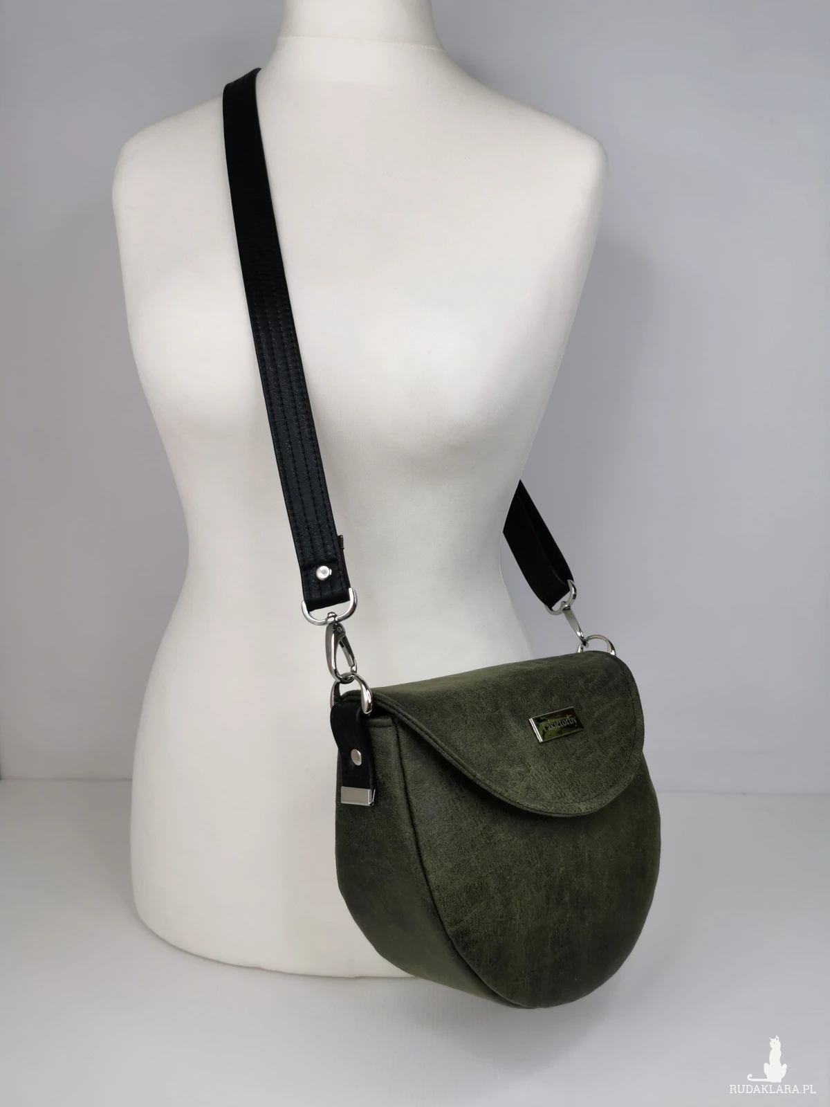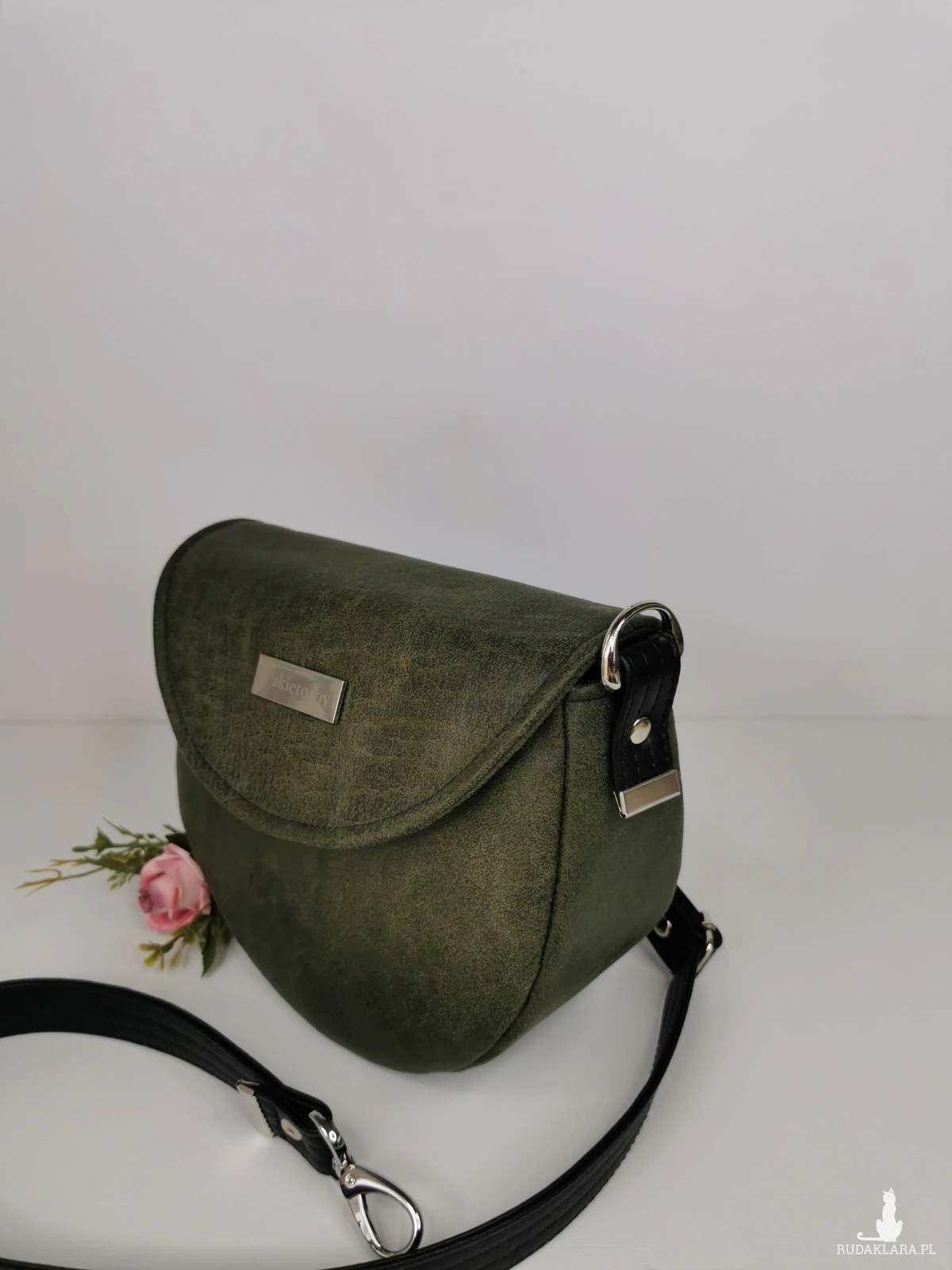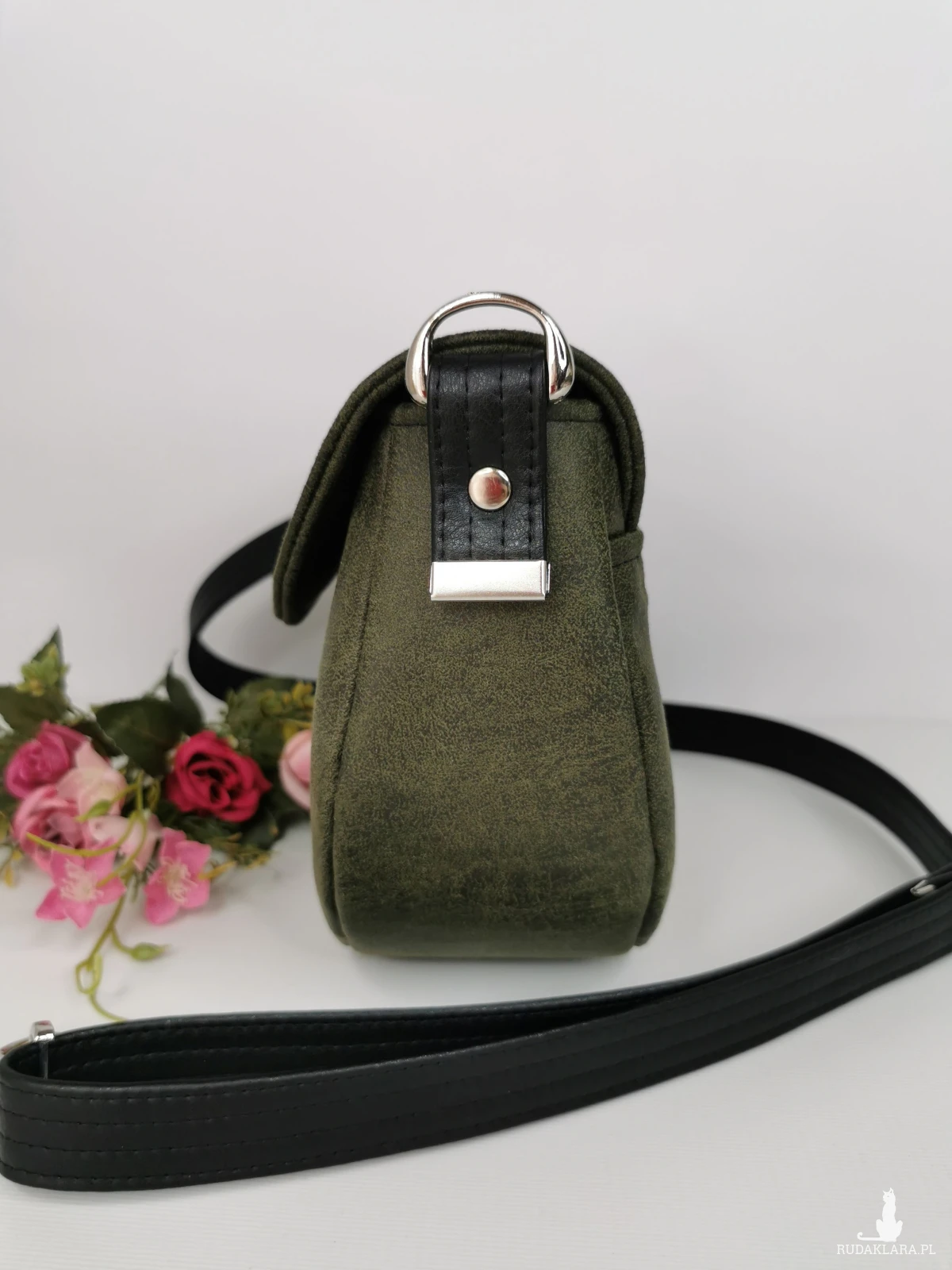 Torebka typu listonoszka z klapką . Została wykonana z tkaniny w kolorze zielonym khaki . W skład tkaniny wchodzi : 70% skóry naturalnej oraz 30 % poliestru . Torebka zapinana na zapięcie magnetyczne zamontowane w klapce . Podszewka z tkaniny poliestrowej wodoodpornej w kolorze czarnym . Wewnątrz znajduje się kieszeń zamykana na zamek . Torebka ma długi regulowany pasek z czarnej ekoskóry .