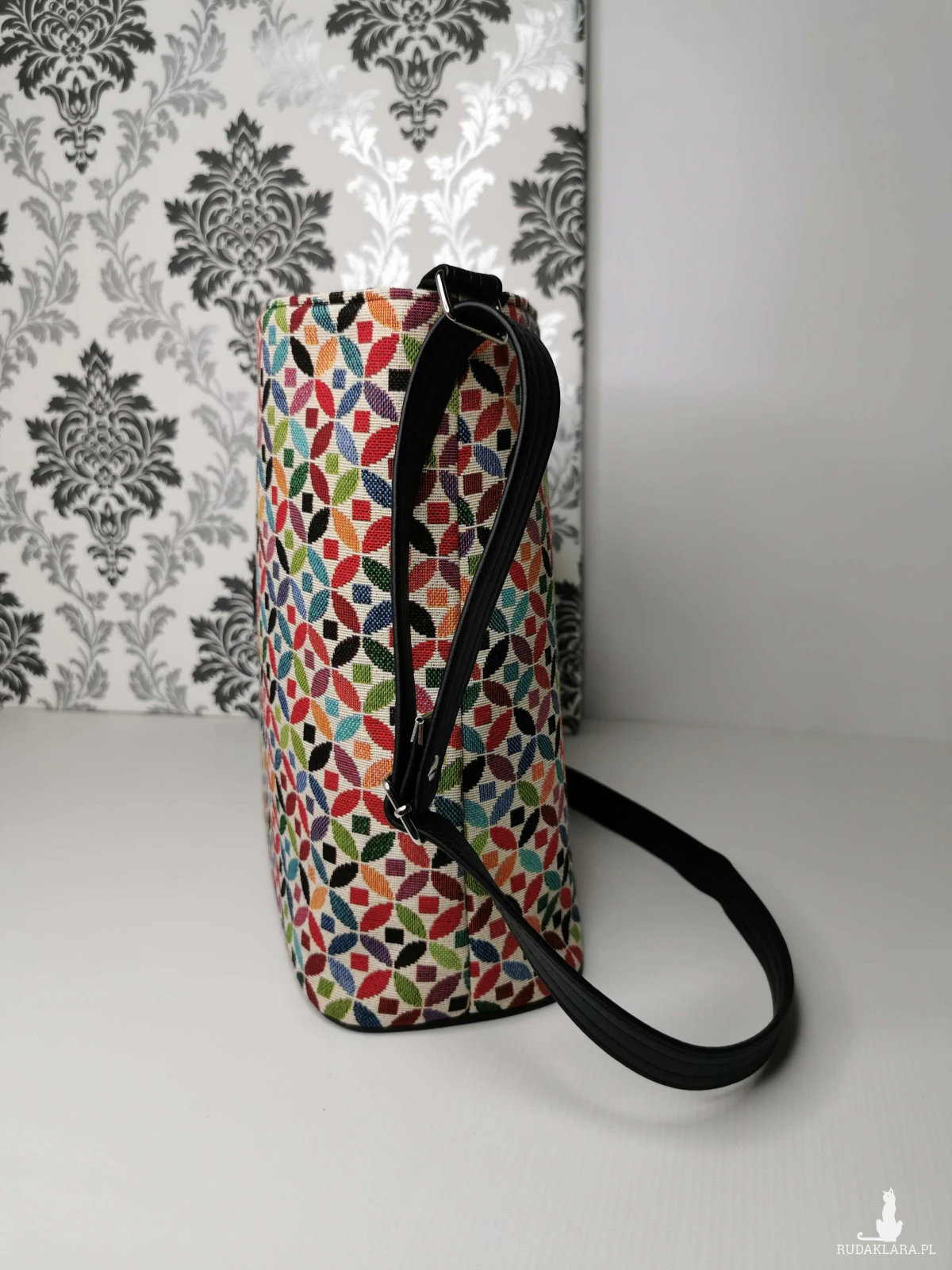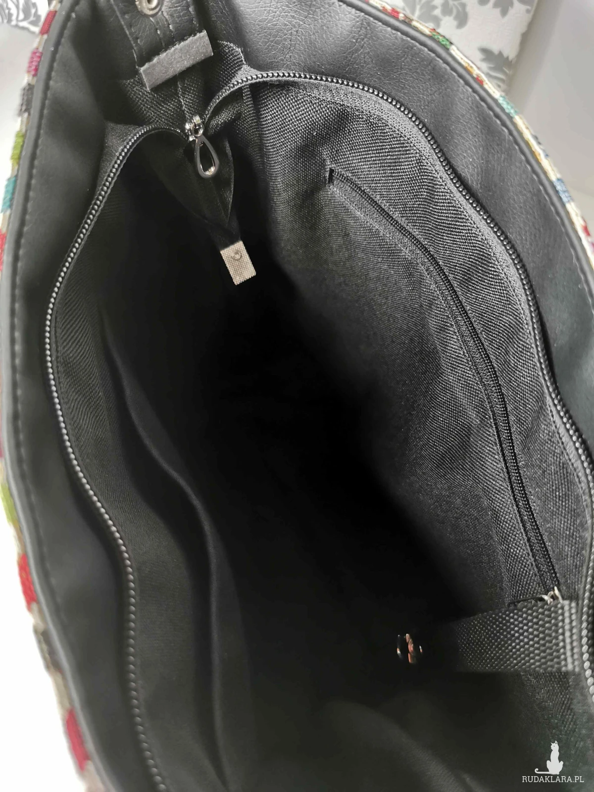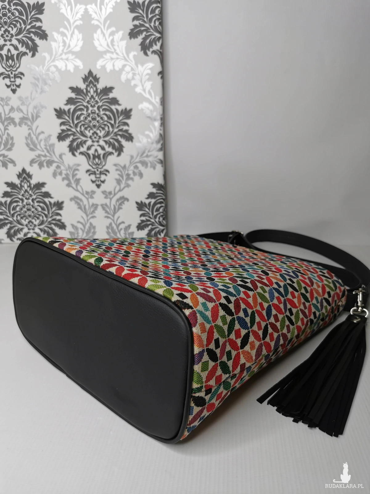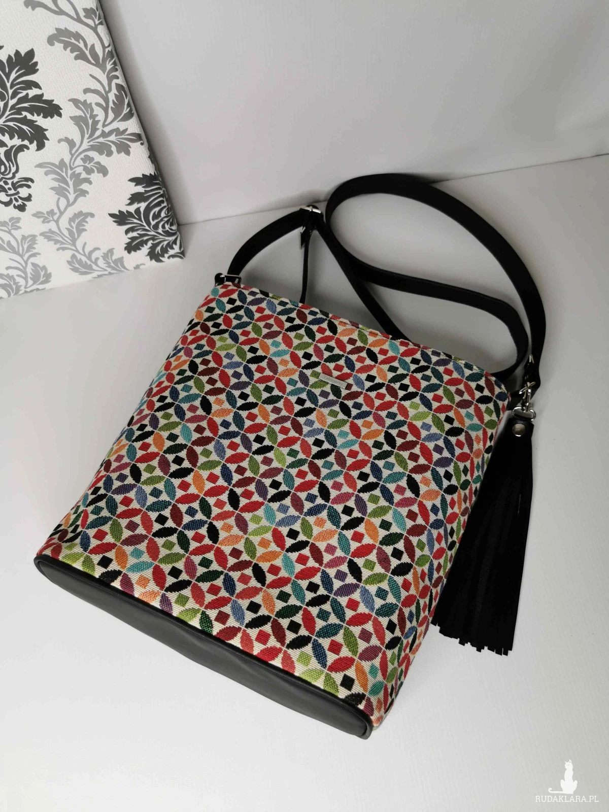 Torebka listonoszka na długim regulowanym pasku z zaokrąglonym dnem .  W komplecie , ozdobny odpinany chwost  . Torebka została wykonana z tkaniny żakardowej w kolorowy geometryczny wzór i ekoskóry w kolorze czarnym .  Zapinana na zamek .  Wewnątrz , podszewka z tkaniny poliestrowej wodoodpornej w kolorze czarnym  , oraz dwie pojemne kieszenie w tym jedna zapinana na zamek . Zamontowana jest też smycz z karabińczykiem na klucze .