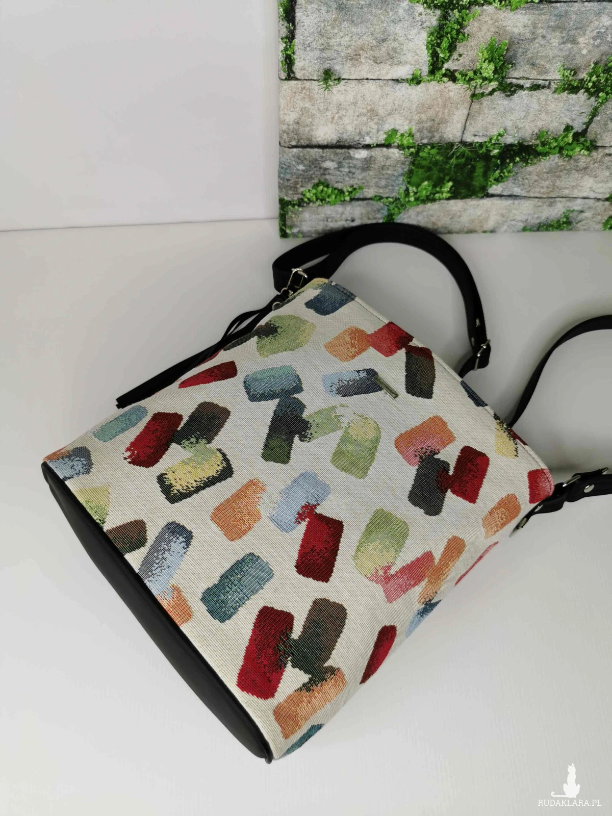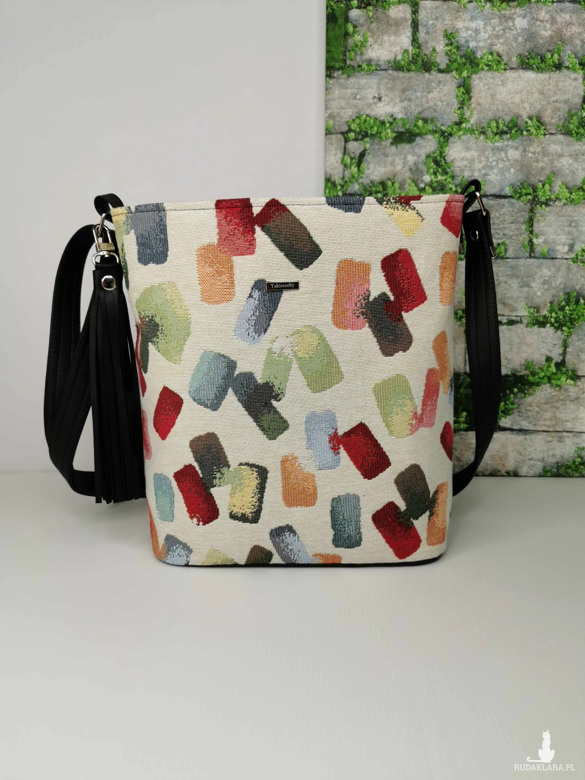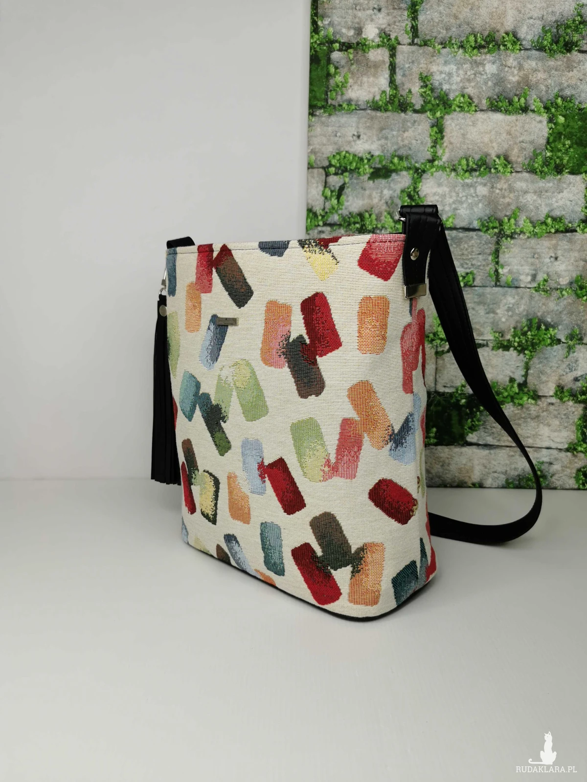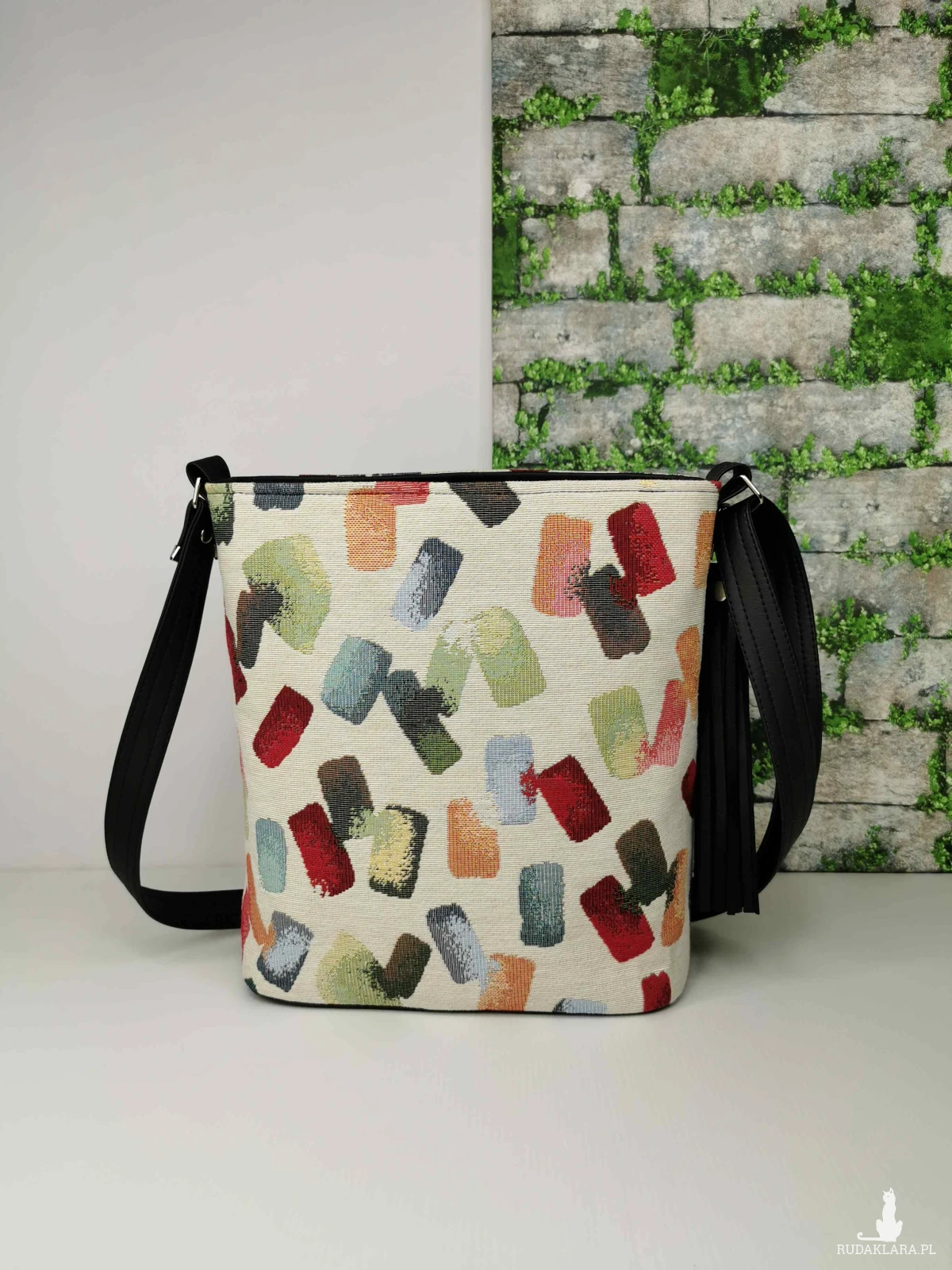Torebka listonoszka na długim regulowanym pasku z zaokrąglonym dnem .  W komplecie , ozdobny odpinany chwost  . Torebka została wykonana z tkaniny żakardowej w kolorowy geometryczny wzór i ekoskóry w kolorze czarnym .  Zapinana na zamek .  Wewnątrz , podszewka z tkaniny poliestrowej wodoodpornej w kolorze czarnym  , oraz dwie pojemne kieszenie w tym jedna zapinana na zamek . Zamontowana jest też smycz z karabińczykiem na klucze .