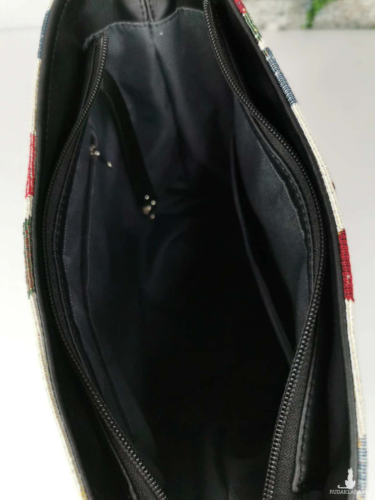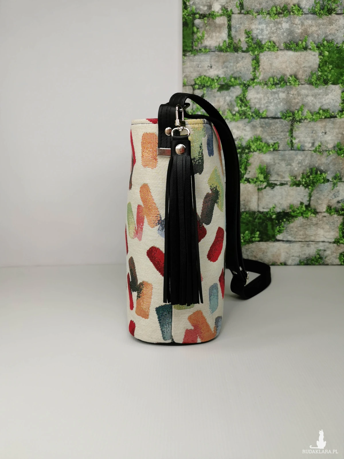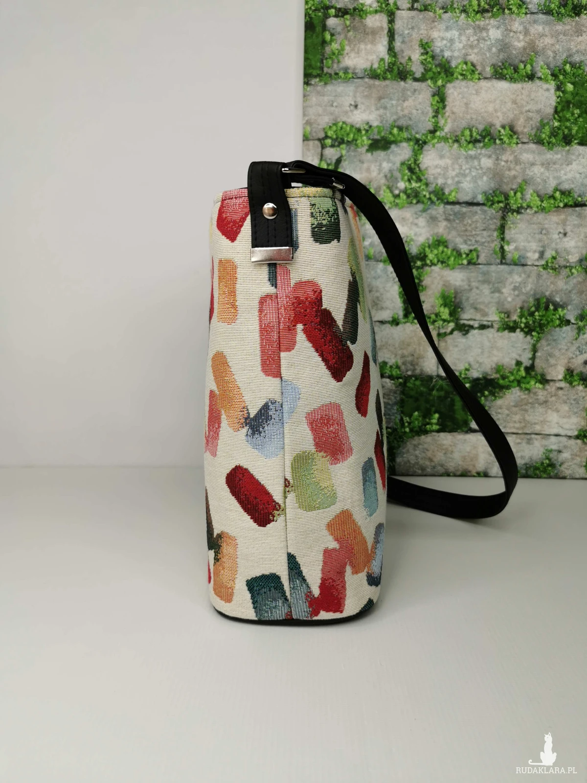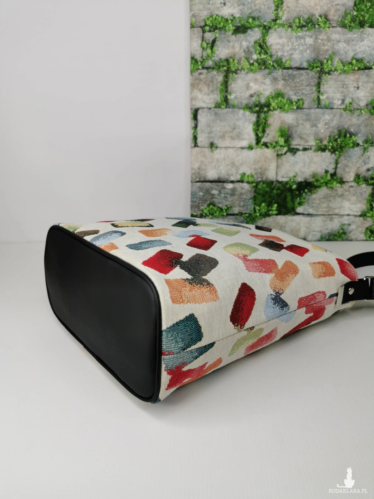 Torebka listonoszka na długim regulowanym pasku z zaokrąglonym dnem .  W komplecie , ozdobny odpinany chwost  . Torebka została wykonana z tkaniny żakardowej w kolorowy geometryczny wzór i ekoskóry w kolorze czarnym .  Zapinana na zamek .  Wewnątrz , podszewka z tkaniny poliestrowej wodoodpornej w kolorze czarnym  , oraz dwie pojemne kieszenie w tym jedna zapinana na zamek . Zamontowana jest też smycz z karabińczykiem na klucze .