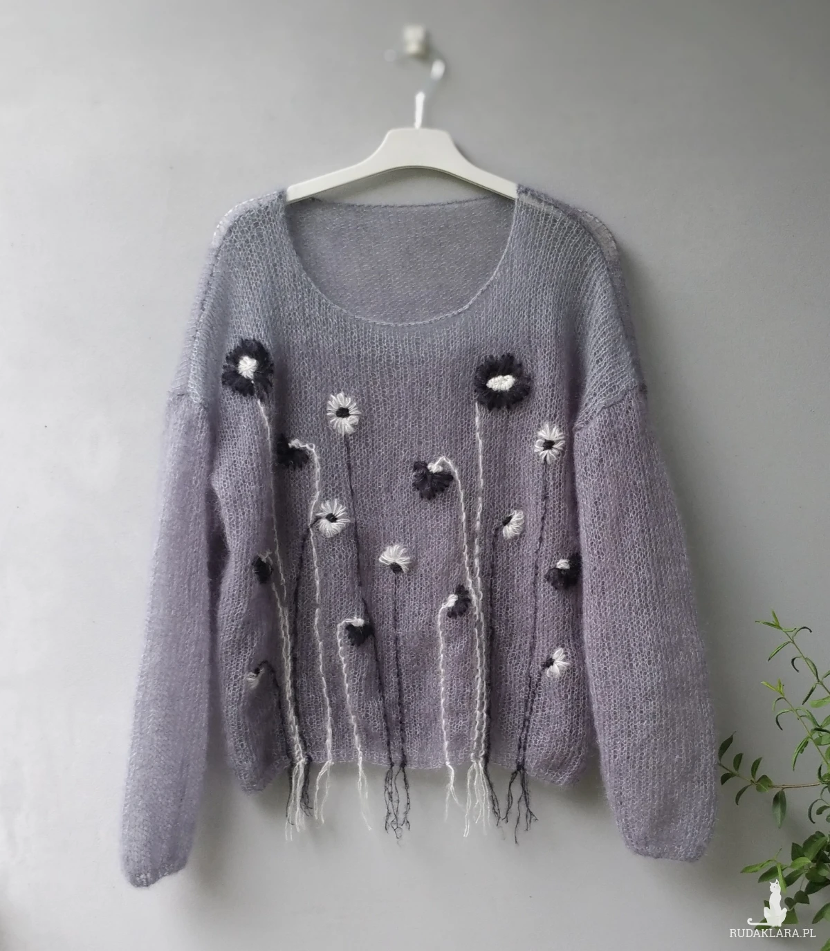 Sweterek mgiełka zrobiony ręcznie na drutach z mieszanki 75%moheru i 25% jedwabiu w szarościach . Na przodzie wyszyte kolorowe kwiaty.