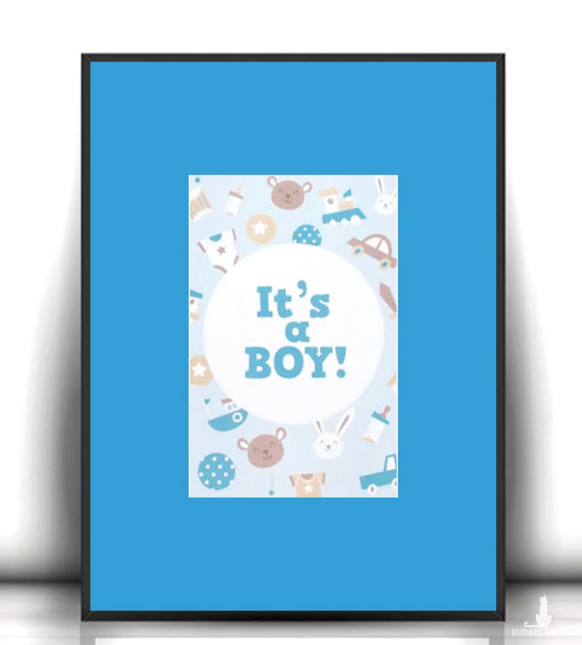Nowy plakat z napisem "It's a boy" (To chłopiec). Obrazek jest na ciemnoniebieskim kartoniku A4. Dekoracja na ścianę do pokoju małego chłopczyka, żłobka, przedszkola, bawialni, klubu malucha itp. Plakat wystarczy dać do ramki 21x30 cm.. Poster będzie pasował zwłaszcza do wnętrz urządzonych w stylu skandynawskim, nowoczesnym, hygge, minimalistycznym, loftowym, mieszanym.