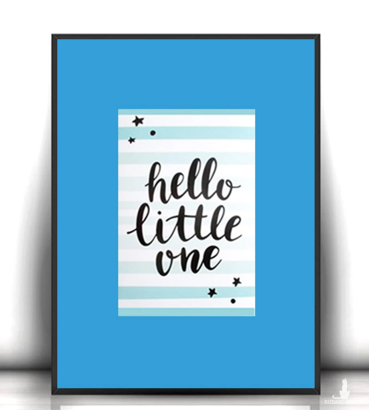 Nowy plakat z napisem "Hello little one" (Witaj maleństwo). Obrazek jest na ciemnoniebieskim kartoniku A4. Dekoracja na ścianę do dziecięcego pokoju, dla małego chłopczyka lub dziewczynki, żłobka, przedszkola, bawialni, klubu malucha, sypialni, jadalni itp. Plakat wystarczy dać do ramki 21x30 cm.. Poster będzie pasował zwłaszcza do wnętrz urządzonych w stylu skandynawskim, nowoczesnym, hygge, minimalistycznym, loftowym, mieszanym.