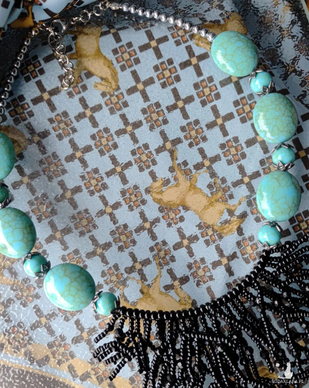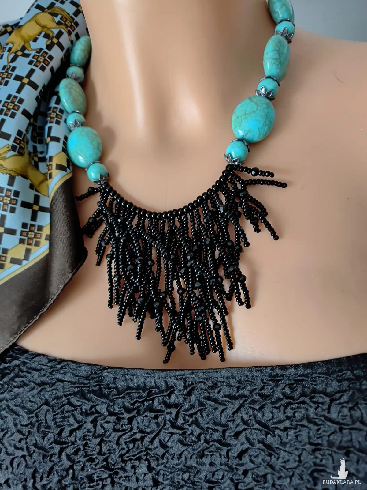 Naszyjnik krótki z koralików w kształcie oliwek w kolorze turkusowym. Ręcznie wyplecione frędzle z czarnych koralików okrągłych i fasetowanych kryształków szklanych. Przekładki metalowe kwiatuszki. Kuleczki hematytów w kolorze srebrnym. Objętość naszyjnika wynosi 43-46 cm, Zapięcie i ogniwka ze stali nierdzewnej. Naszyjnik będzie dobrze wyglądał jako elegancki dodatek do wieczorowej kreacji, ale równie dobrze prezentuje się do letniej sukienki.