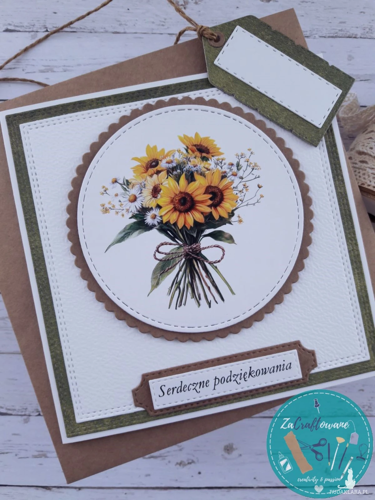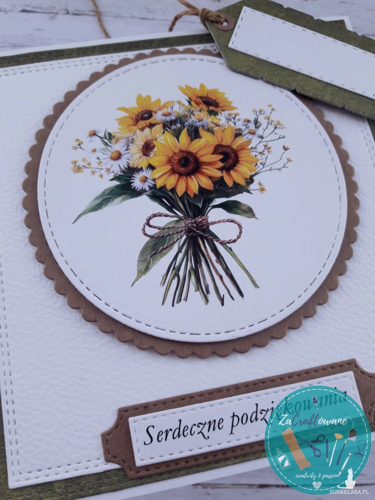 Życzenia dla nauczyciela (bądź na inną okazję) wypisane na tej unikatowej, ręcznie robionej kartce z bukietem pięknych słoneczników w towarzystwie polnych kwiatów, z pewnością sprawią ogromną radość pani nauczycielce lub innej osobie, którą nią obdarujesz.