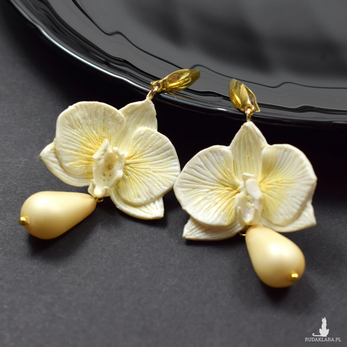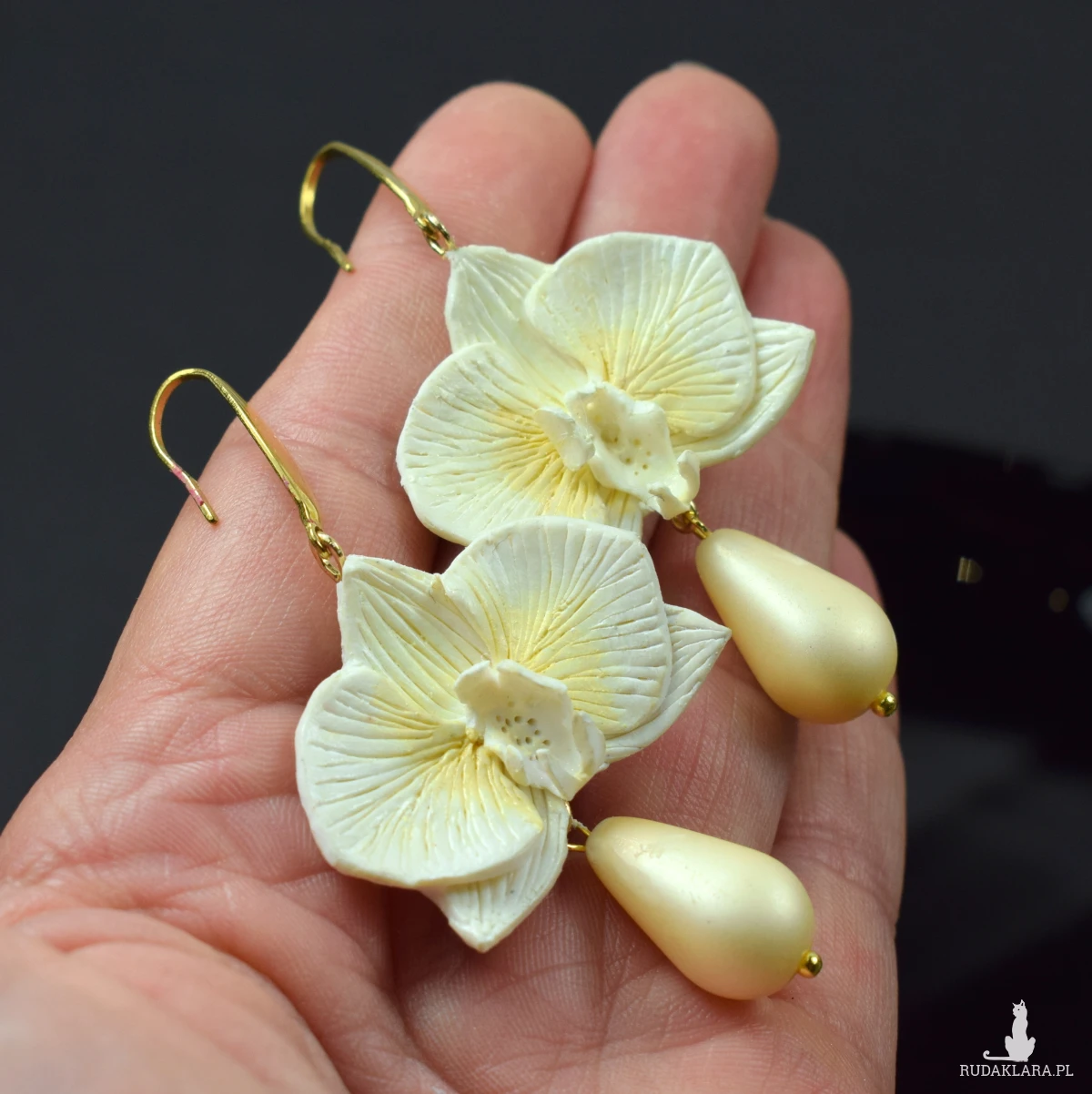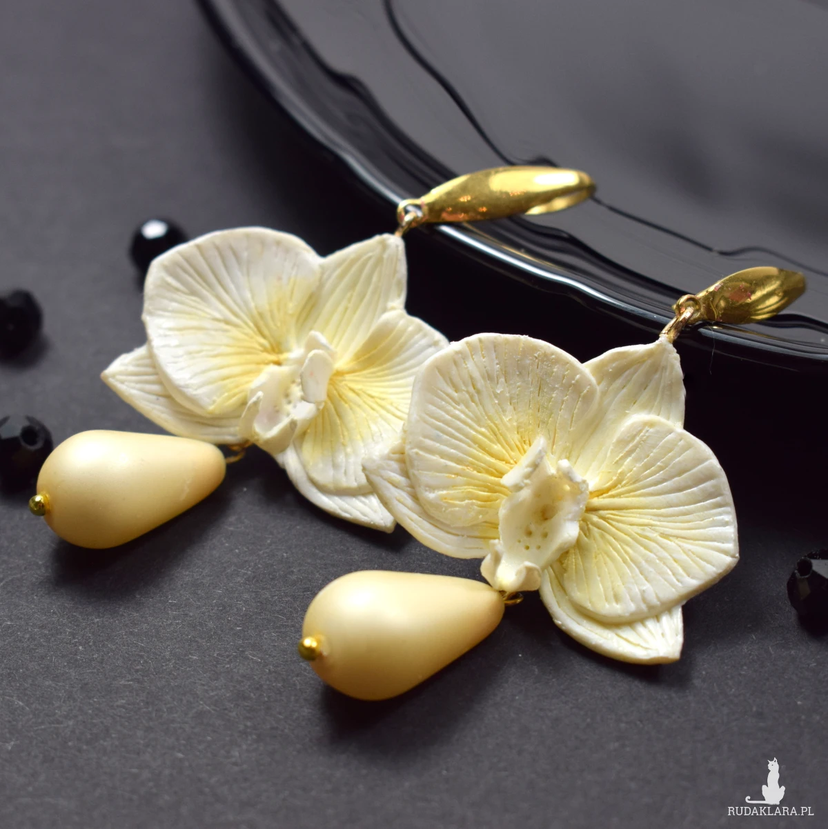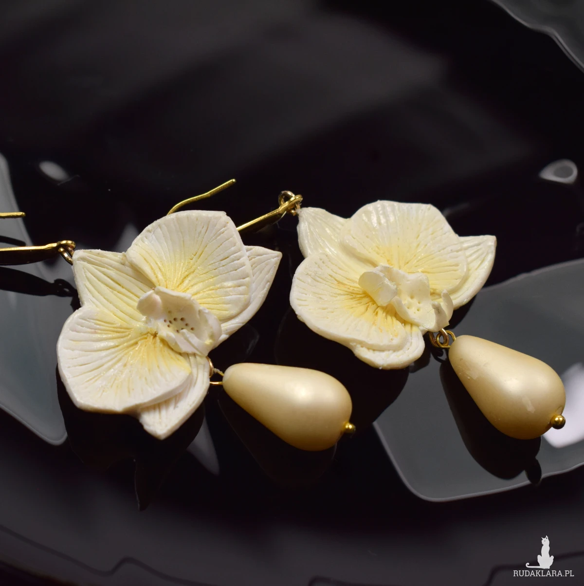 Eleganckie kolczyki z kwiatami orchidei, w kremowym odcieniu z dodatkiem