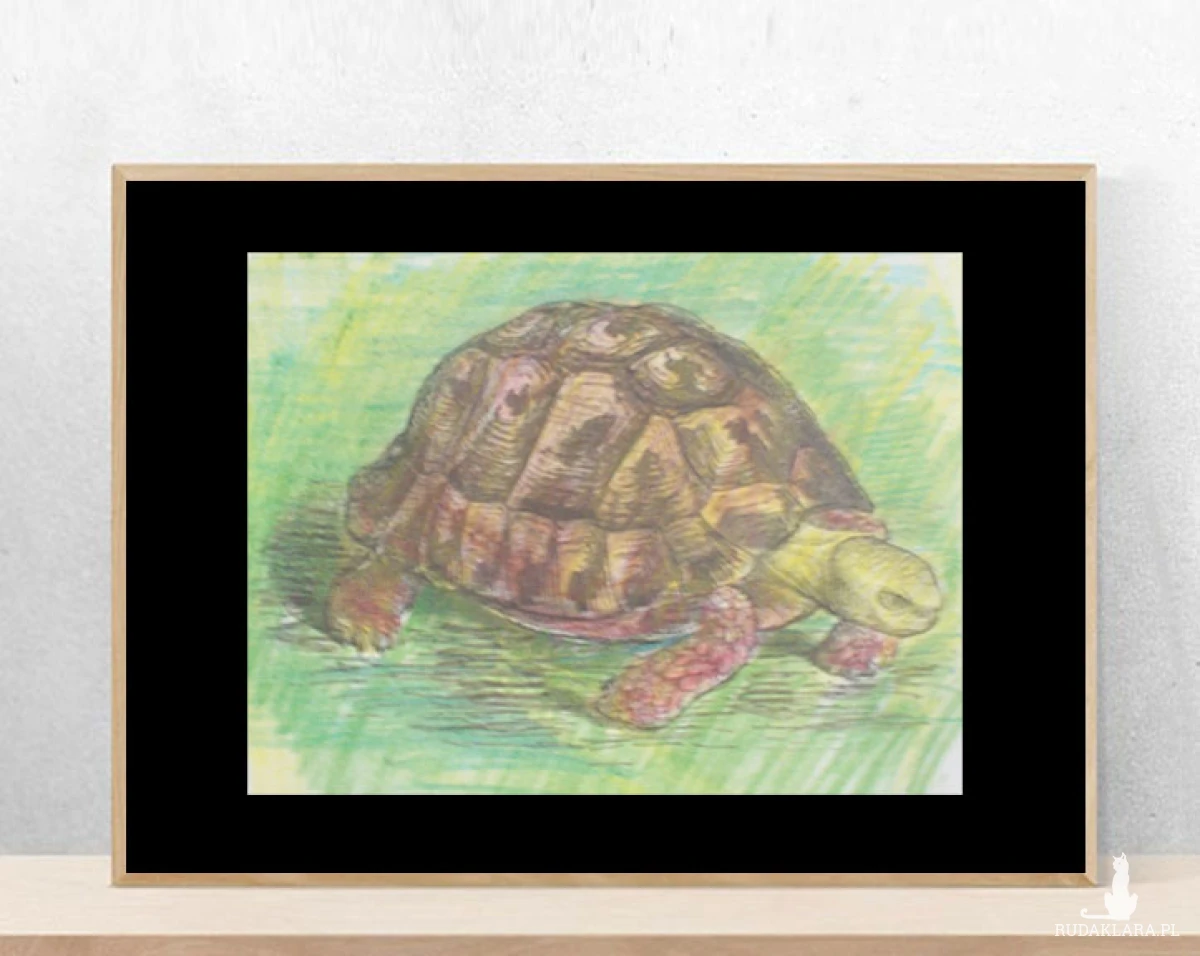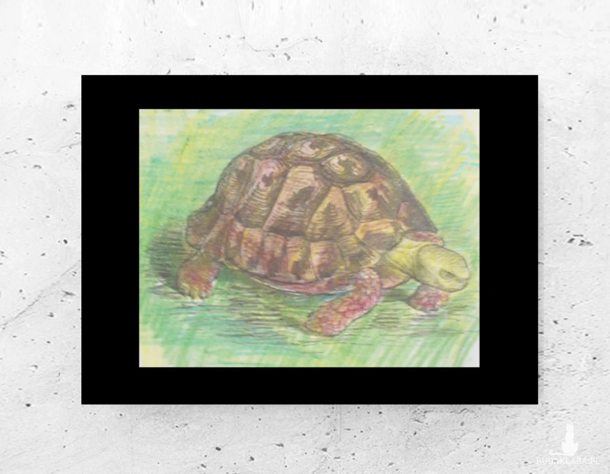 Nowy , kolorowy obrazek w stylu retro. Grafika z żółwiem na czarnym kartoniku 21 x 30 cm. Poster do samodzielnej oprawy. Plakat wystarczy tylko