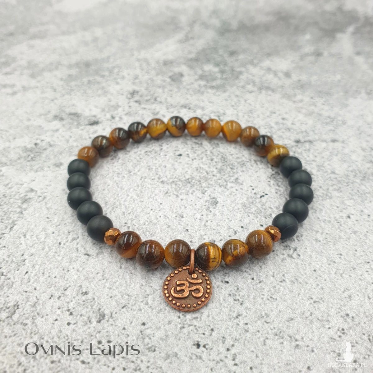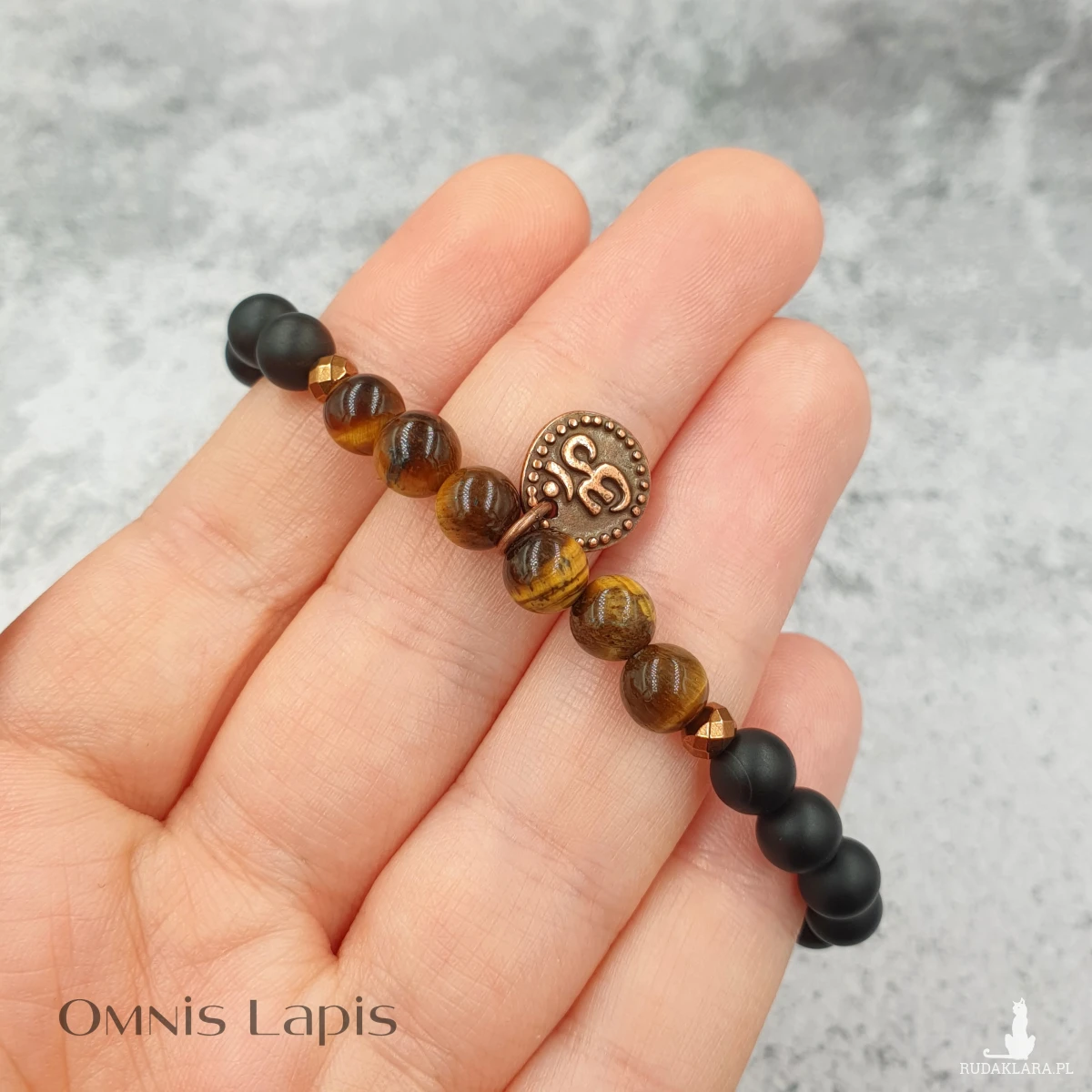 Odważny, magiczny tygrys, król zwierząt w zachodniej mitologii recytuje w prezentowanej bransoletce pradawną mantrę ''OM''- sylabę wszechmocy w hinduizmie.