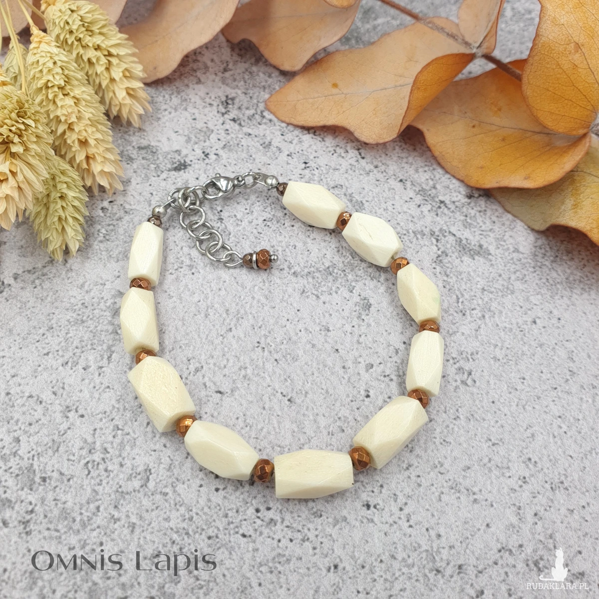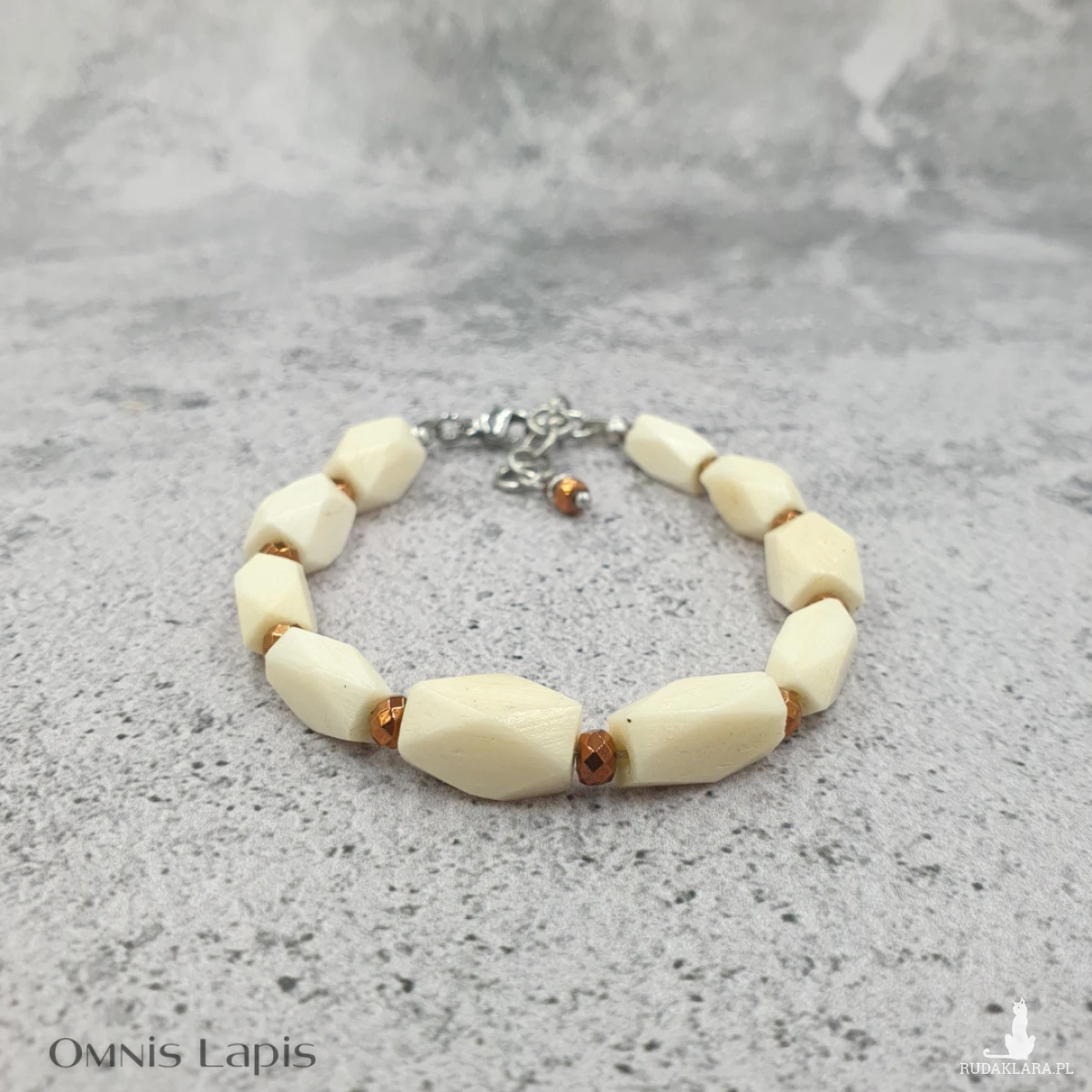 Główną ozdobę bransoletki stanowią przekładki z naturalnej kości bawolej, przedzielone drobnymi oponkami hematytu.