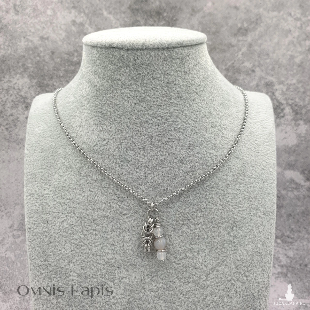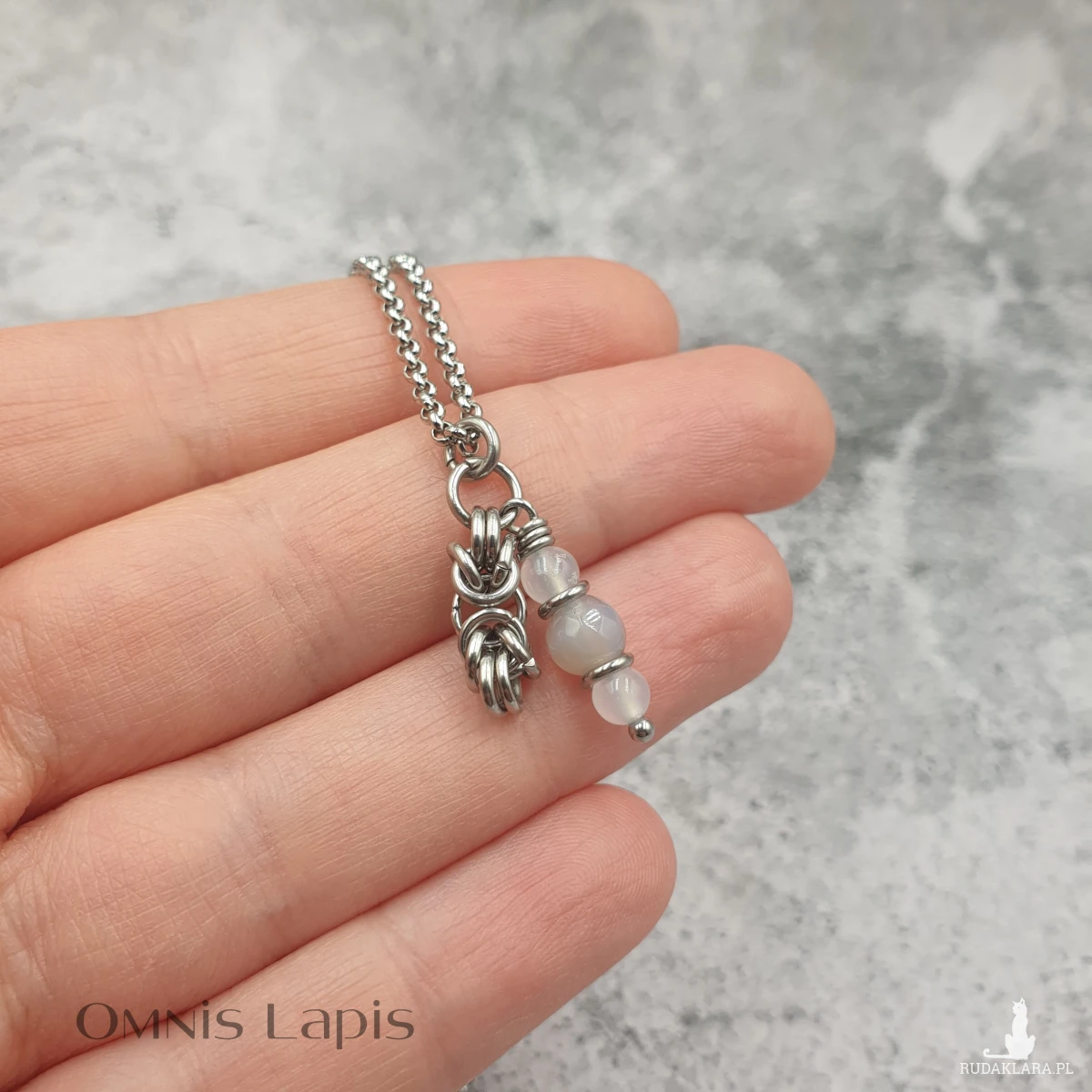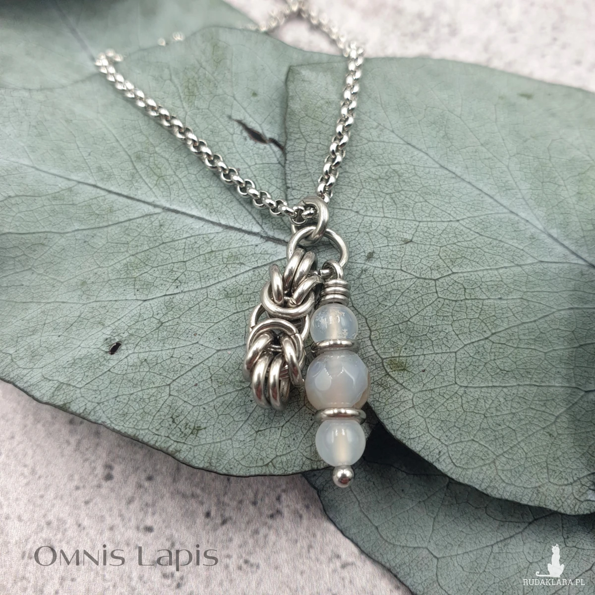 Prezentowany wisiorek wykonałam ze stali szlachetnej, ozdobiłam kulami szarego i białego agatu, zawiesiłam na łańcuszku typu rollo.