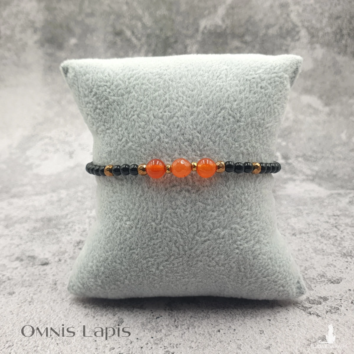 Bransoletka w wersji mini. Wykonana ze 100% stali szlachetnej. Wykonana z kul czarnego onyksu, przedzielonych przekładkami z hematytu. Centrum bransoletki stanowią trzy kule pomarańczowego jadeitu.