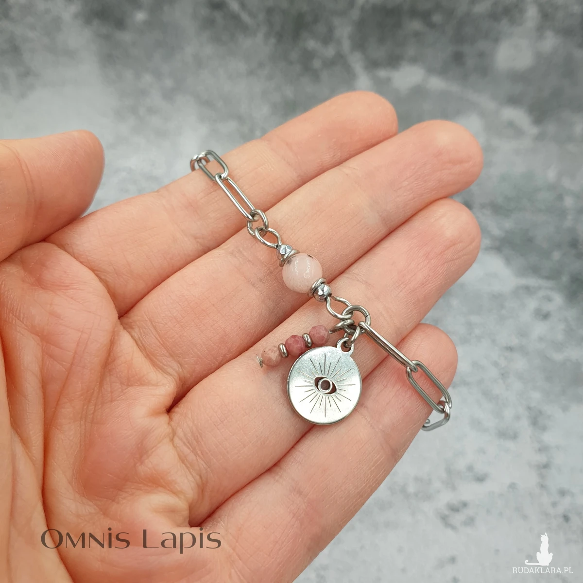 Oryginalna bransoletka z grubym, masywnym łańcuchem. Wykonana ze stali szlachetnej, ozdobiona opalowym jadeitem, hematytem oraz drobnymi kulkami rodochrozytu. Dodatkową ozdobę bransoletki stanowi stalowa zawieszka z motywem oka.