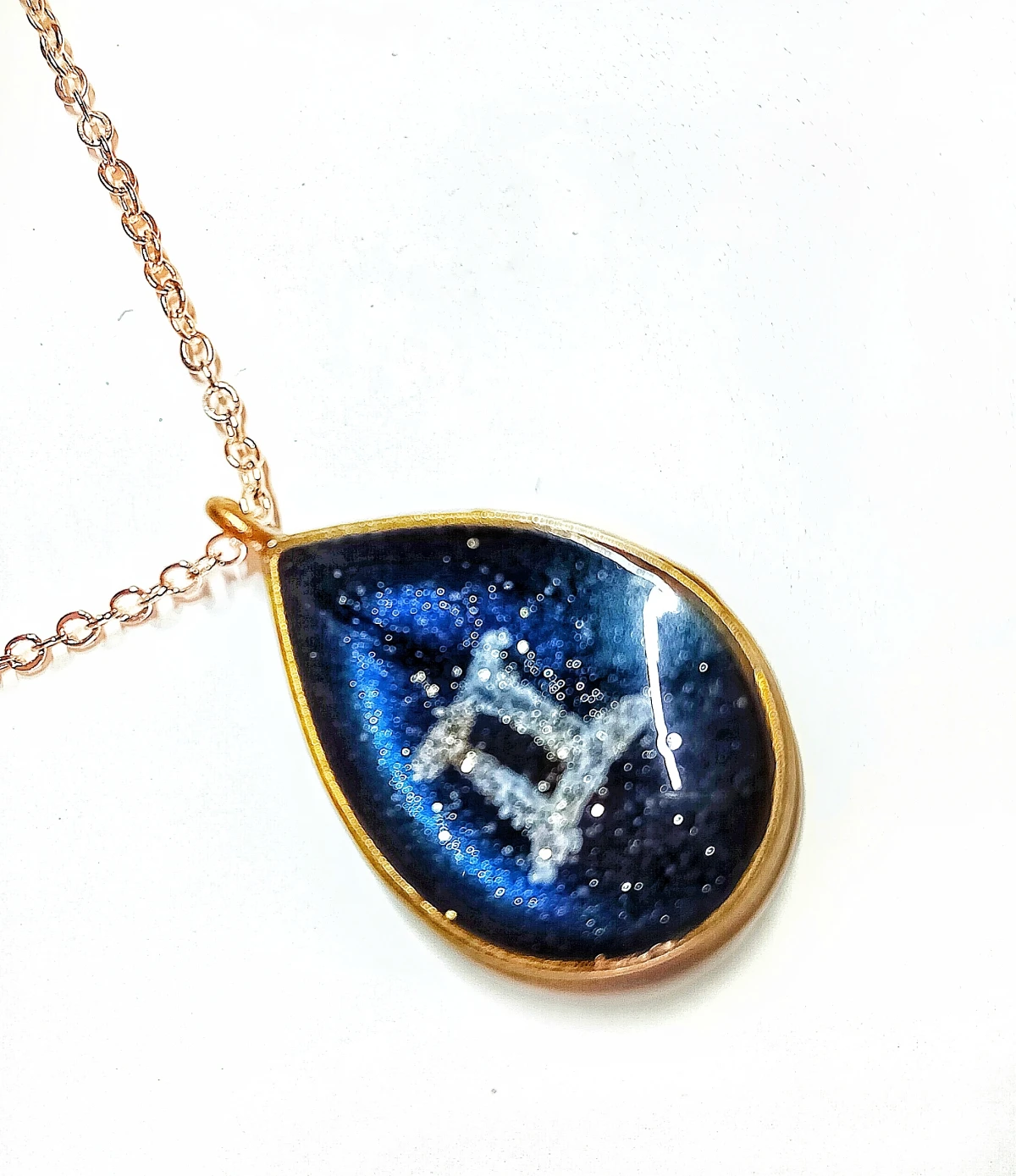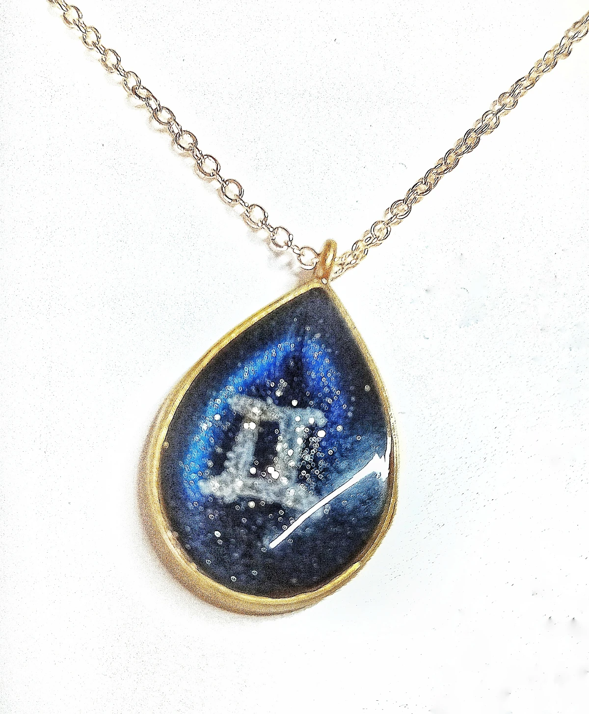 Podkreśl swoją zodiakalną naturę z wyjątkowym wisiorkiem przedstawiającym znak Bliźniąt! Ręcznie malowany na tle starego złota i wypełniony subtelnym blaskiem brokatu, stworzony z dbałością o każdy detal – to biżuteria, która zachwyca i wyróżnia.