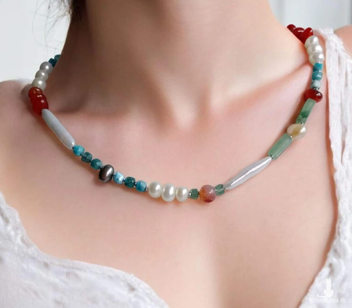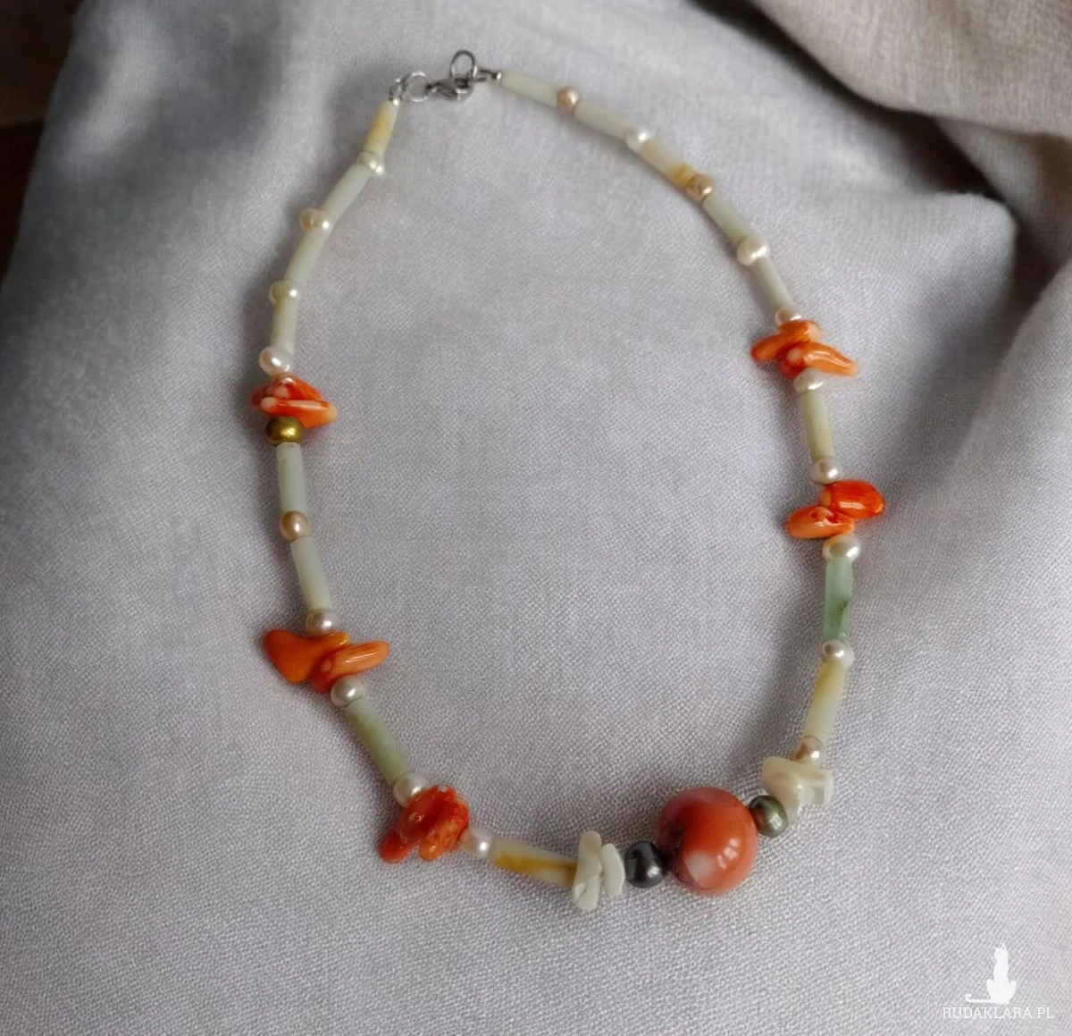 Naszyjnik wykonany z walców z awenturynu w rozmiarze 13 x 4 mm przełożonych perełkami słodkowodnymi oraz naturalnym koralowcem. W centralnej części umieszczona jest 15 mm kula z korala naturalnego. Elementy metalowe ze stali szlachetnej. Długość naszyjnika 43 cm, zapięcie na karabińczyk 10 mm. Idealna ozdona dekoltów do wiosenno - letnich stylizacji.