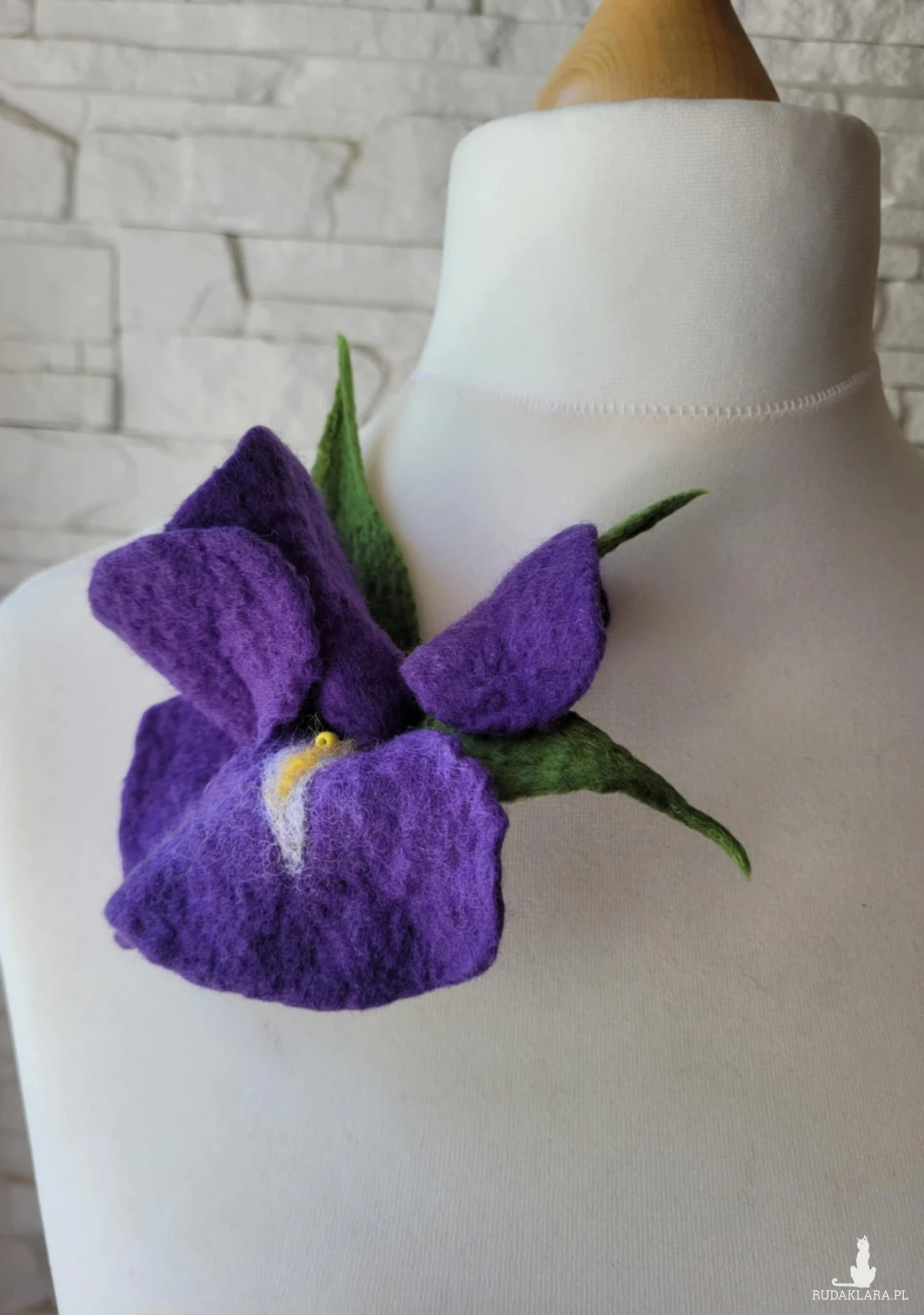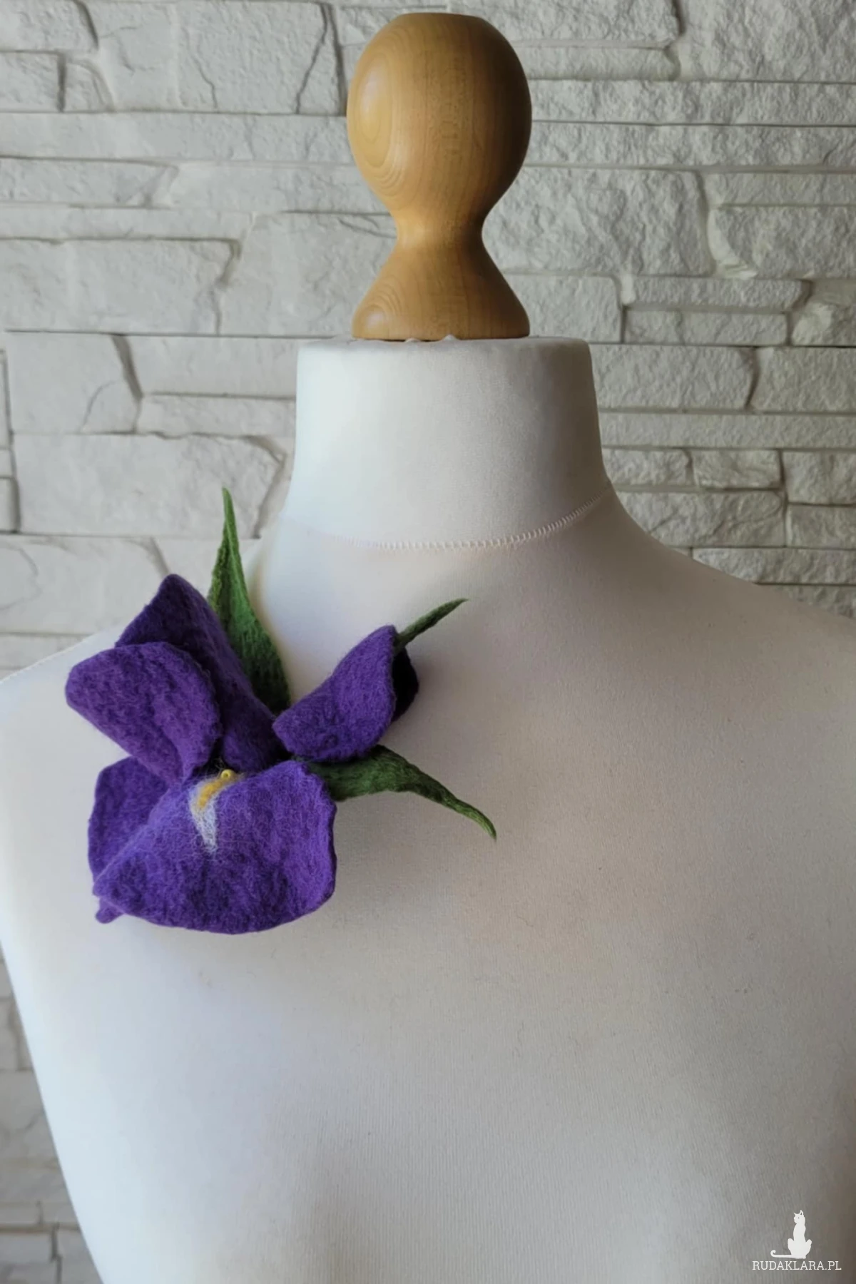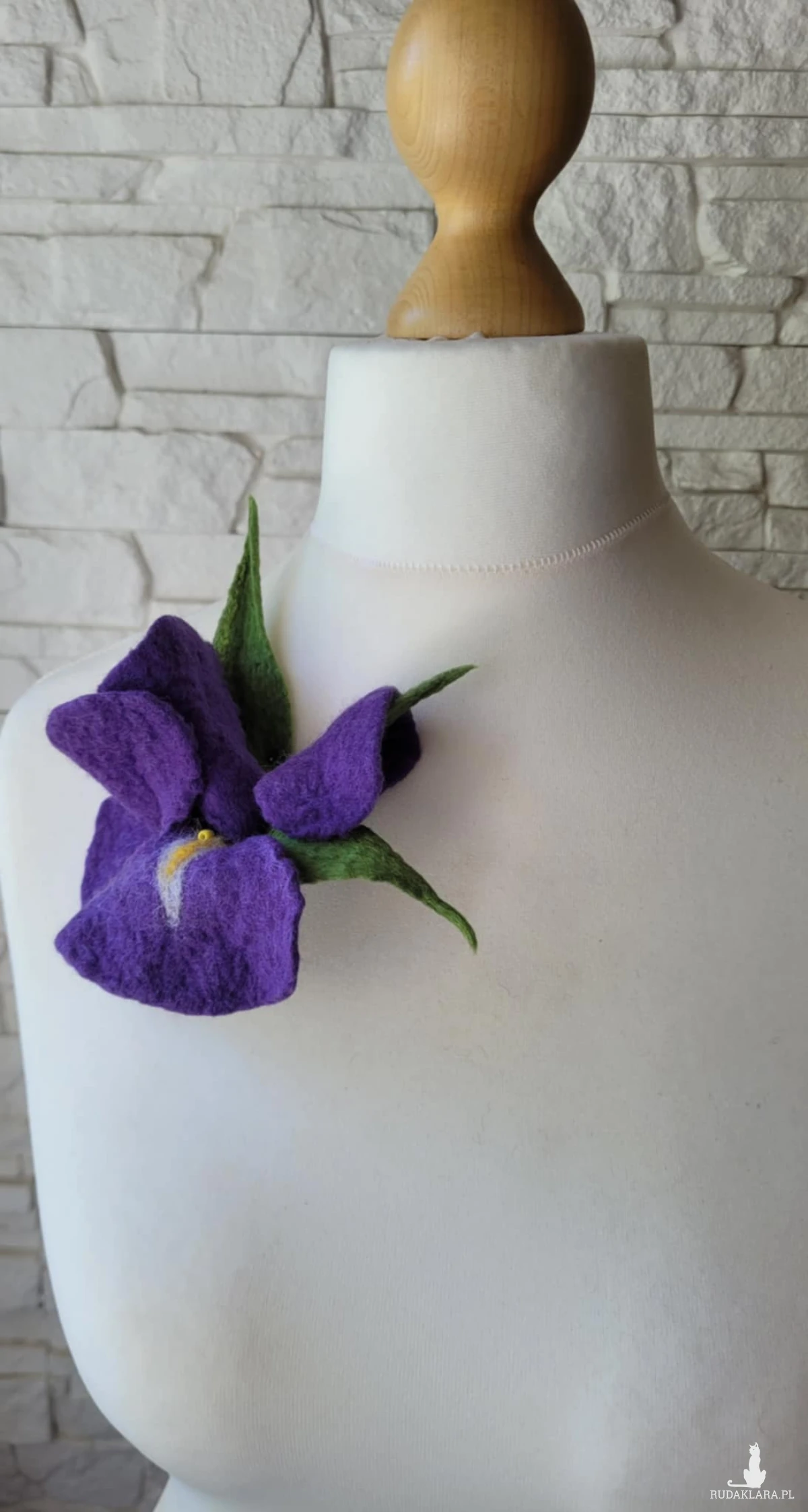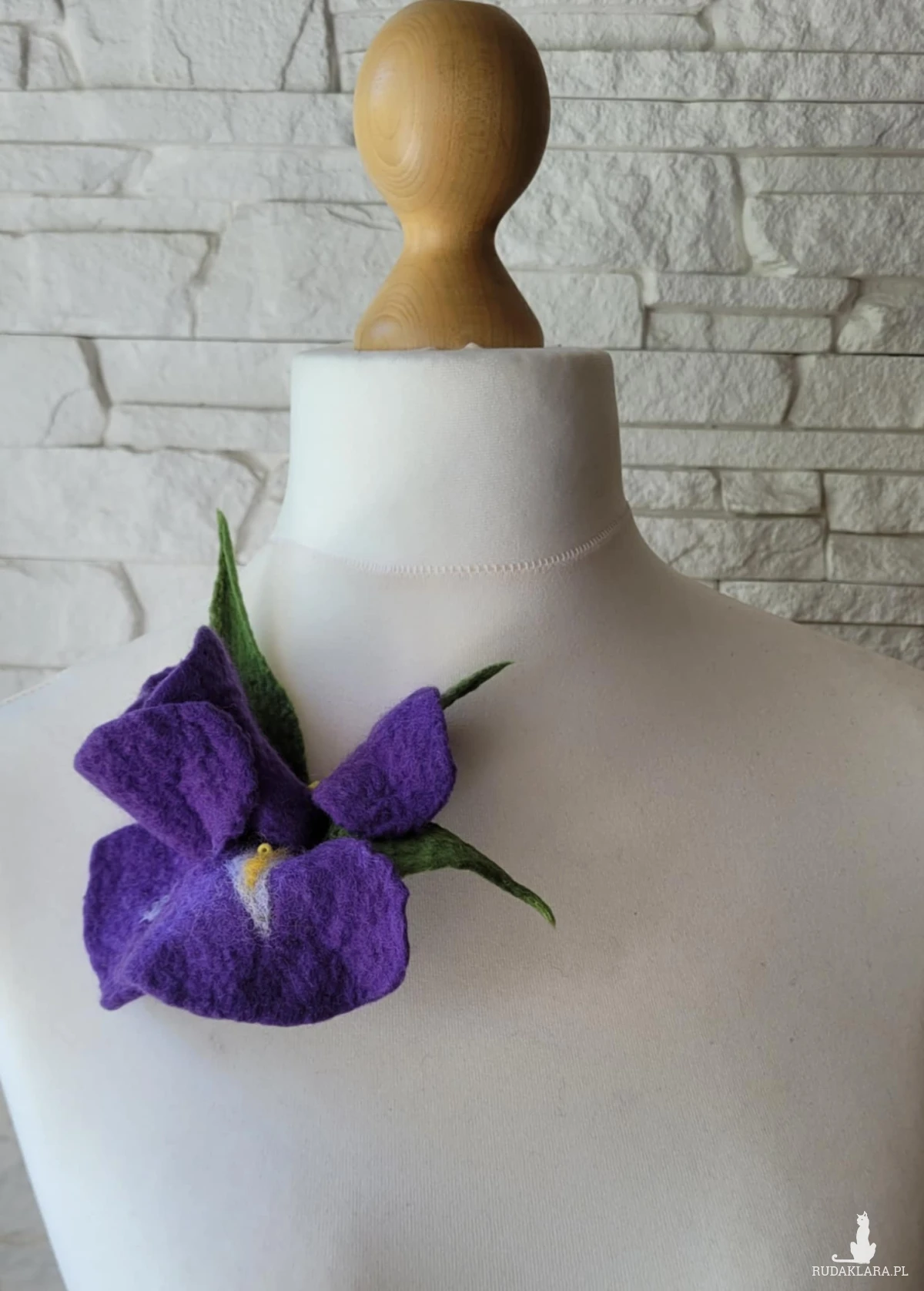 Broszka irys wykonana techniką filcowania na mokro z wełny merynsa australijskiego.
