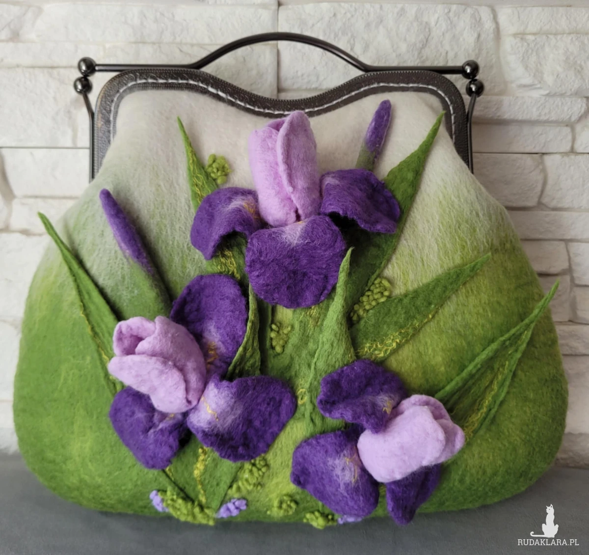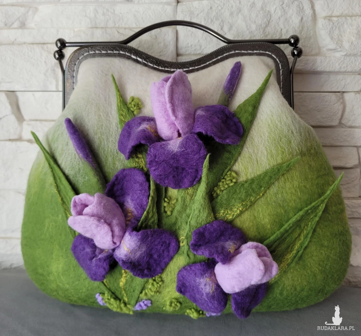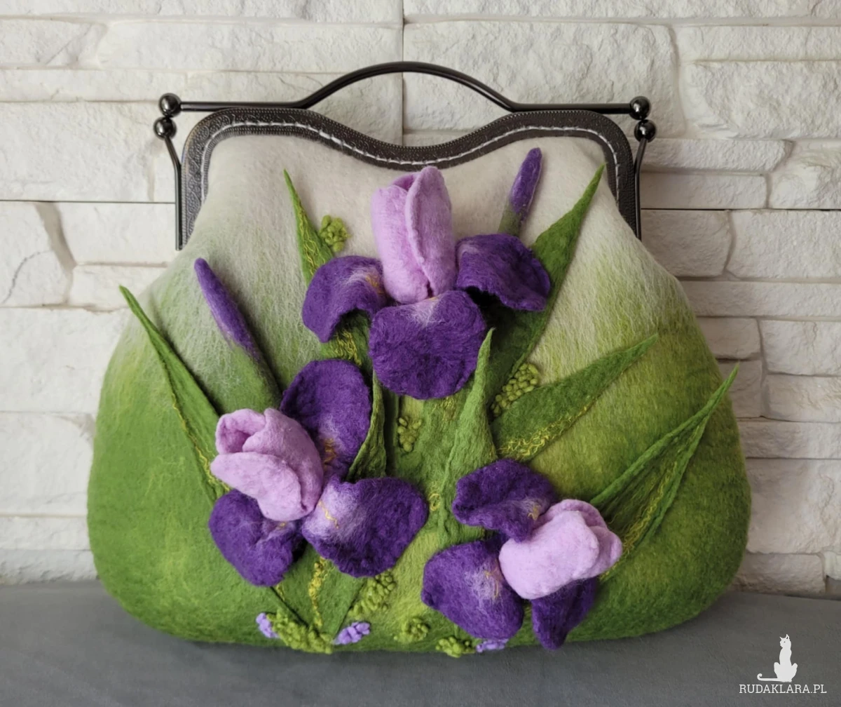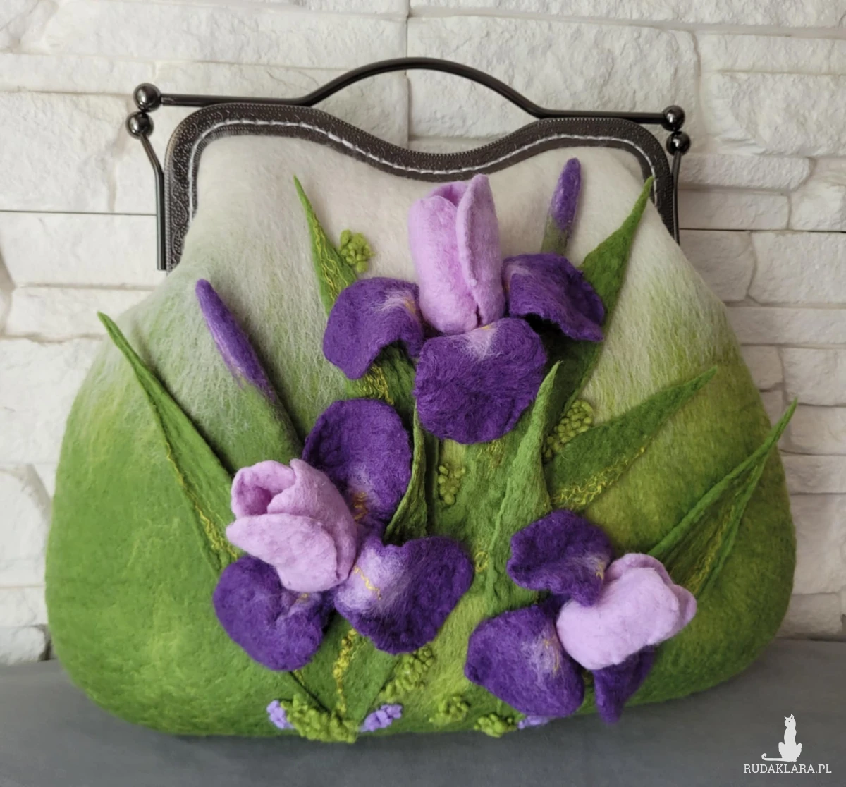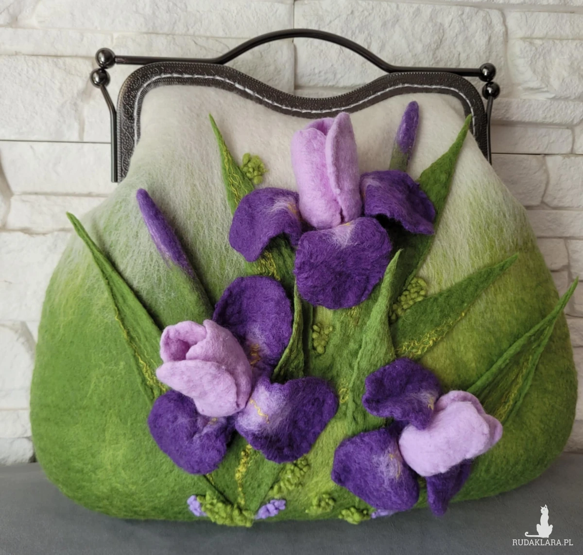 Wiosenna torebka z irysami filcowana na mokro z wełny merynosa australijskiego i nowozelandzkiego.