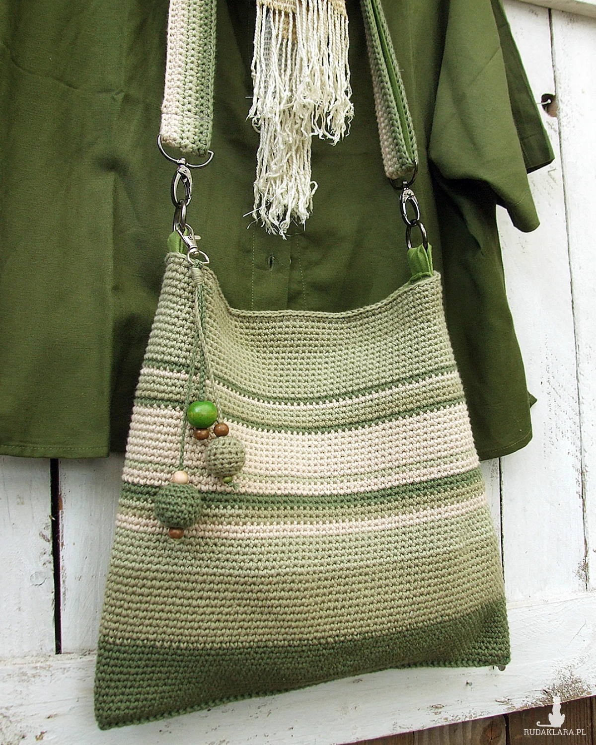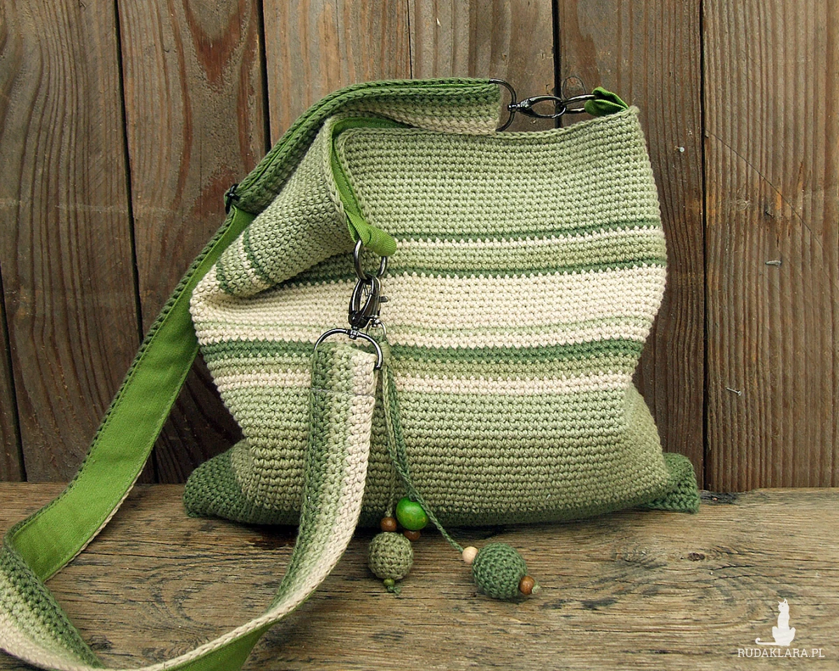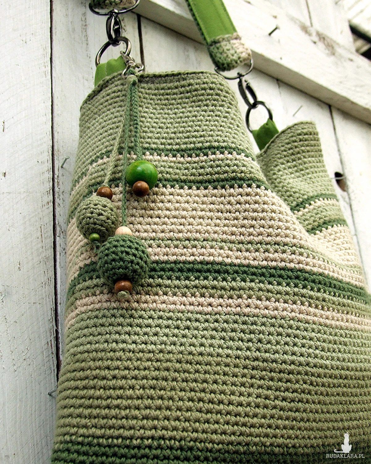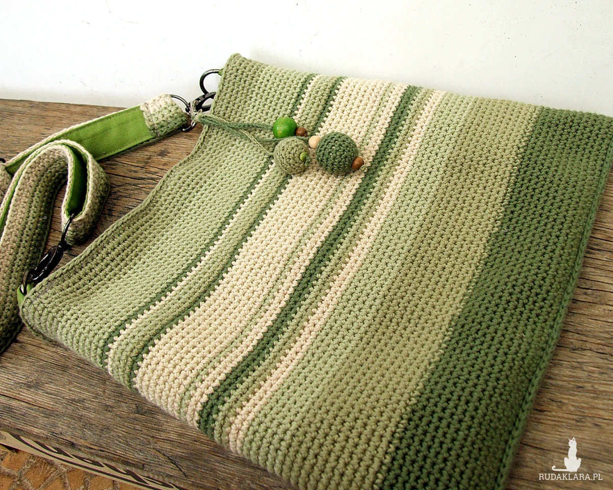 Odcienie pastelowej zieleni układają się w paski o różnej szerokości. Dodatkowo torebka ma przyczepiony ręcznie wykonany brelok, do jego wykonania użyłam drewnianych koralików.