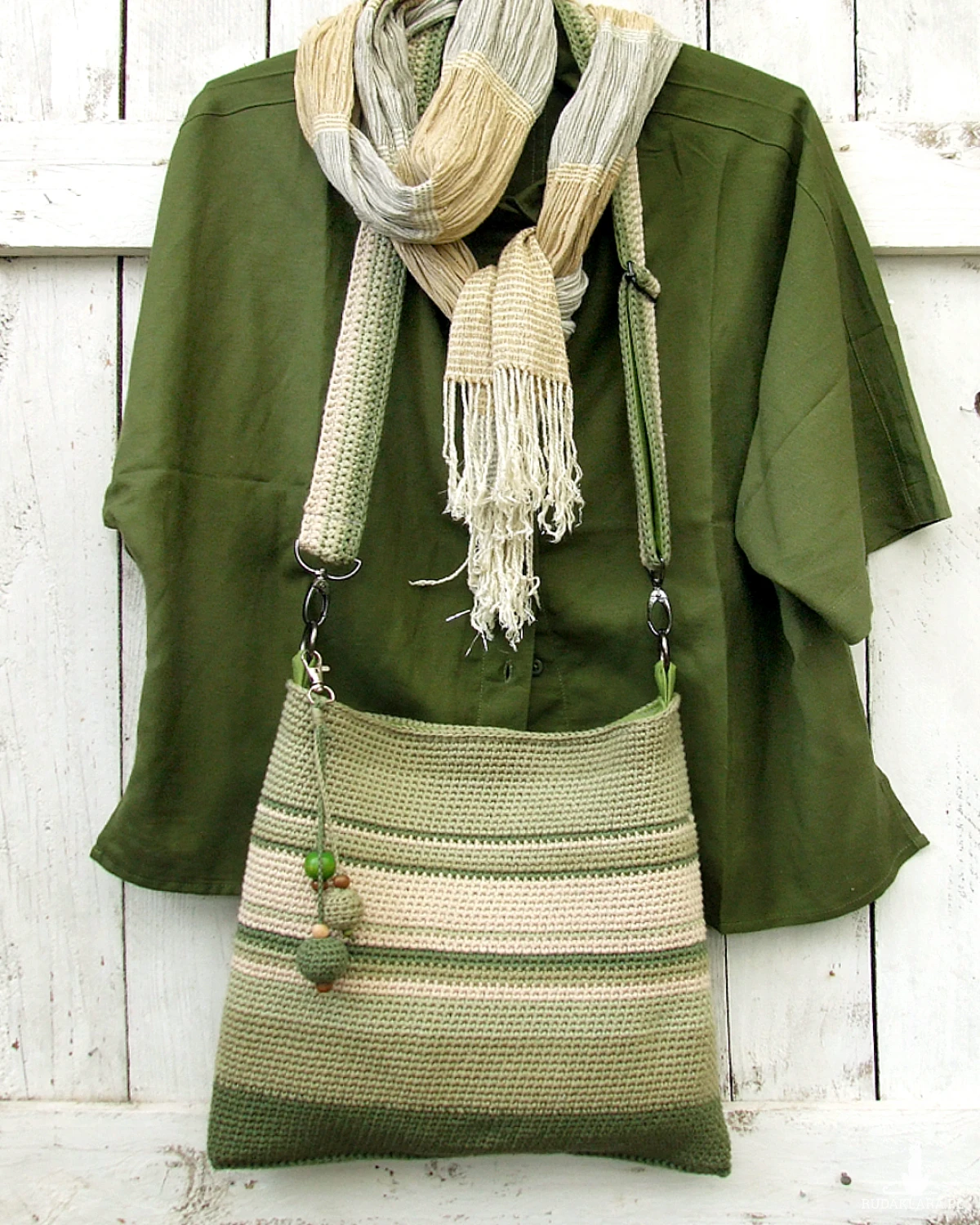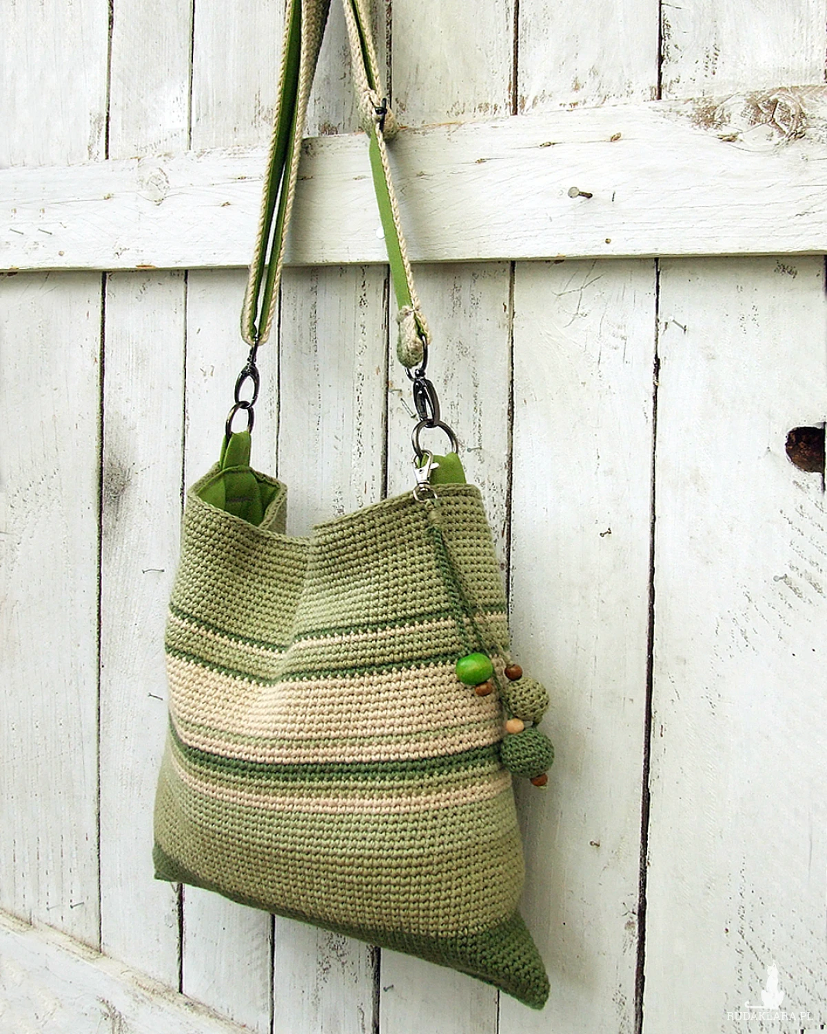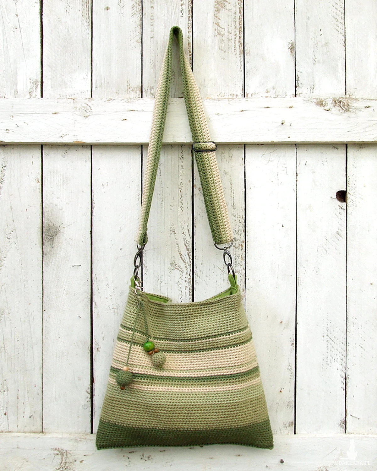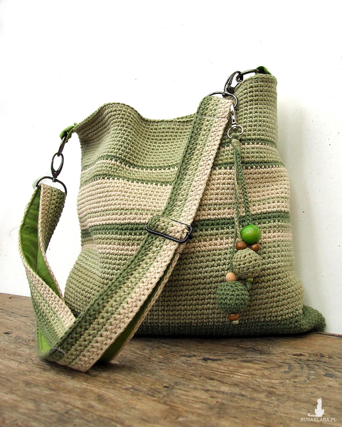 Odcienie pastelowej zieleni układają się w paski o różnej szerokości. Dodatkowo torebka ma przyczepiony ręcznie wykonany brelok, do jego wykonania użyłam drewnianych koralików.