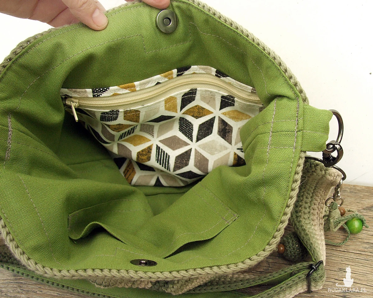 Torebka nie jest usztywniona, bez wypełnienia/zawartości jest płaska. Zapinana na zapięcie magnetyczne. Środek torebki wykończony podszewką w zielonym groszkowym kolorze, z dwiema kieszonkami, w tym jedną zapinaną na zamek błyskawiczny.