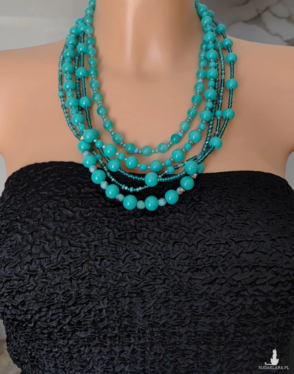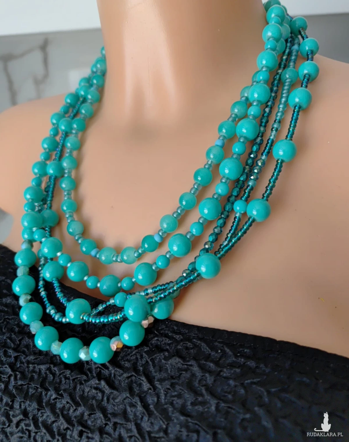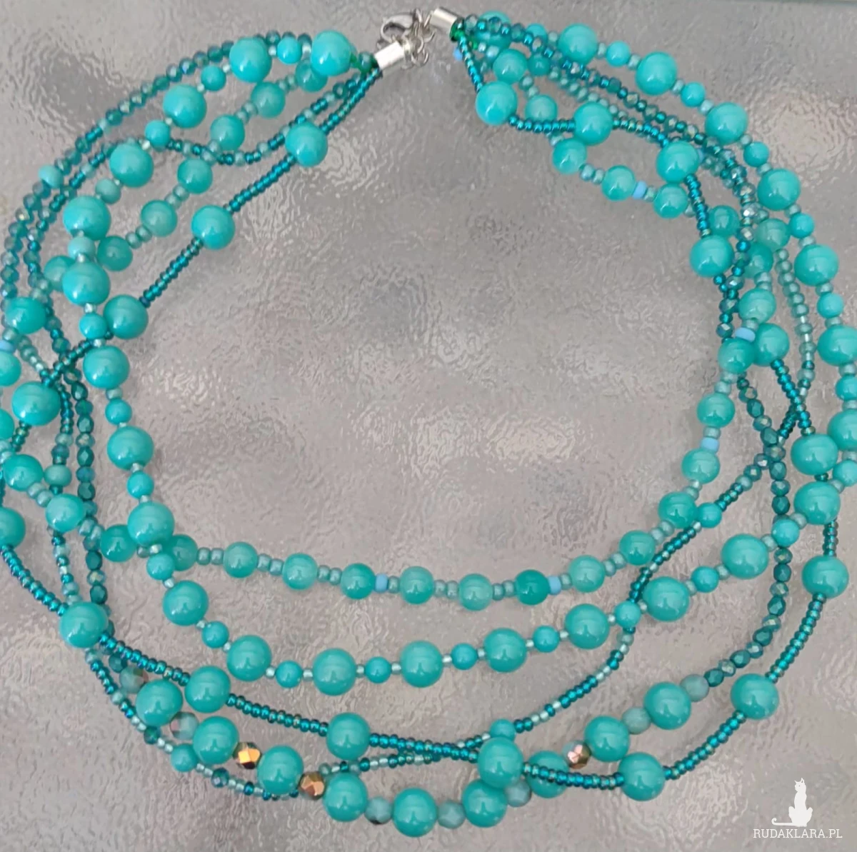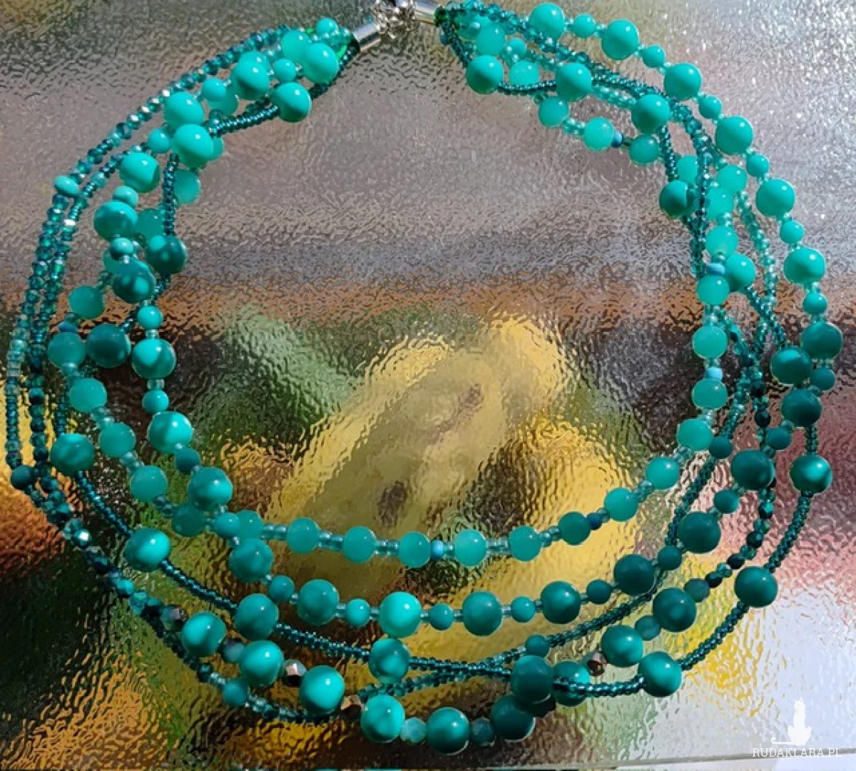 Naszyjnik składa sie z pięciu sznurków koralików różnych. Kulki w kolorze turkusowym wielkości 10 mm to największe koraliki w tym naszyjniku. Inne mniejsze to kryształki szklane szlifowane i piękne szmaragdowe fire polish czeskie koraliki szklane, okrągłe malutkie 3 mm koraliki preciosa. Końcówki metalowe i zapięcie ze stali nierdzewnej. Objętość naszyjnika max 51 cm, można zapiąć krócej o 2 cm, efektowna kolorowa biżuteria na każdą okazję.