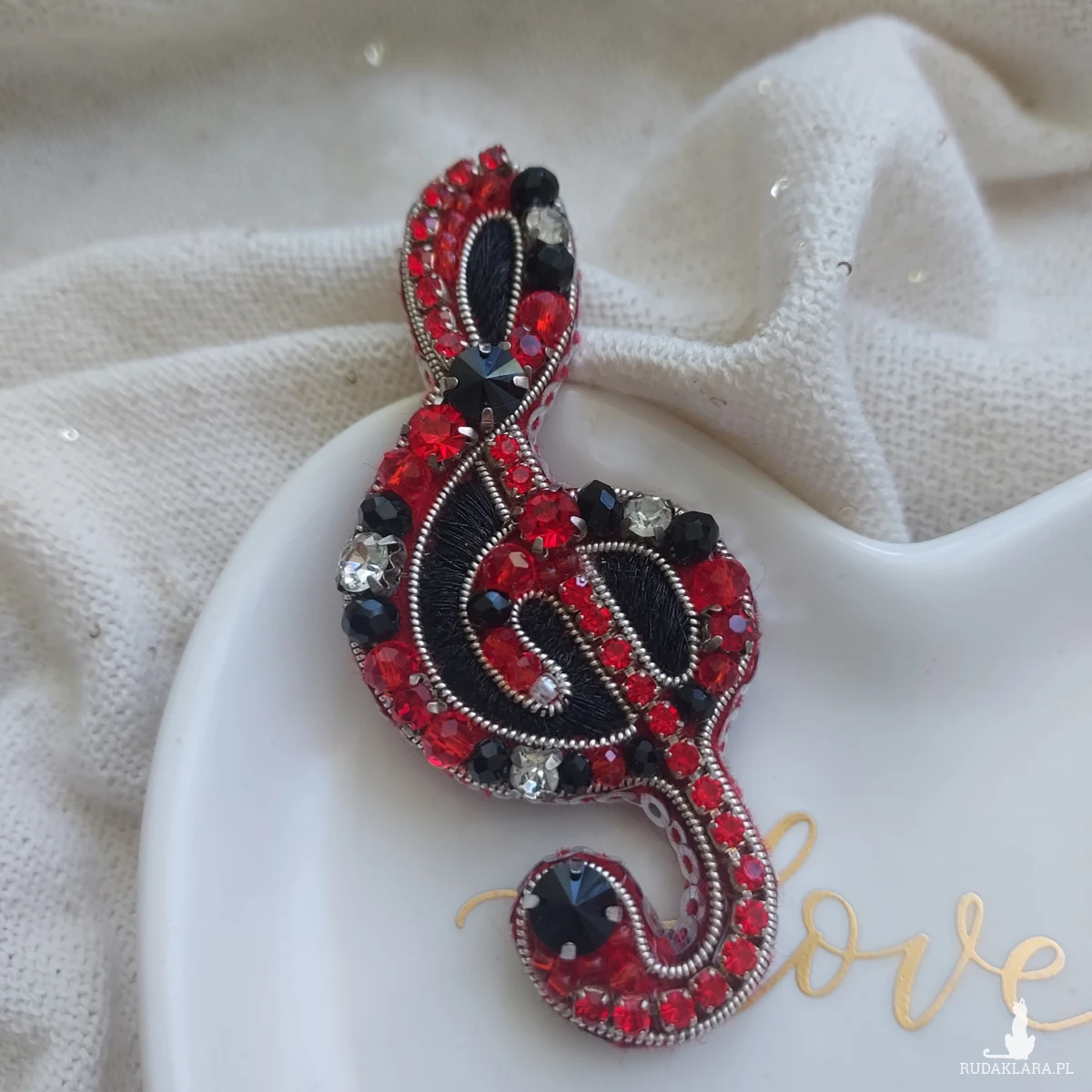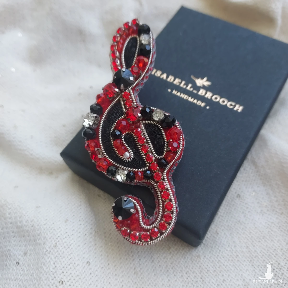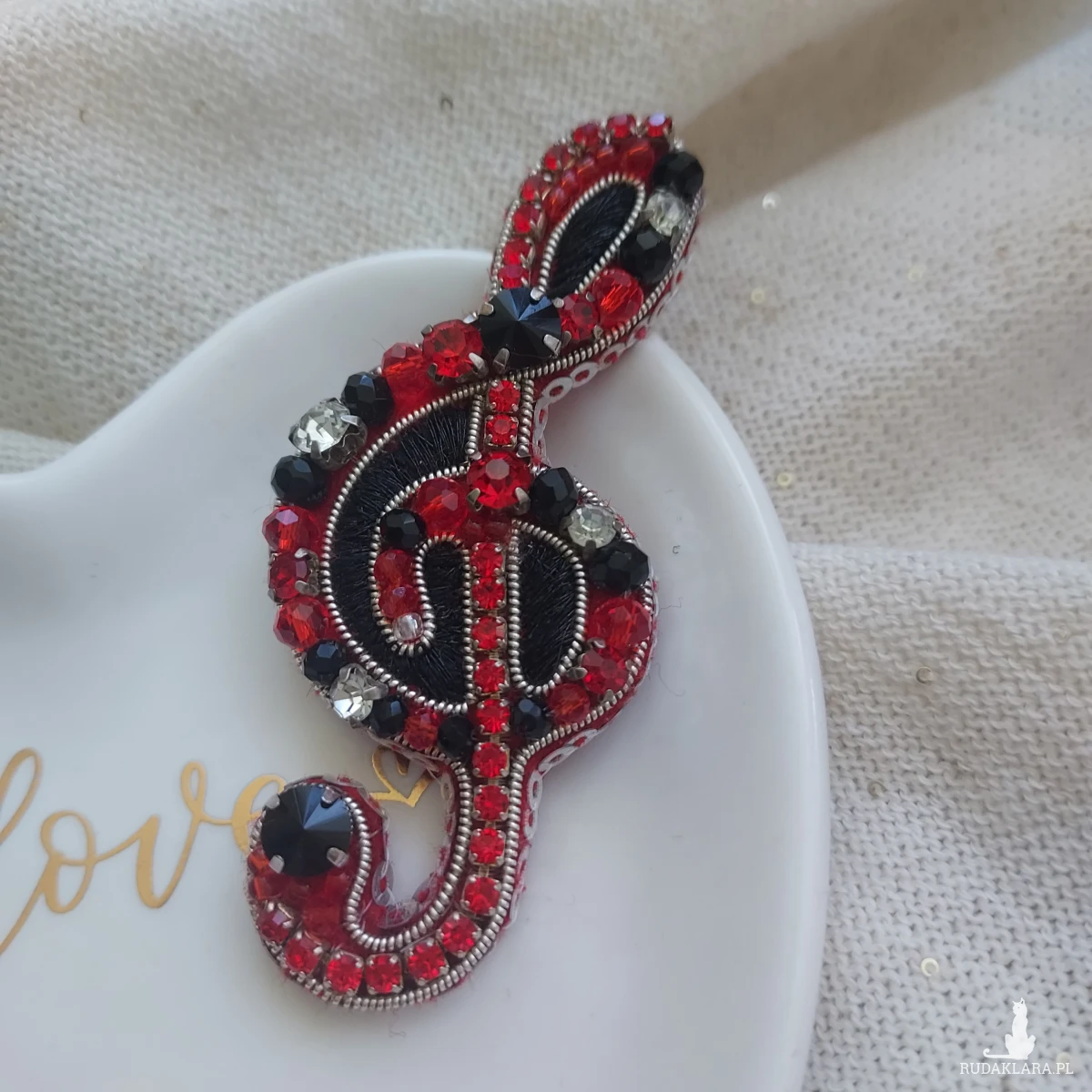 Broszka klucz wiolinowy w kolorze czerwono-czarnym dla miłośników muzyki, ale nie tylko!