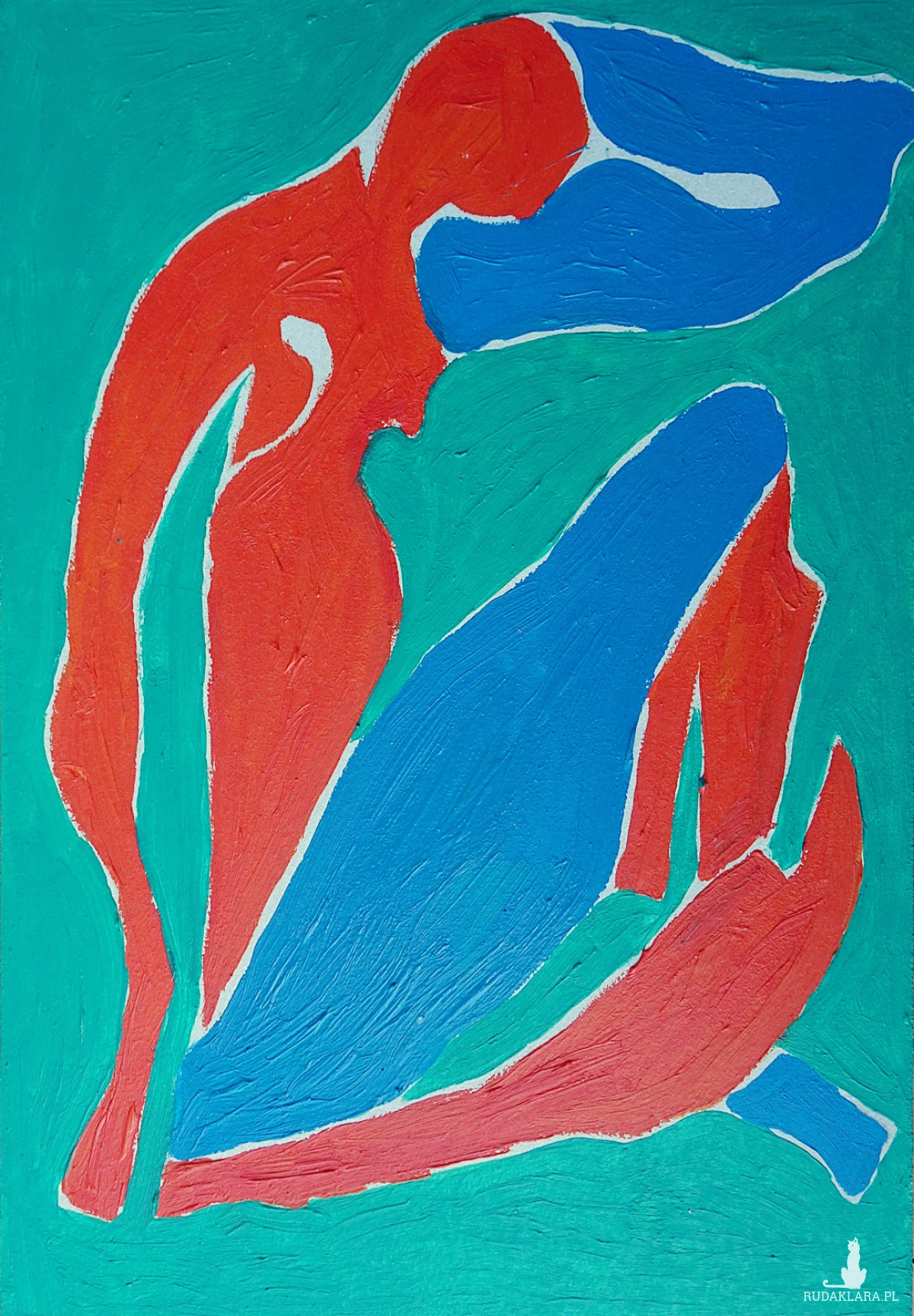 Na obrazie dominują jaskrawe kolory: głęboki czerwony w kontraście z niebieskim i zielonym tłem. Kształty są abstrakcyjne, ale coś tam sugeruje postać człowieka. Kompozycja jest dynamiczna. Linie są płynne, a krawędzie wyraźne. Atmosfera przypomina mi letnie słońce, pełna energii, ale też tajemnicy. Artysta użył techniki impasto, co widać w grubych warstwach farby i teksturze. Styl nawiązuje do ekspresjonizmu, gdzie forma ustępuje emocji. Obraz może wywoływać poczucie ruchu i siły. Może też powodować trochę zastanowienia. Czy to radość, czy może smutek? Patrząc na to, chciałoby się krzyknąć: Wow! Jakie to niesamowite! to wygląda jak wielka plama! Prace takie jak ta pozwalają nam na chwilę oderwać się od codzienności i zanurzyć się w świat koloru. To takie "awesome", jakby powiedzieli Anglicy. Patrząc na to, czuję, jakby energia wprost z obrazu przepływała do mnie.