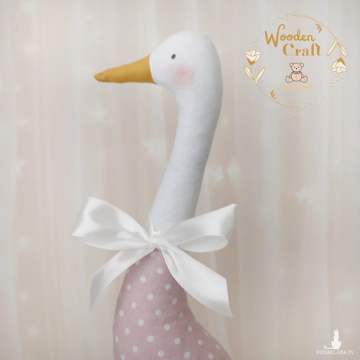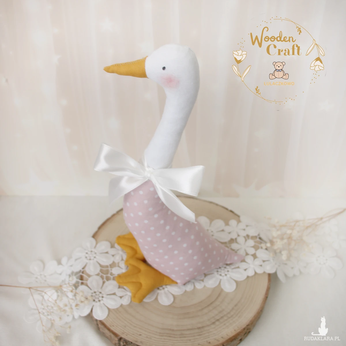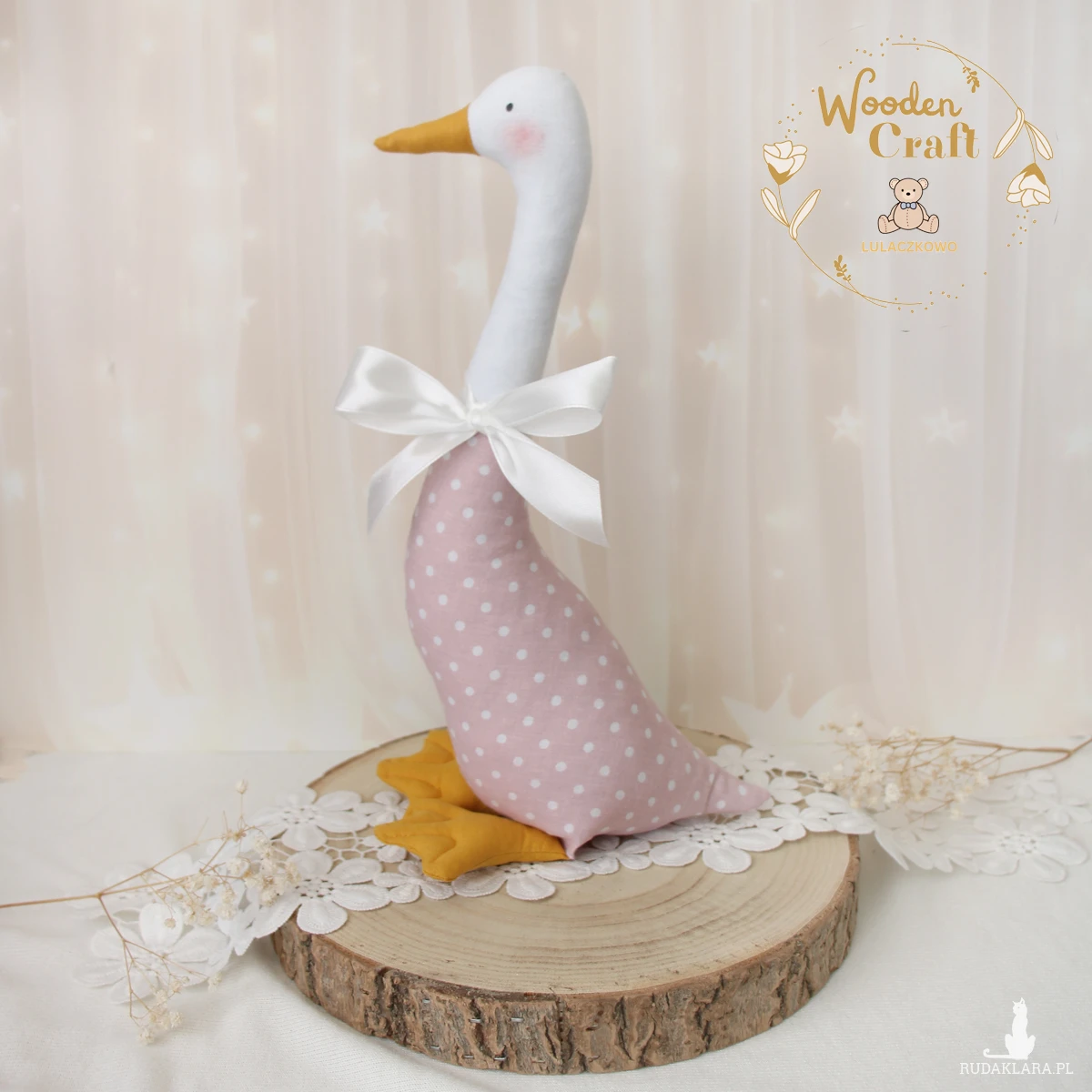 Urocza ręcznie szyta gąska w tylu Tilda, w kolorze róż w białe groszki, z musztardowym dziobkiem i łapkami oraz kokardą w kolorze ecru. Gąska uszyta ze 100% bawełny, wypełniona antyalergiczną kulką silikonową, oczka malowane wodoodpornym markerem, ozdobiona dużą atłasową kokardą. Gąska może swobodnie stać na półce.