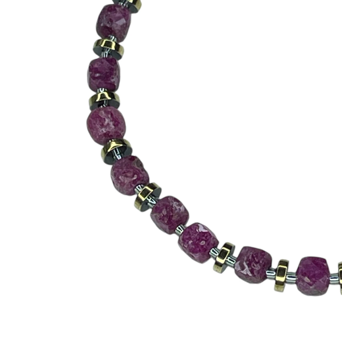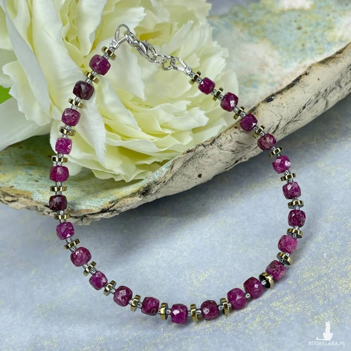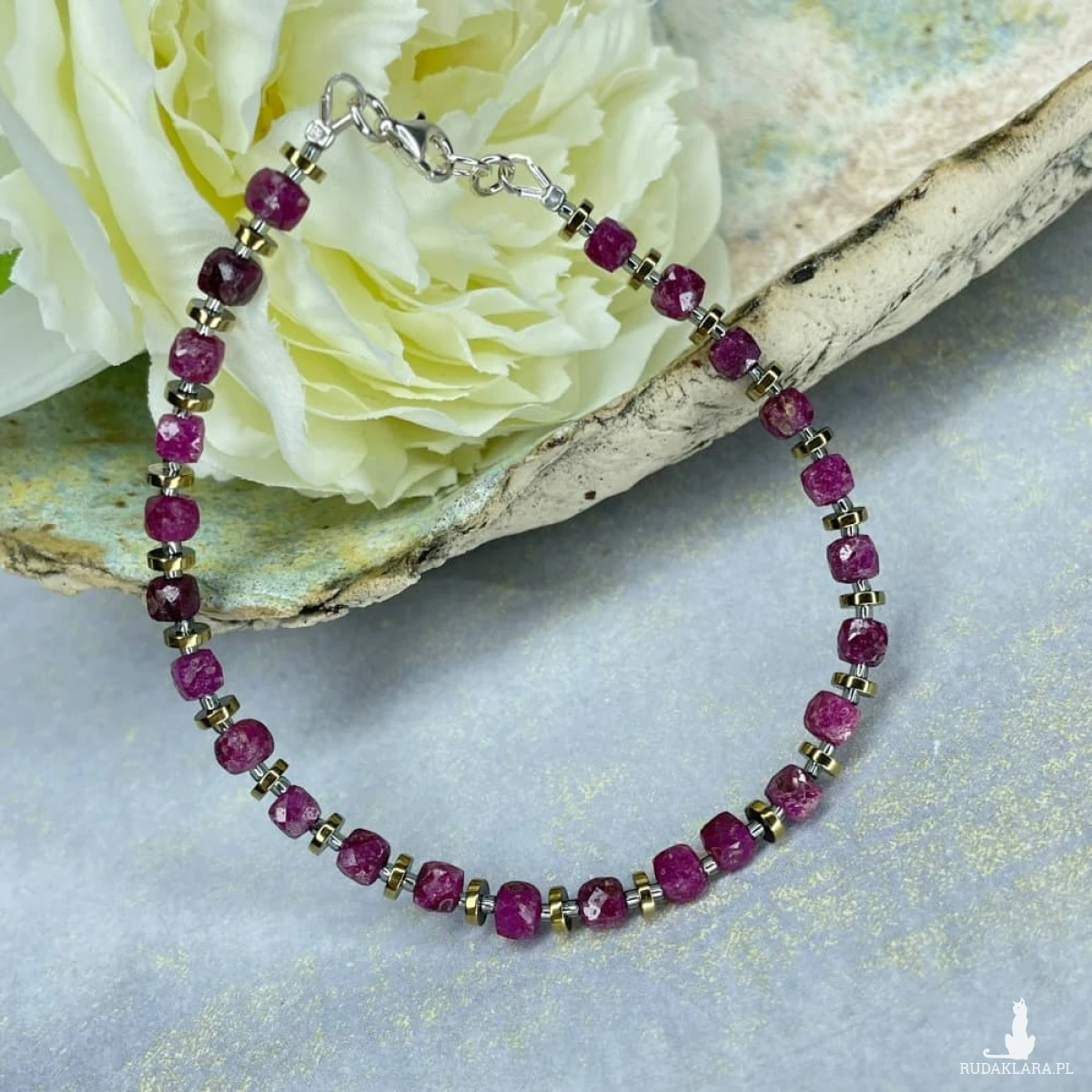 Srebrna bransoletka z rubinami to elegancka propozycja dla osób ceniących ponadczasowy urok kamieni szlachetnych w klasycznej formie. Rubin, od wieków symbolizujący miłość i pasję, przyciąga uwagę głęboką barwą, która pięknie kontrastuje z jasnym srebrem. Całość uzupełniają subtelne akcenty hematytu i drobnych koralików Toho, tworząc harmonijną kompozycję idealną zarówno na co dzień, jak i na wyjątkowe okazje.