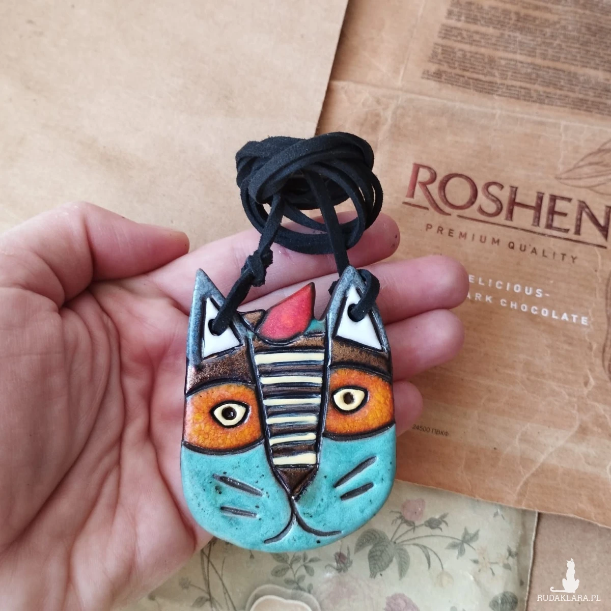 Wisior ceramiczny wykonany z gliny szamotowej, wypalony na biskwit i szkliwiony w temperaturze 1260 stopni C. Kot o wymiarach ok 5, 5 x 6 cm. Serdecznie polecam wszystkim Paniom poszukującym nietuzinkowej biżuterii lub jako miły upominek.