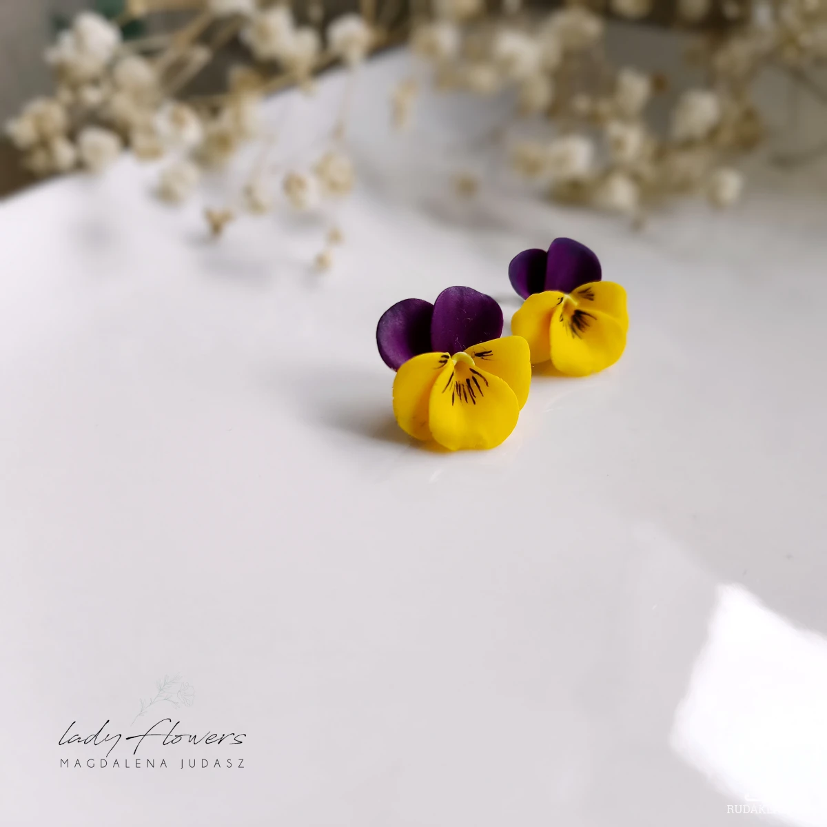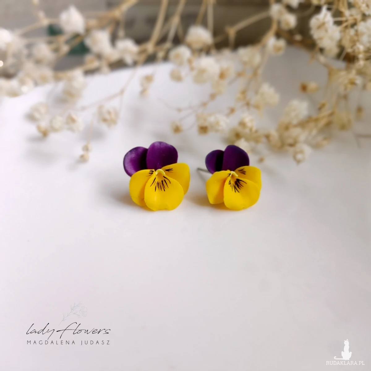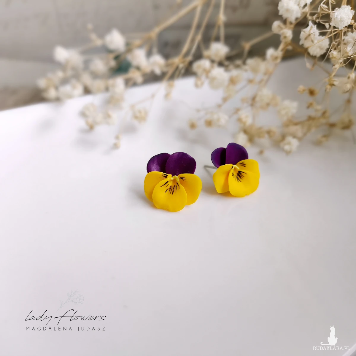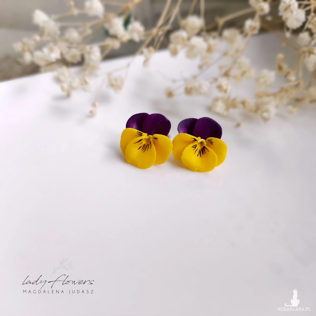 Kolczyki z bratkami ręcznie wykonane z profesjonalnej masy termoutwardzalnej marki Fimo.