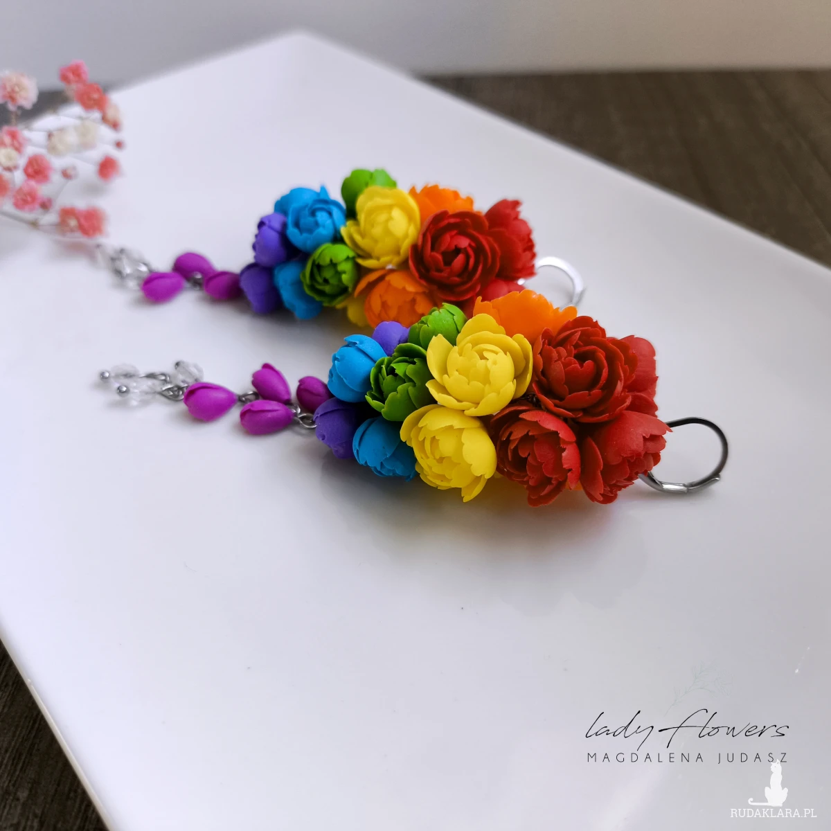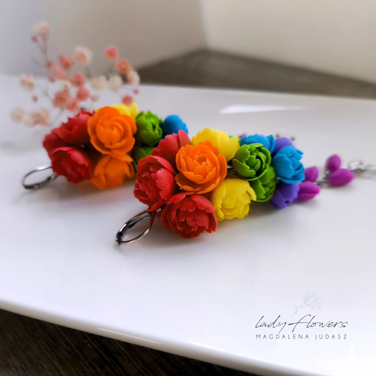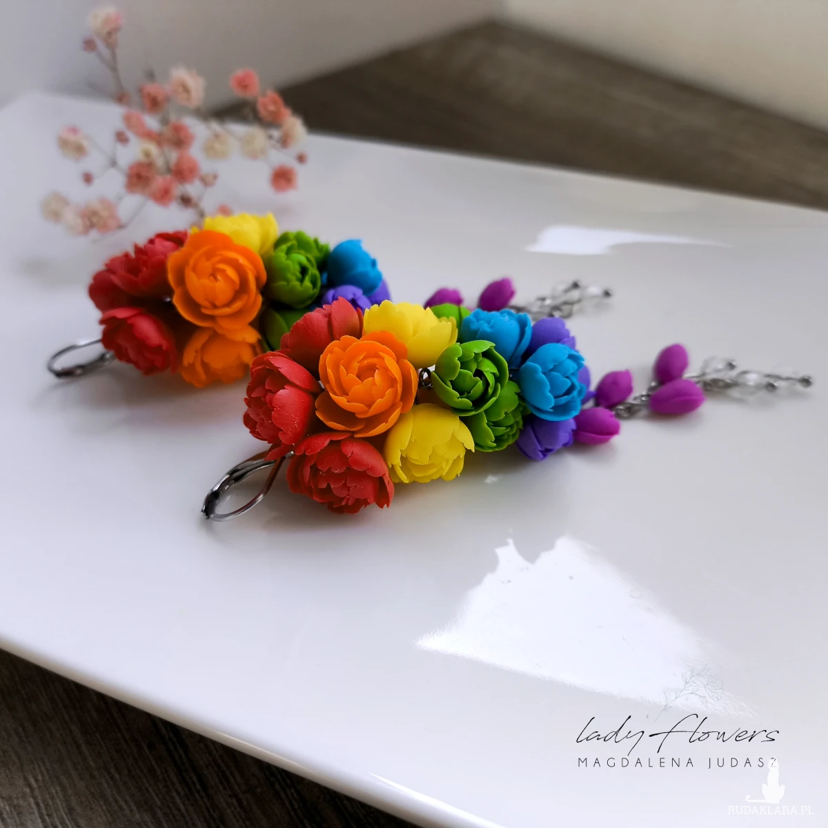 Kolczyki z kolorowymi kwiatami wykonane z dbałością o każdy szczegół z profesjonalnej masy termoutwardzalnej marki Fimo.